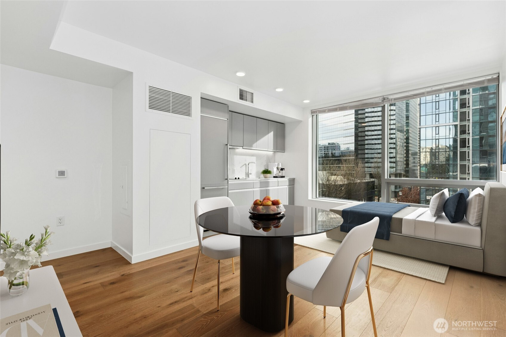 Live at the center of it all in this bright, modern studio at The Nexus, featuring breathtaking 180° views of downtown Seattle and abundant natural light from a large picture window. The smart, stylish layout offers an in-unit washer/dryer, spa-inspired bath with rain shower, and a spacious walk-in closet. Pet-friendly living with a private dog run and wash station. Enjoy three floors of resort-style amenities, rooftop Sky Club, concierge, fitness center, lounges, and entertainment spaces—just steps from dining, shopping, transit, and nightlife with a Walk Score of 98, at the heart of Seattle.