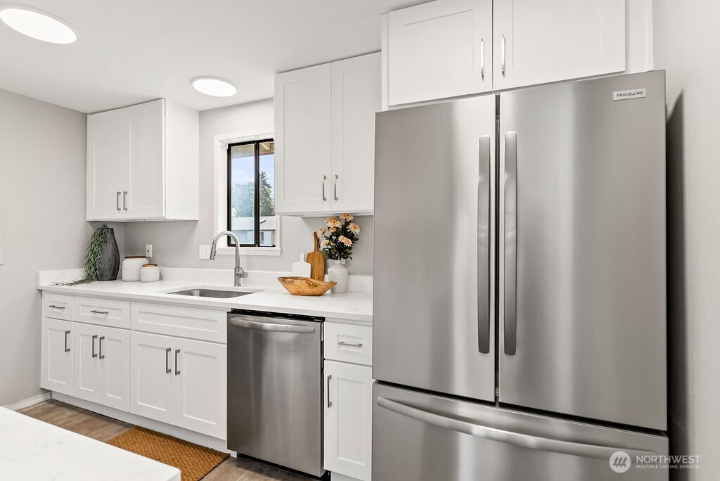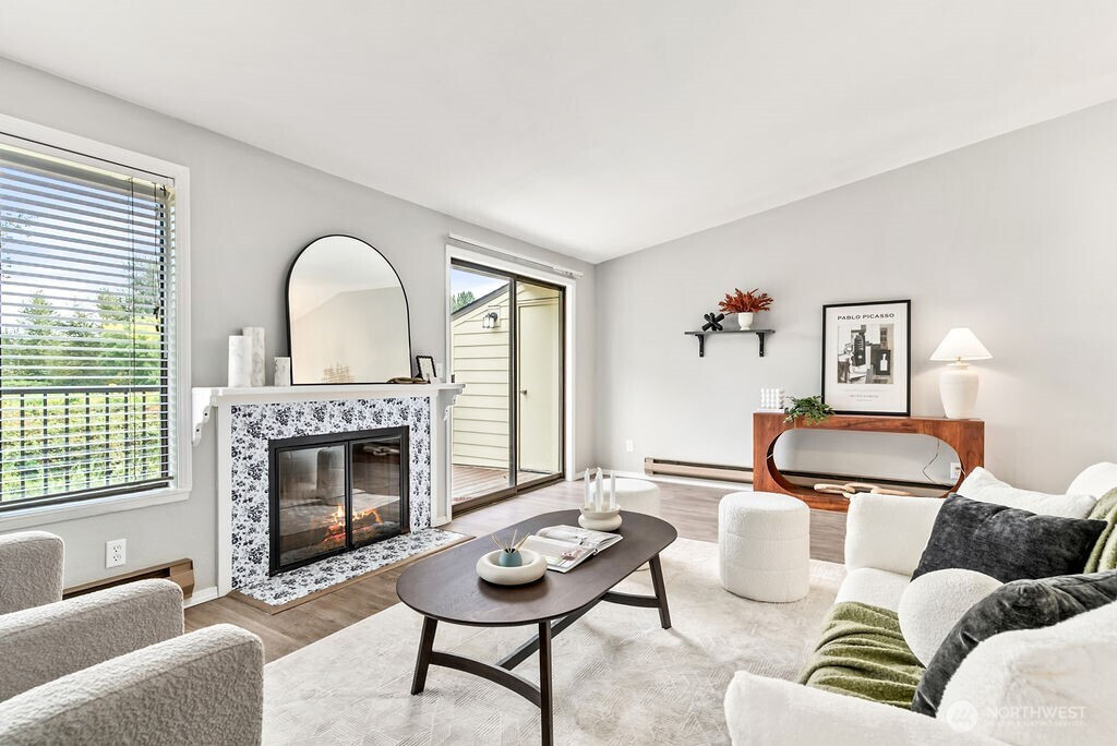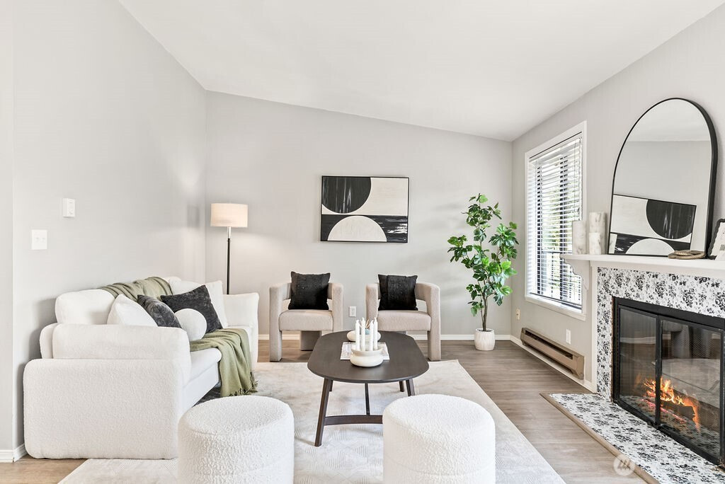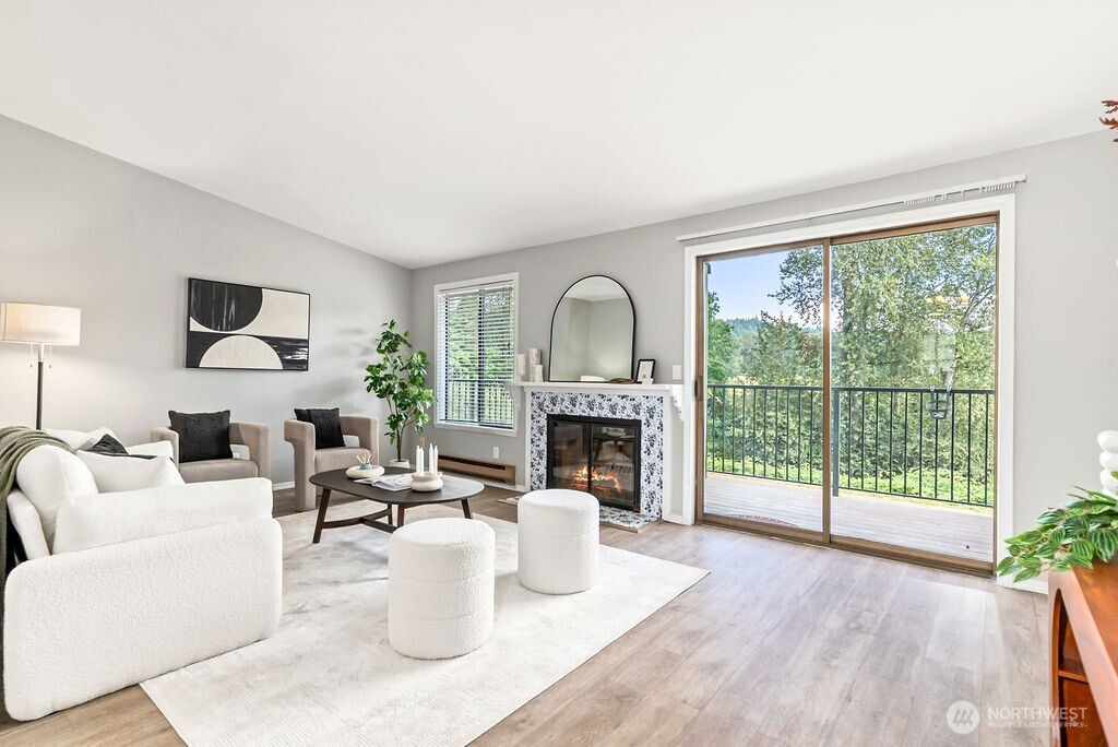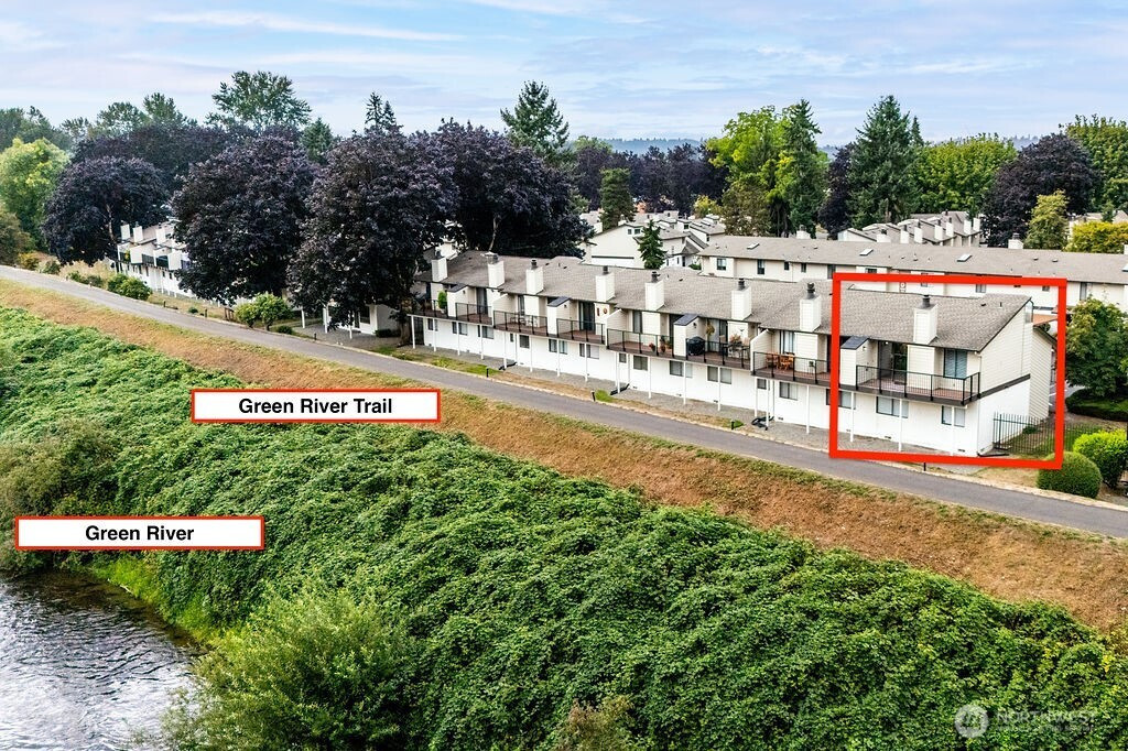 Move-in ready 2 bed, 1.5 bath corner unit townhome in desirable Holly Glen. Features fresh paint, new flooring, new kitchen with quartz kitchen countertops, new cabinets, new appliances & remodeled bath rooms. Spacious living room w/ fireplace opens to a private deck overlooking the Green River—perfect for relaxing or entertaining. Unit has a wet bar, laundry/utility room, storages, & covered parking spot.Pet-friendly community w/no rental cap, dues cover water, sewer, garbage. plus access to riverfront trails. Conveniently located near Hwy 167, Kent Station, shopping, transit & Sounder train.