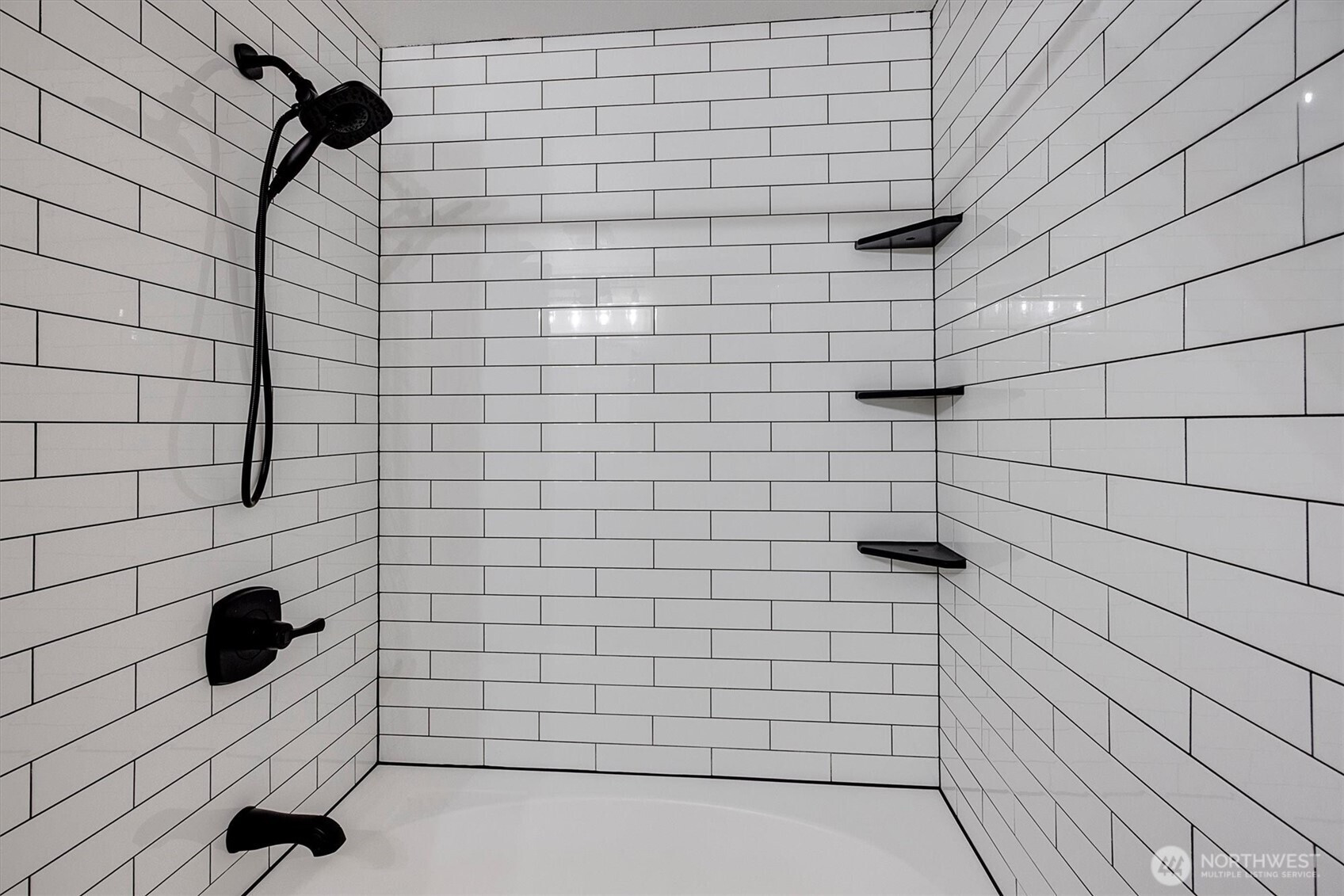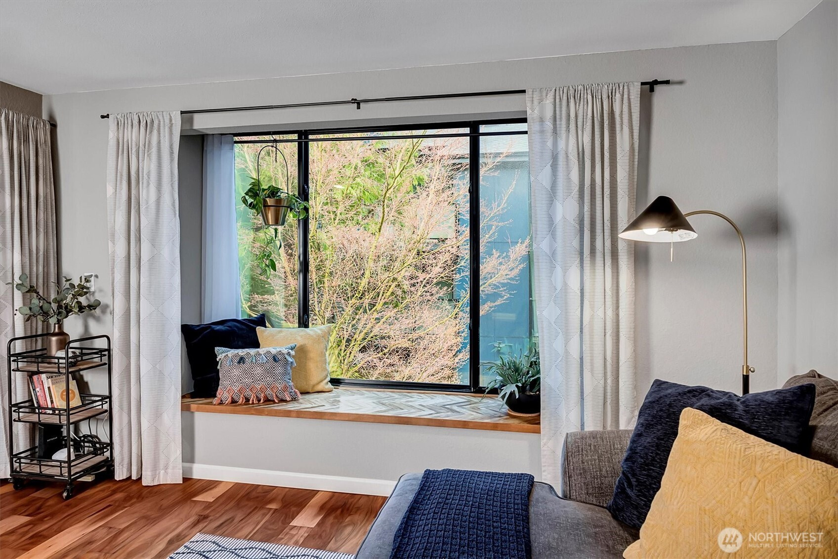 Welcome to Park Meridian. You'll love this turn-key, 2-bedroom, 1.75-bath condominium. Updates throughout, including new engineered hardwoods, remodeled bathrooms, new tile fireplace surround, updated kitchen and more. The 2022 building remodel included cement-board siding, new roof and new windows. Light and bright kitchen with a passthrough to the continuous dining and living rooms. Cozy wood-burning fireplace, picture windows which frame the outside greenery. Private deck for summer relaxation. Primary bedroom with ensuite bath. Custom heated tile flooring and tile surround, plus dual sinks with marble countertops. The second bedroom is roomy, and the 2nd bath includes a soaking tub, tile surround and new countertops. Park Meridian is pet friendly and there is no rental cap. 1 assigned carport parking spot plus ample guest parking. Great location, with proximity to the light rail, I5, 99, Northgate and the Kraken Iceplex. Nearby restaurants, shops and parks make this a great location to live.