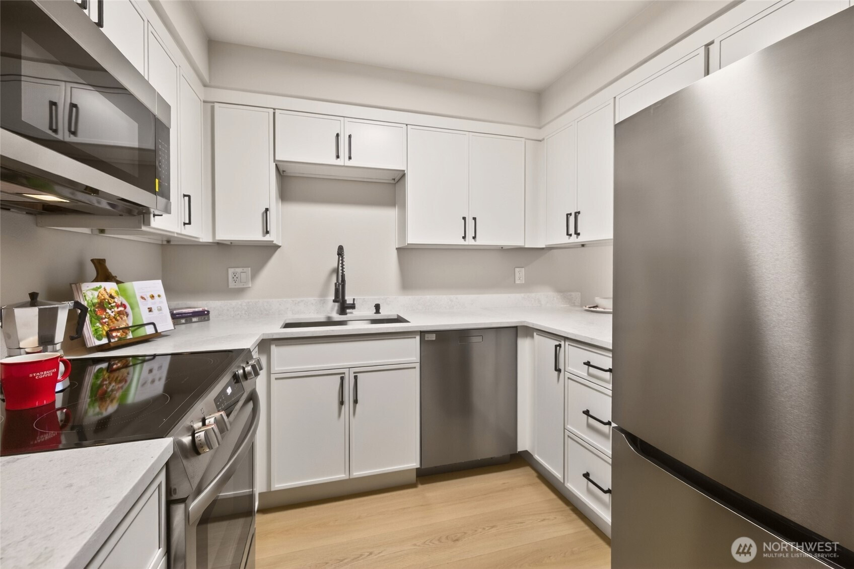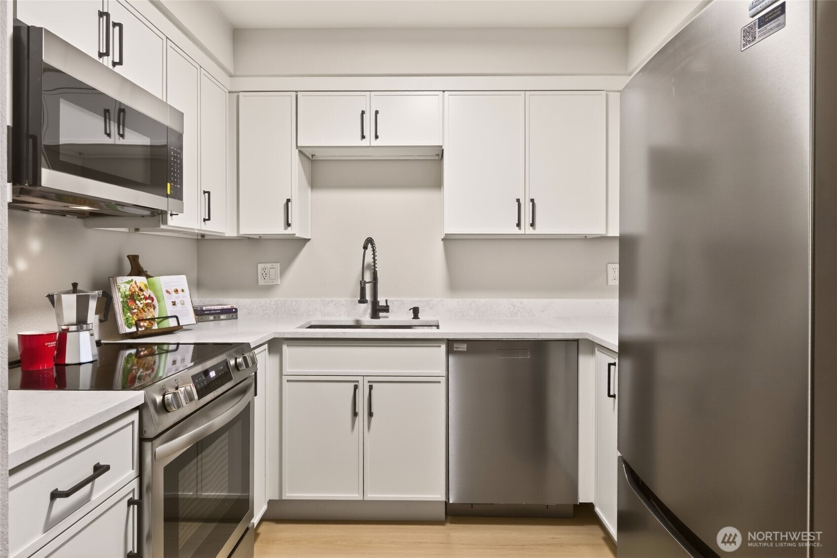 [ Downtown Kenmore & Lake Washington Waterfront just outside your front door!] Fantastic Walk, Bike, Transit, and Lifestyle Enjoyment Score here with numerous breweries, dining, shopping, the Burke-Gilman Trail, and parks - all within a few short moments away. This Top-Floor Corner End-Unit with Reserved Garage Parking features a Brand New Remodel with New LVP wide plank floors, New Stainless Appliances, All New Micro-Shaker Cabinets & Beautiful Honed Quartz Counters, New Lighting & Fixtures, New Tiled Shower, New Solid Wood Doors & Matte Black Hardware, Vaulted Ceilings + AC. The covered BBQ Deck offers year-round enjoyment, and the wood-burning fireplace adds to the ambiance. Great closet space + Huge Storage or Pantry. Fitness / Game room means it's all right here!. No Rental Cap & Low Dues, Pet Friendly. Pre-Inspected and Move-in-Ready!