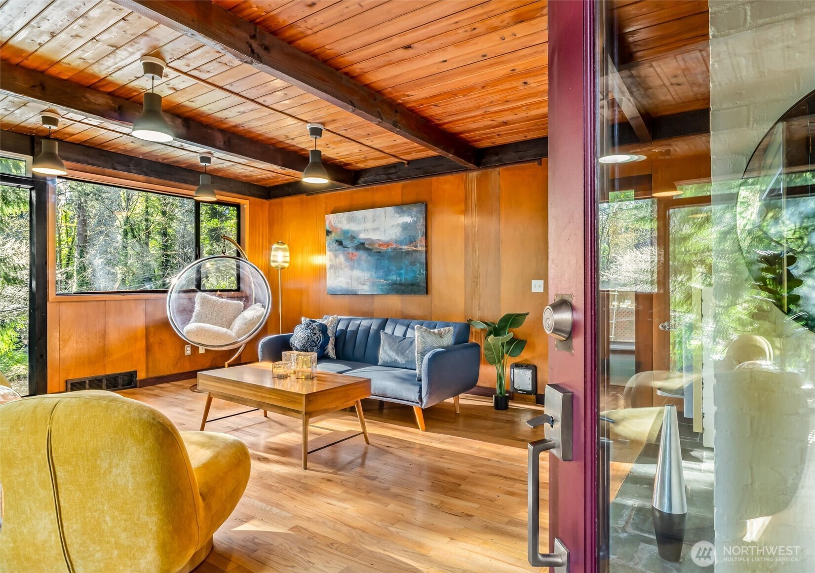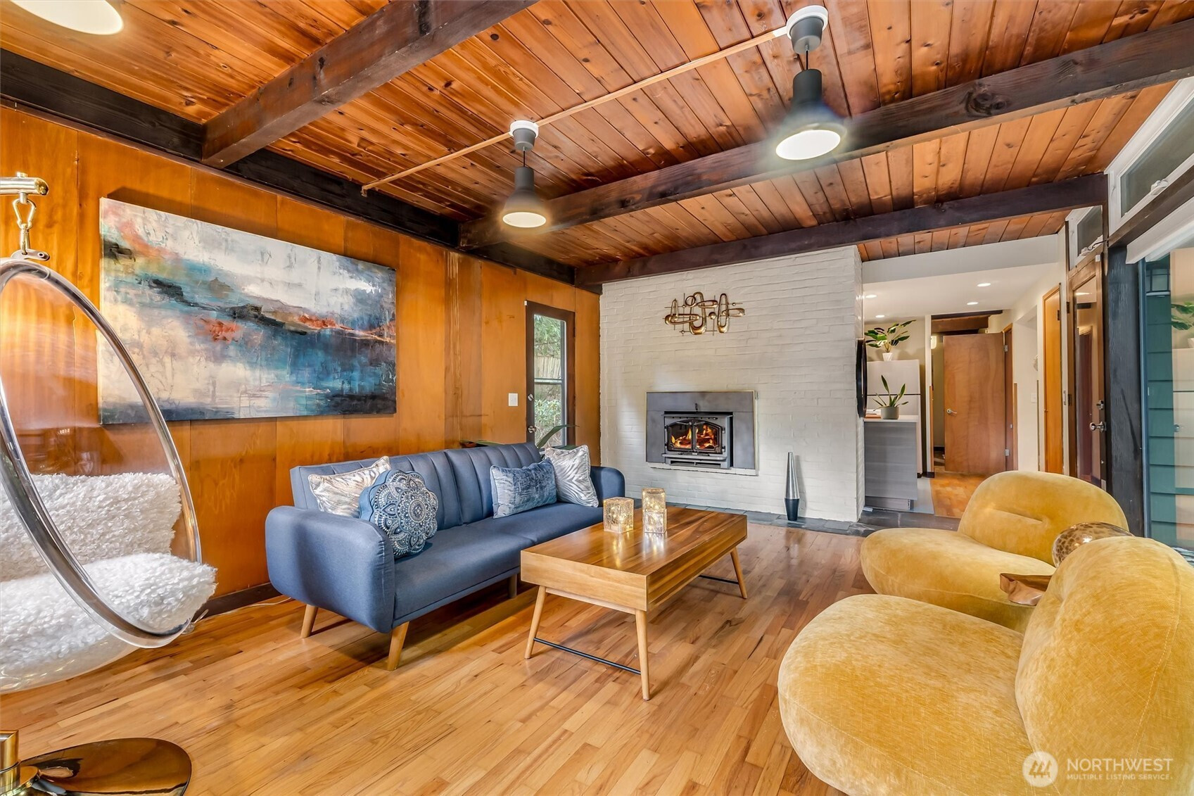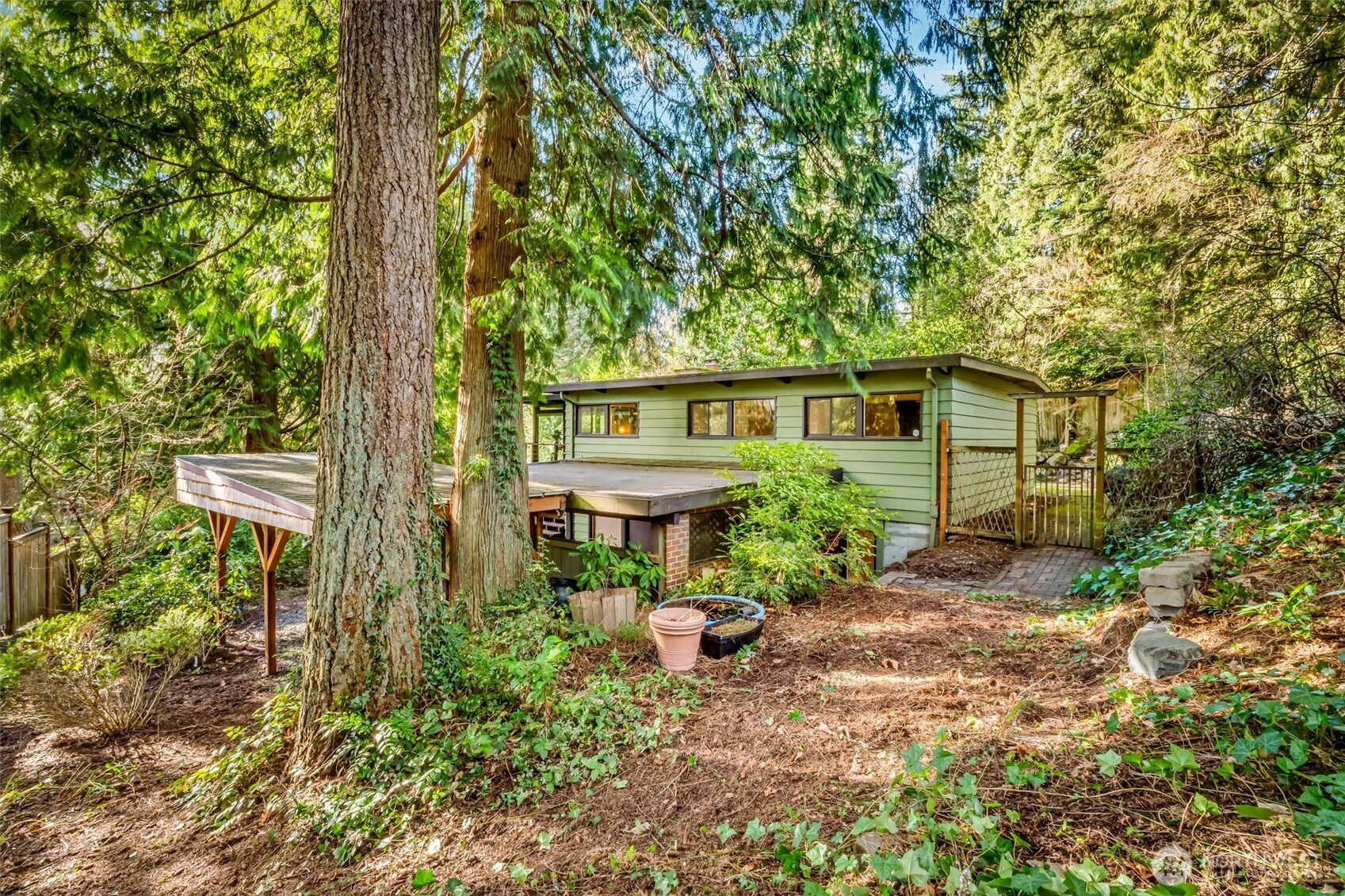 Nestled privately at the end of a tranquil cul-de-sac, this thoughtfully designed mid-century residence by noted Northwest architect/builder John Burrows offers timeless character and purposeful living spaces. Celebrated for his regional modernist designs that blend form and function, Burrows crafted homes that embrace natural settings while maintaining clean lines and open interiors. This classic Northwest Contemporary home features 4 bedrooms and 1.75 baths across approximately 2,220 sq. ft., with expansive open-beam ceilings, vaulted living spaces, and a welcoming slate entry. The living room and family room centers with exposed brick hearth fireplaces, creating warm gathering points, while hardwood flooring flows throughout the main level. Natural light fills the interior, complementing the open kitchen and dining area and feels like living in a beautiful treehouse. The home features a professionally installed modified bitumen (AB) roofing system designed specifically for low-slope modern architecture, combining clean architectural lines with long-term durability. The chimney was also professionally redone. Outdoors, enjoy a remodeled deck & wooded setting define the private lot. Thoughtful updates include updated gas furnace & tankless water heater which have been well maintained. Located in the deeded Lake Forest Park Civic Club community, this home affords access to club facilities including picnic shelter, beach rights, boat dock access & clubhouse.