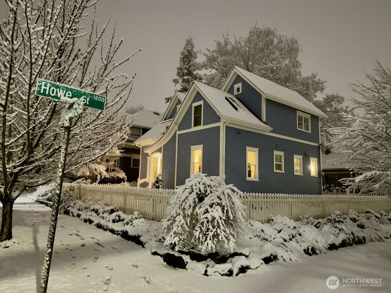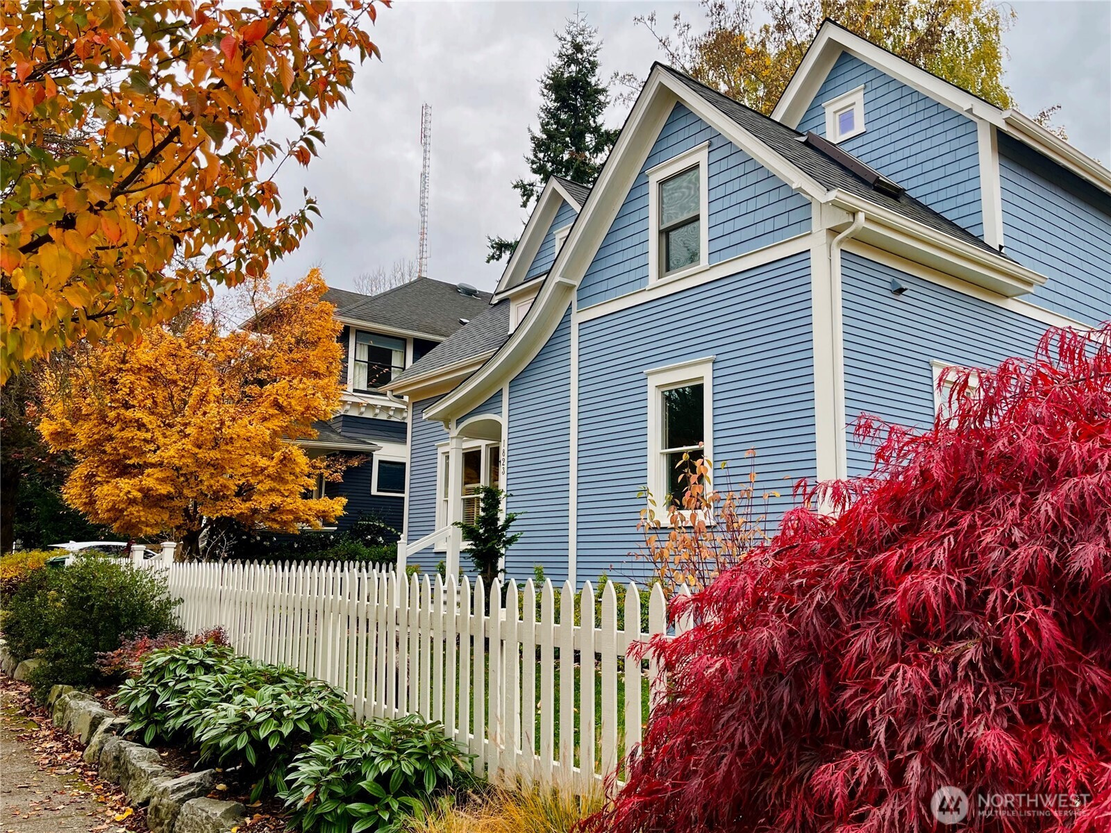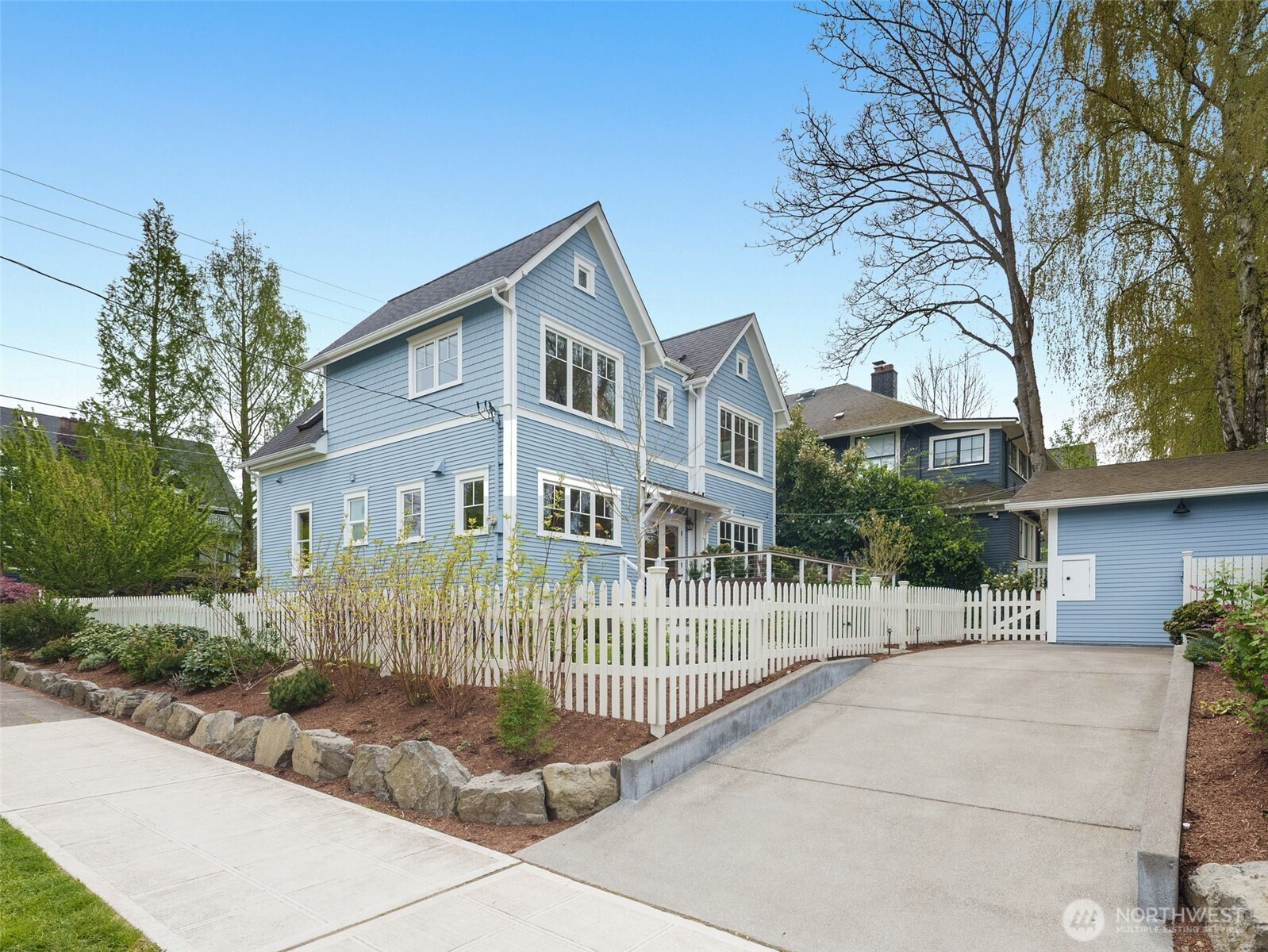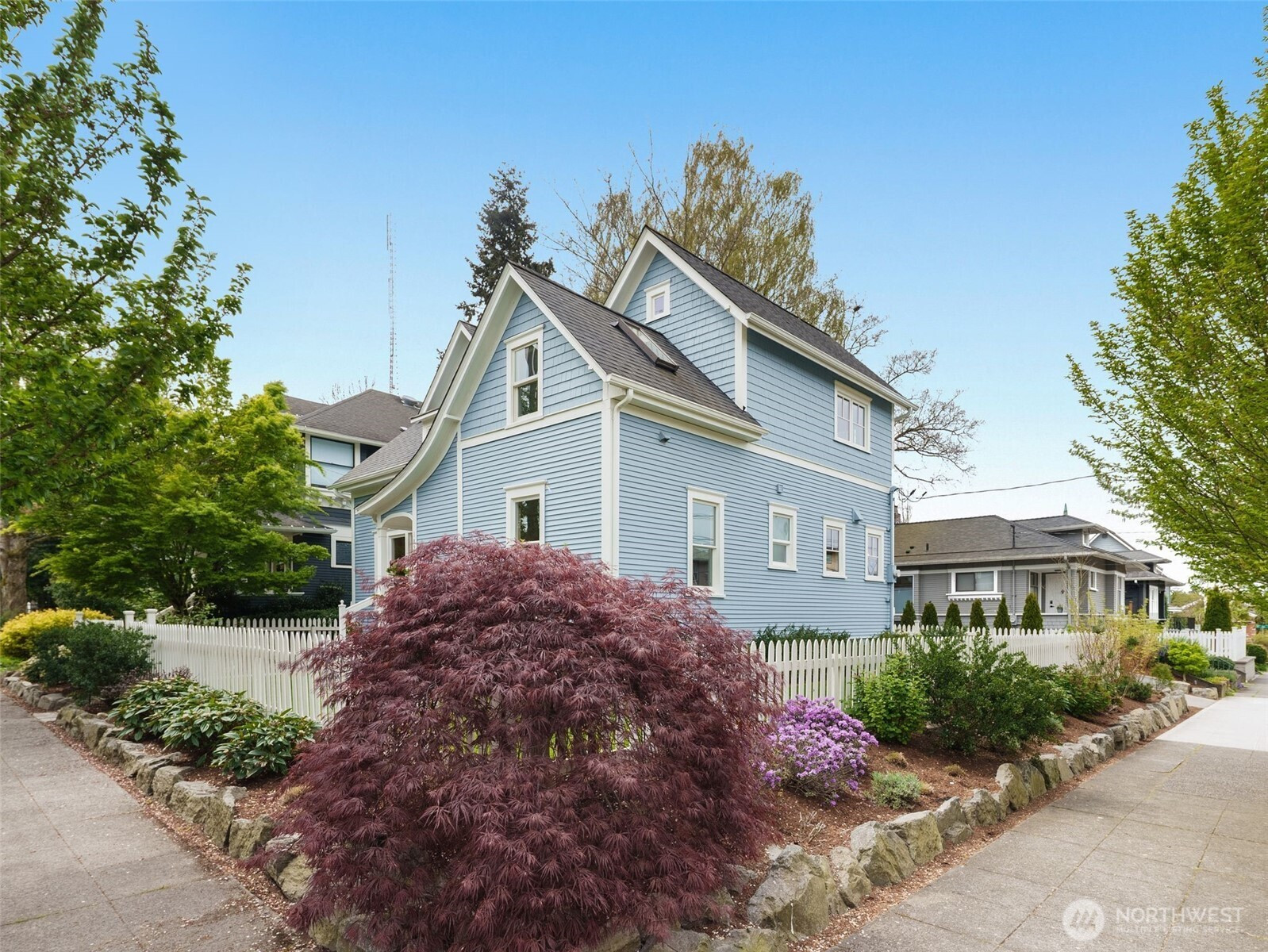 Perched on a coveted corner lot at the top of the hill, this impeccably remodeled residence offers timeless charm with modern perfection. A to-the-studs renovation by JAS has transformed the home into a light-filled showpiece, framed by the picture-perfect white picket fence and overlooking beloved Little Howe Park. Inside, the open-concept floor plan is designed for effortless living and entertaining, with sunlight pouring in the many windows. Beautiful hardwood floors, refined finishes, and thoughtful details create a warm yet sophisticated atmosphere. The stunning kitchen flows seamlessly into the dining and living spaces, with direct access to a generous West facing deck—ideal for morning coffee, summer dinners, or sunset gatherings. The home features three bedrooms upstairs with laundry and a loft, plus two beautifully appointed baths, basement storage, and a versatile den perfect for a home office, guest retreat, or media room. Every inch feels sparkling, polished, and move-in ready. Outside, exquisite new landscaping surrounds the property with blooming beauty and year-round curb appeal. Off-street parking with EV-charging, landscape lighting, and a shed add convenience to the home’s undeniable style. Rarely does a home combine such flawless condition, exceptional natural light, premier location, and storybook charm. All just two blocks to the heart of Queen Anne Ave’s bustling shopping, dining and Farmer’s Market. This is what perfection looks like!
