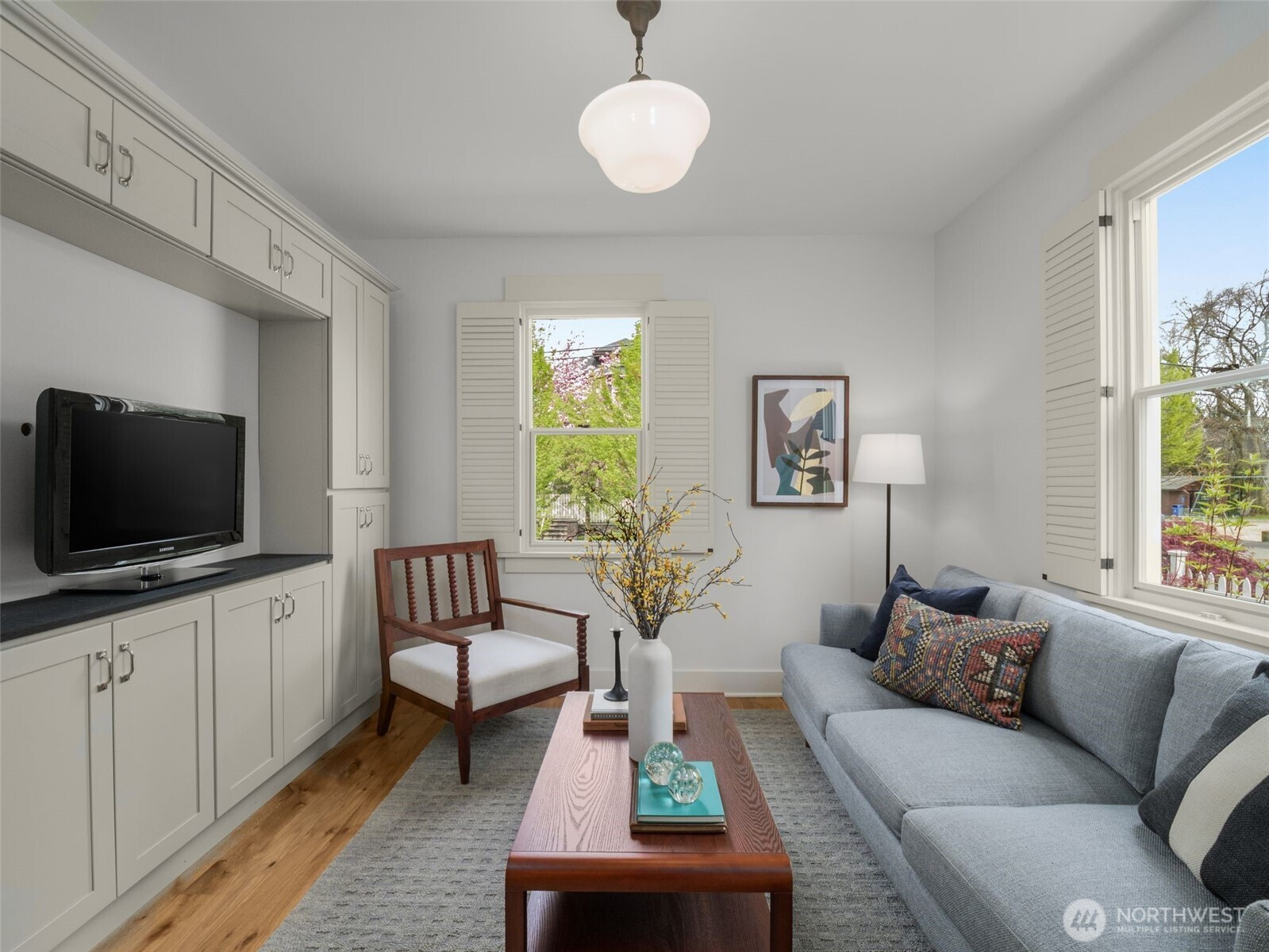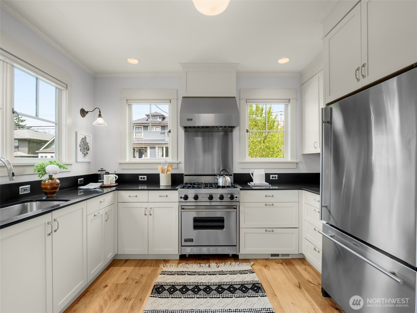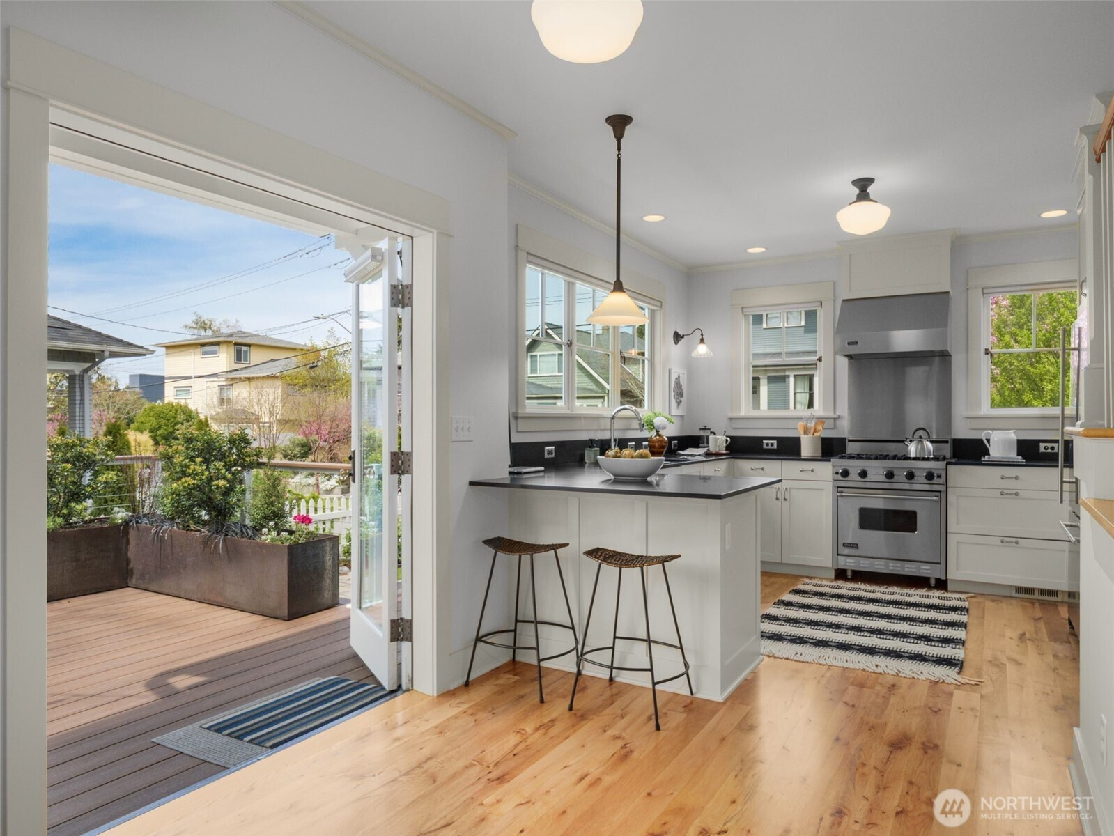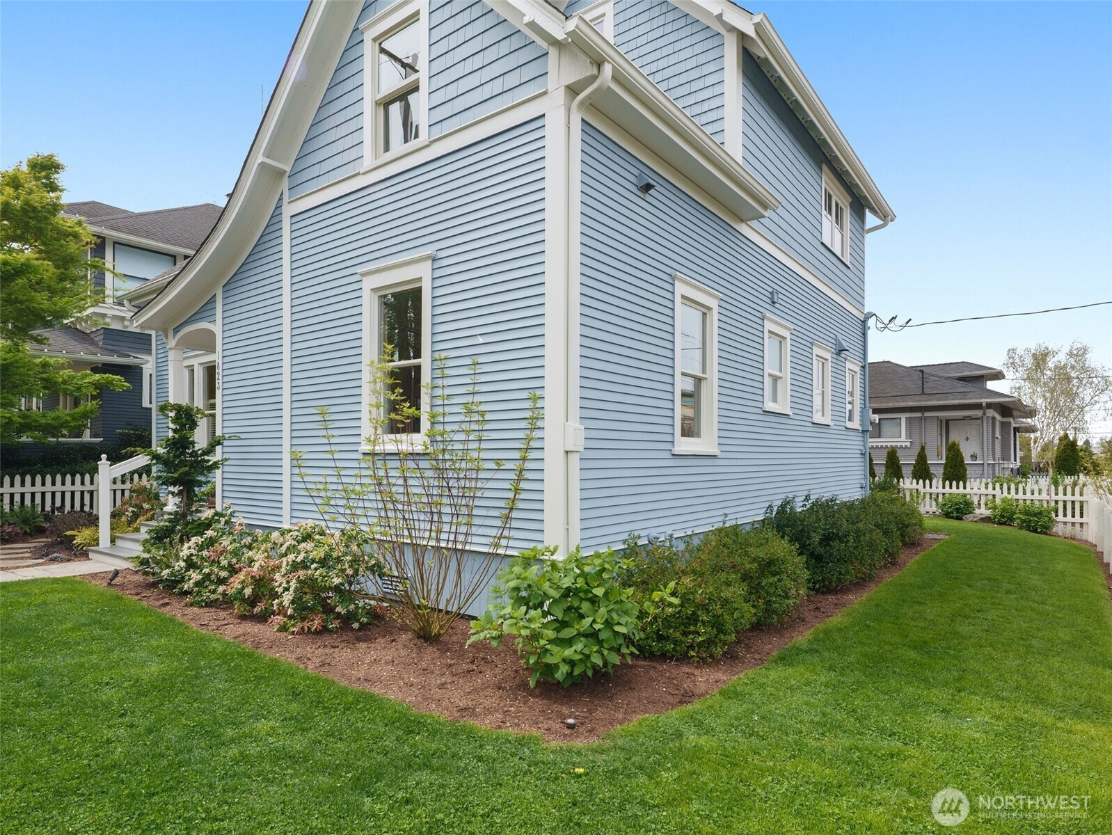 Perched on a coveted corner lot at the top of the hill, this impeccably remodeled residence offers timeless charm with modern perfection. A to-the-studs renovation by JAS has transformed the home into a light-filled showpiece, framed by the picture-perfect white picket fence and overlooking beloved Little Howe Park. Inside, the open-concept floor plan is designed for effortless living and entertaining, with sunlight pouring in the many windows. Beautiful hardwood floors, refined finishes, and thoughtful details create a warm yet sophisticated atmosphere. The stunning kitchen flows seamlessly into the dining and living spaces, with direct access to a generous West facing deck—ideal for morning coffee, summer dinners, or sunset gatherings. The home features three bedrooms upstairs with laundry and a loft, plus two beautifully appointed baths, basement storage, and a versatile den perfect for a home office, guest retreat, or media room. Every inch feels sparkling, polished, and move-in ready. Outside, exquisite new landscaping surrounds the property with blooming beauty and year-round curb appeal. Off-street parking with EV-charging, landscape lighting, and a shed add convenience to the home’s undeniable style. Rarely does a home combine such flawless condition, exceptional natural light, premier location, and storybook charm. All just two blocks to the heart of Queen Anne Ave’s bustling shopping, dining and Farmer’s Market. This is what perfection looks like!
