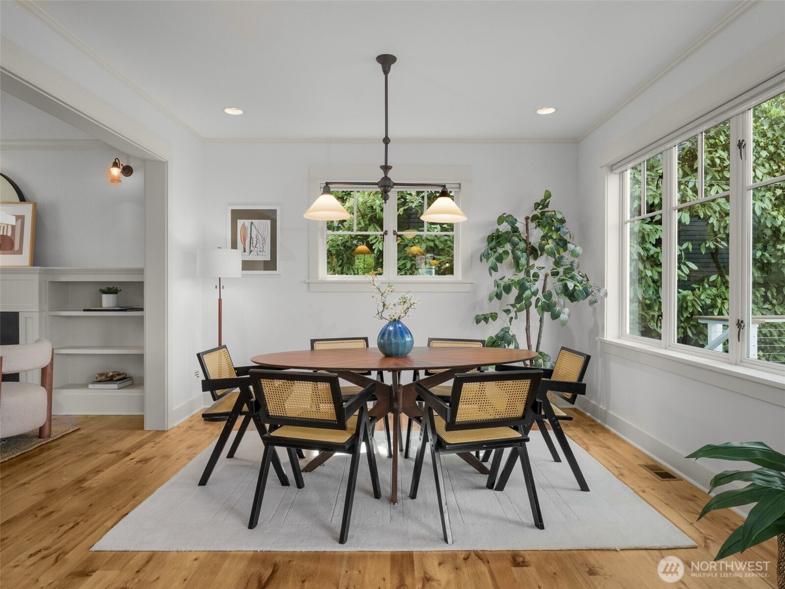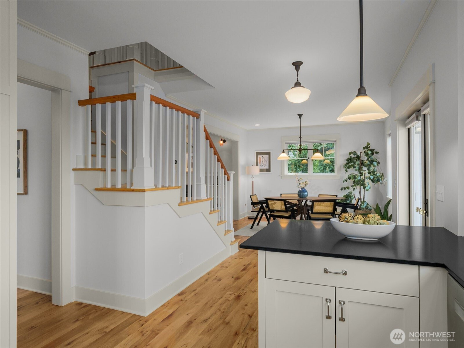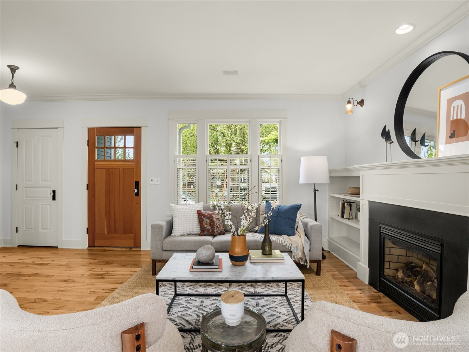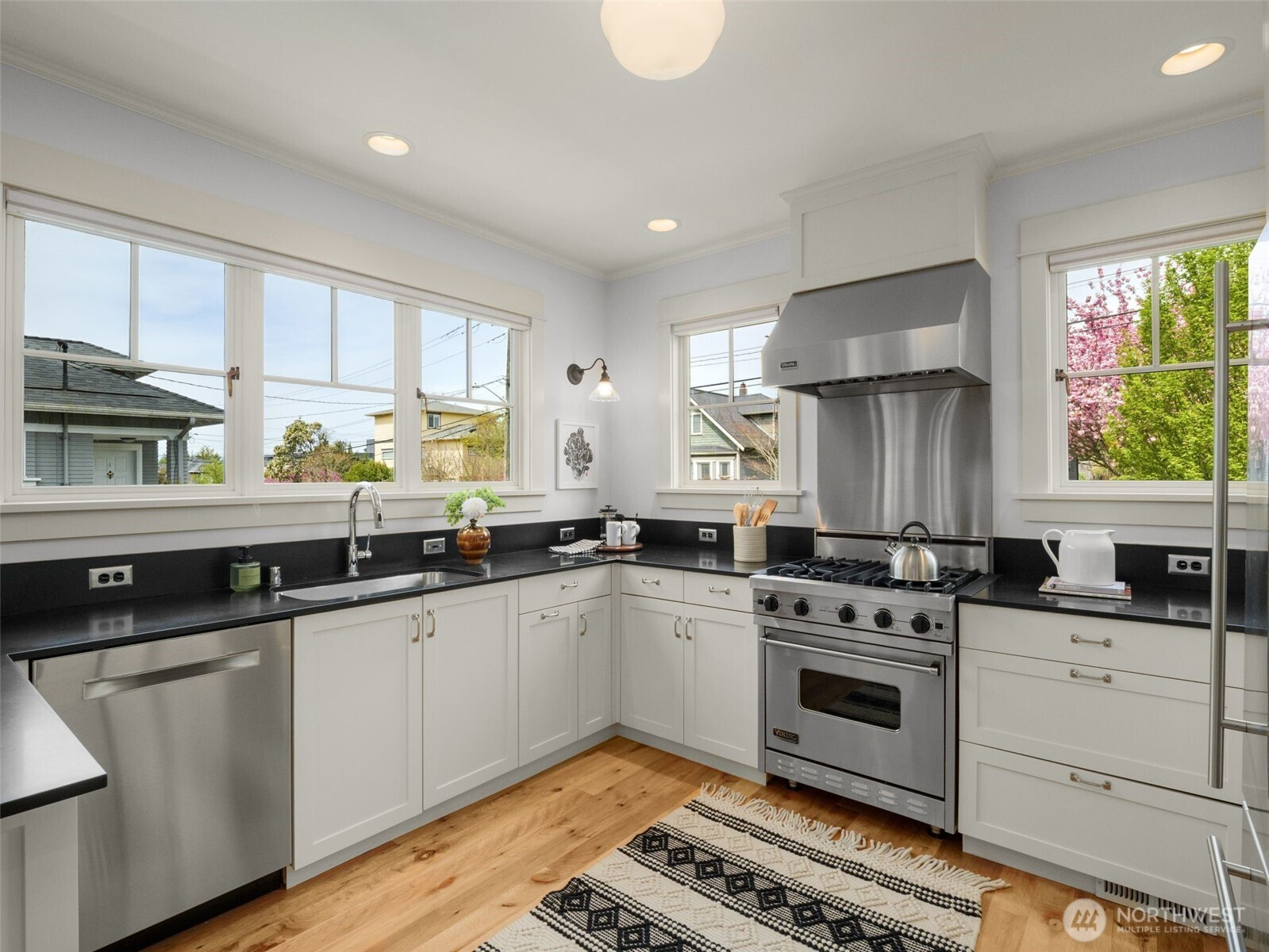 Perched on a coveted corner lot at the top of the hill, this impeccably remodeled residence offers timeless charm with modern perfection. A to-the-studs renovation by JAS has transformed the home into a light-filled showpiece, framed by the picture-perfect white picket fence and overlooking beloved Little Howe Park. Inside, the open-concept floor plan is designed for effortless living and entertaining, with sunlight pouring in the many windows. Beautiful hardwood floors, refined finishes, and thoughtful details create a warm yet sophisticated atmosphere. The stunning kitchen flows seamlessly into the dining and living spaces, with direct access to a generous West facing deck—ideal for morning coffee, summer dinners, or sunset gatherings. The home features three bedrooms upstairs with laundry and a loft, plus two beautifully appointed baths, basement storage, and a versatile den perfect for a home office, guest retreat, or media room. Every inch feels sparkling, polished, and move-in ready. Outside, exquisite new landscaping surrounds the property with blooming beauty and year-round curb appeal. Off-street parking with EV-charging, landscape lighting, and a shed add convenience to the home’s undeniable style. Rarely does a home combine such flawless condition, exceptional natural light, premier location, and storybook charm. All just two blocks to the heart of Queen Anne Ave’s bustling shopping, dining and Farmer’s Market. This is what perfection looks like!