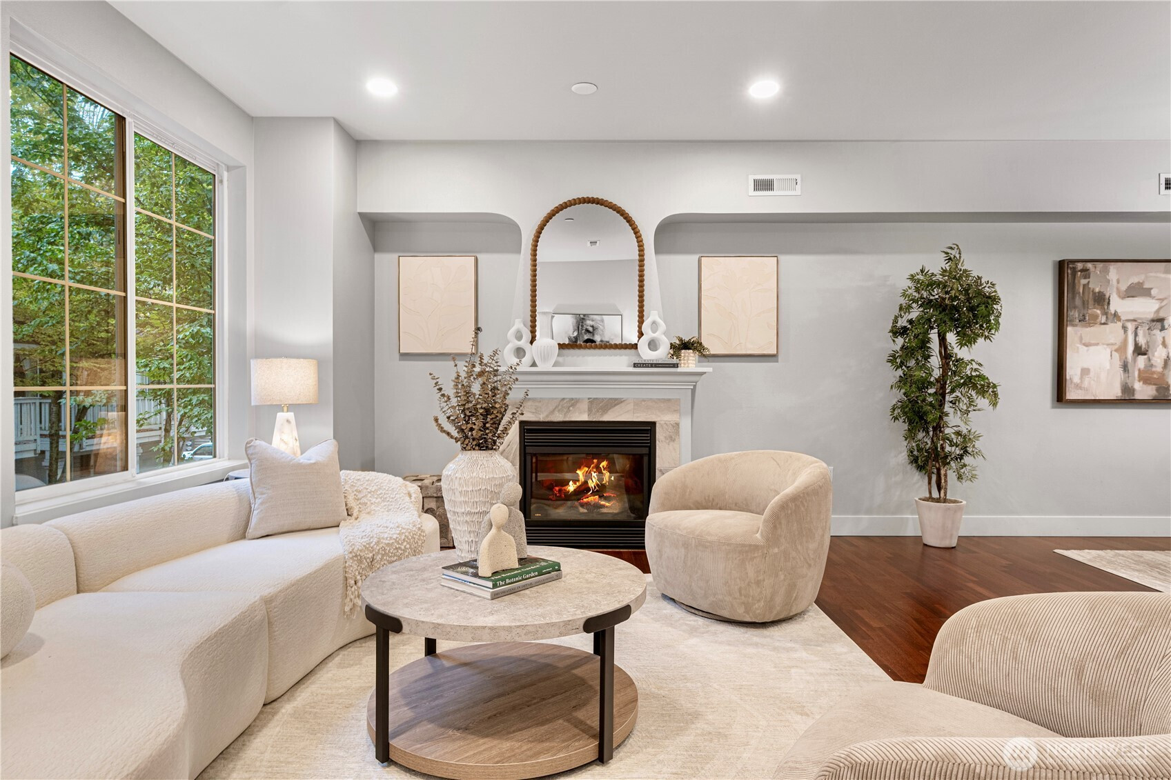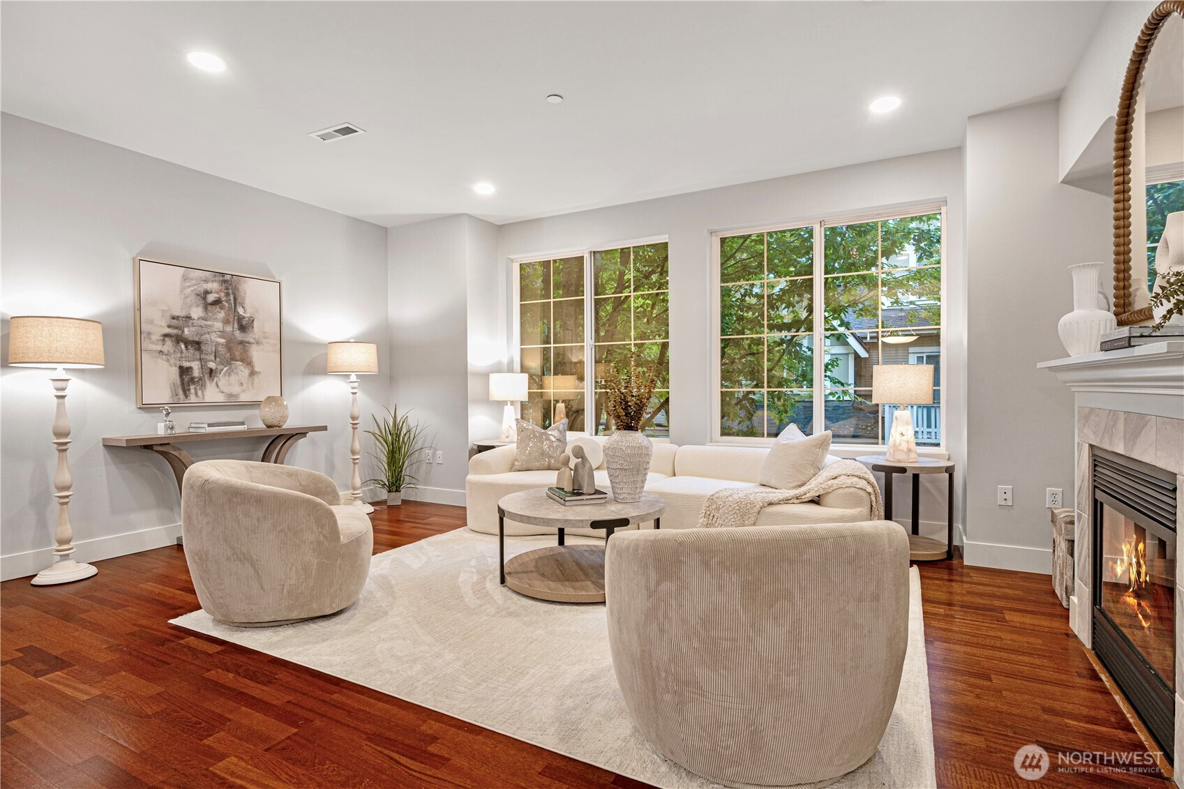 Spacious 3 bedroom & 2 bath townhouse features a light & bright floor plan! Main level boasts hardwoods throughout, large living room w/ extra high ceilings, gas fireplace, dining room, kitchen w/ stainless appliances & eating space. Slider off kitchen leads to quaint lovely yard. New carpet & paint throughout. Vaulted ceilings in bedrooms. Two car tandem garage. Plenty of extra storage. Minutes to highway, amenities, downtown Redmond & Microsoft. Strong HOA & no rental cap. Welcome home!