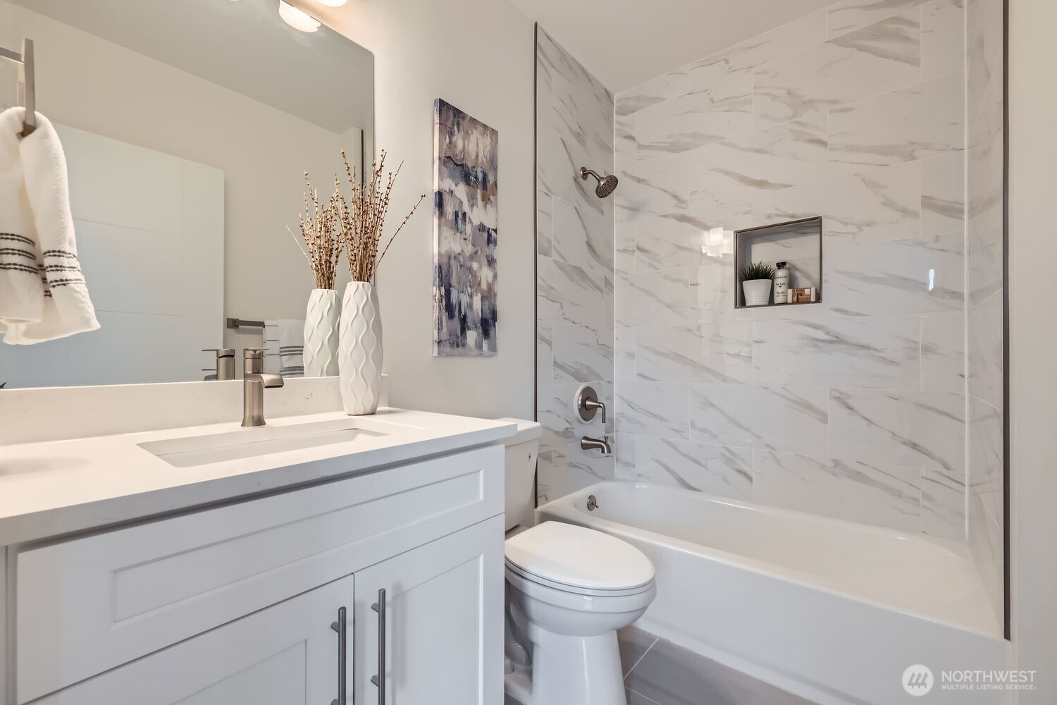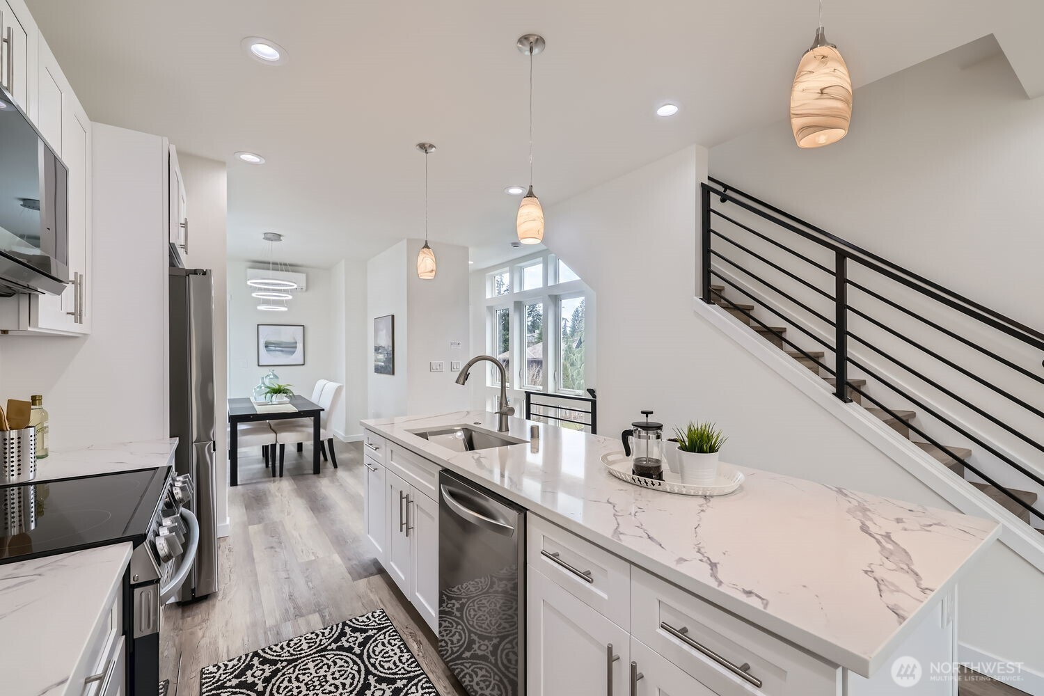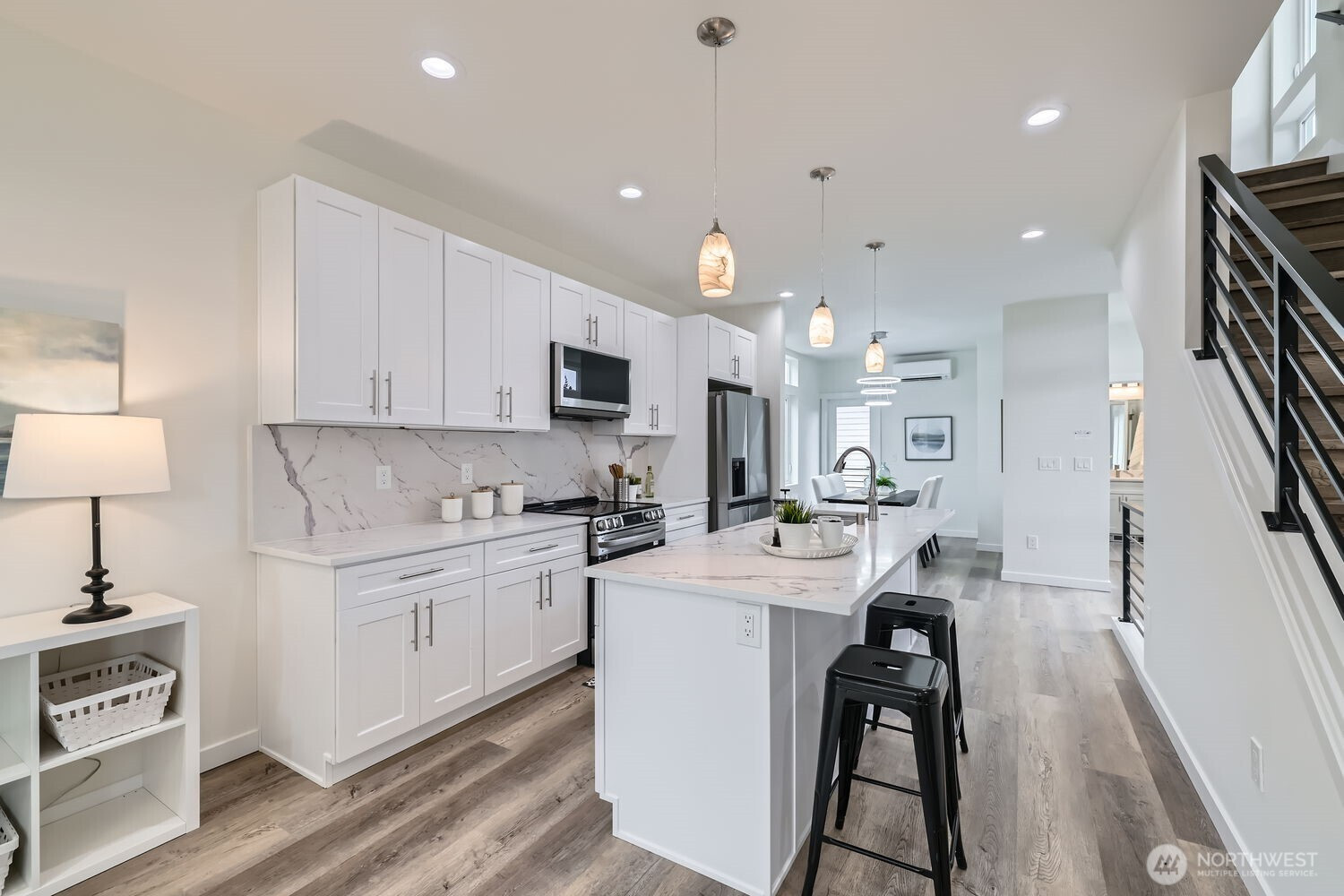 FINAL HOME AVAILABLE! Stand alone multi-level home in stunning new townhome community developed by local builders. 3 bedroom, 2 and 3/4 bath home a short walk away from the 185th St Light Rail Station. Expansive floorplan (1742 sq ft) with light & bright spaces throughout. Custom quartz countertops in entertainer's kitchen with SS appliances, convection cooking, and a generous island with room for 5 or 6. Two upper-level bedrooms with vaulted ceilings and gorgeous full baths. Tankless gas water heater and ductless HP mini-splits for year-round comfort. 1-car garage. You'll appreciate this quiet residential street, the award-winning Shoreline schools and local parks. New Coffee Shop just up the street - Liturgy. Stop in for a cuppa and a treat! 4 out of 5 homes in this new development sold - all owner occupied! Bring your offer!