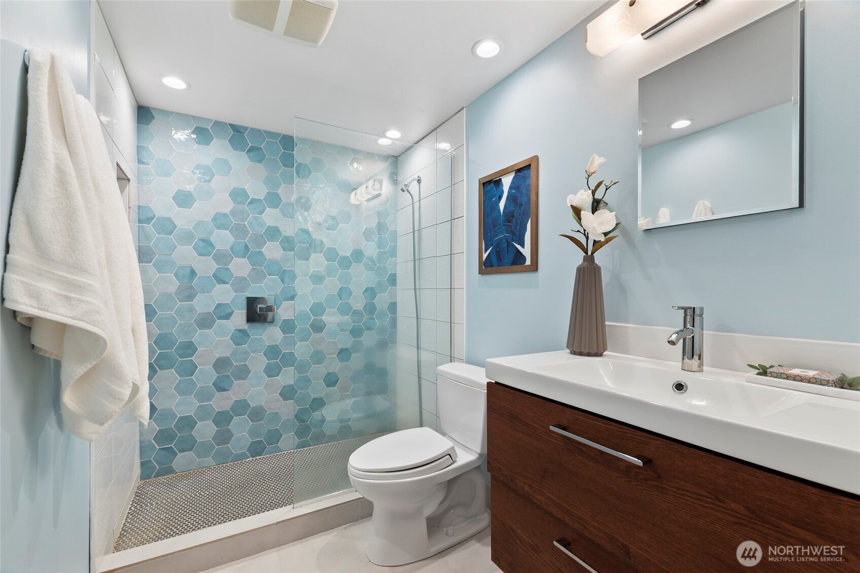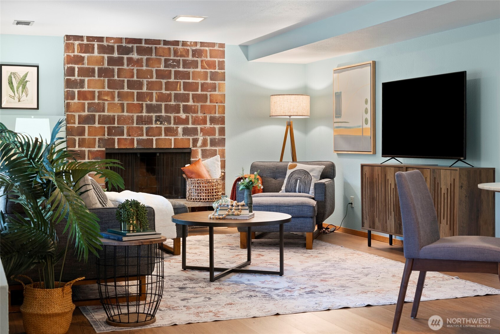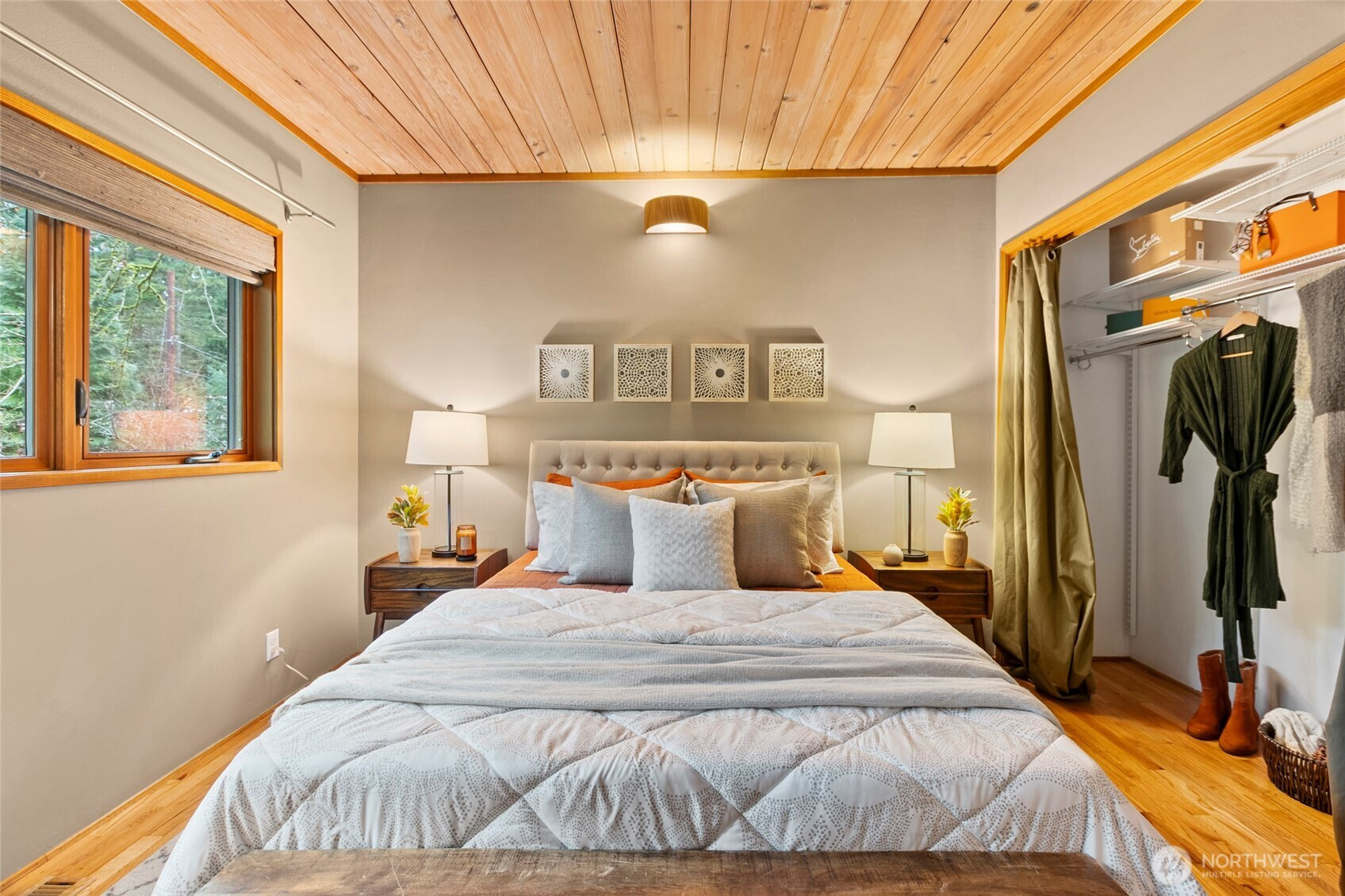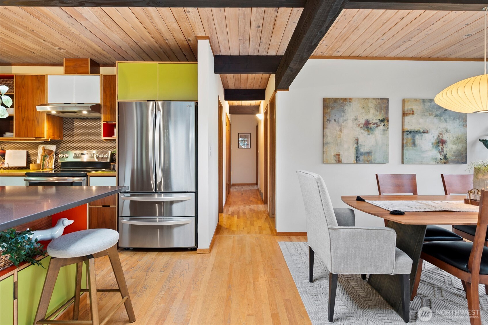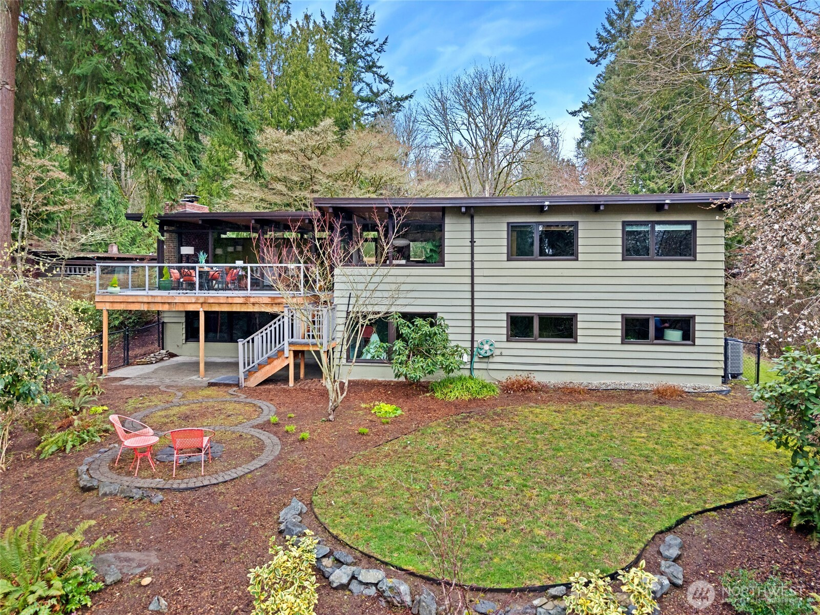 Step inside this well-maintained 1960 architect-designed mid-century modern by renowned John Burrows. Privately sited on a quiet Lake Forest Park cul-de-sac with rare treehouse-like serenity. Walls of windows flood open living spaces with natural light, seamlessly connecting indoors to the surrounding sanctuary. Original cedar beam vaulted ceilings, hardwood floors, and select 1960s fixtures preserve the home’s architectural integrity. The remodeled kitchen features custom cabinetry by Kerf Design, honoring the home’s modern roots while elevating everyday living. Updated baths reflect cohesive, design-forward finishes. Premium lighting includes George Nelson Saucer Bubble Lamps and Sonneman pendants. Three main-level bedrooms include a primary suite with ensuite bath. The finished daylight lower level with private entry offers flexible living/media room, office, guest space, or potential ADU/MIL. Spacious laundry, abundant storage, and EV-ready electrical panel. Backyard wildlife setting with eagles, deer, and hummingbirds. Large lot offers outdoor flexibility and potential DADU opportunity (buyer to verify). Eligible for Lake Forest Park Civic Club membership. A rare Pacific Northwest retreat blending timeless design and versatility.