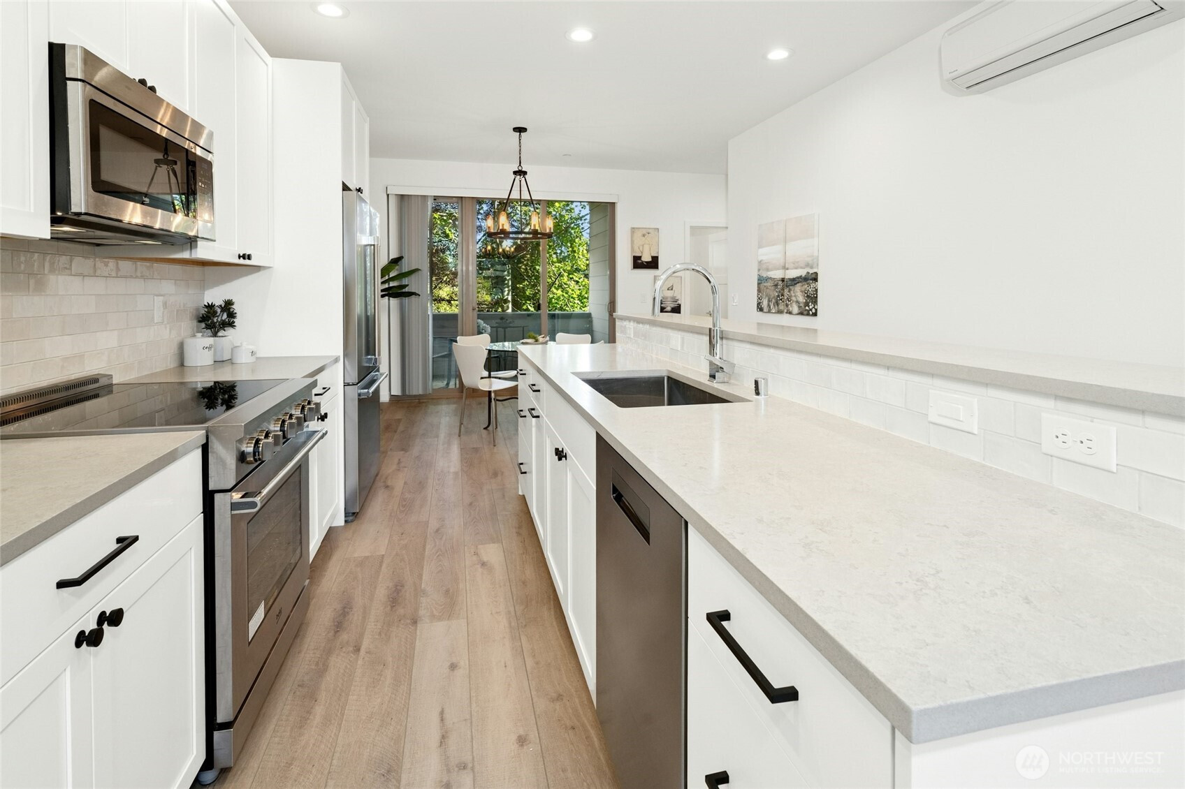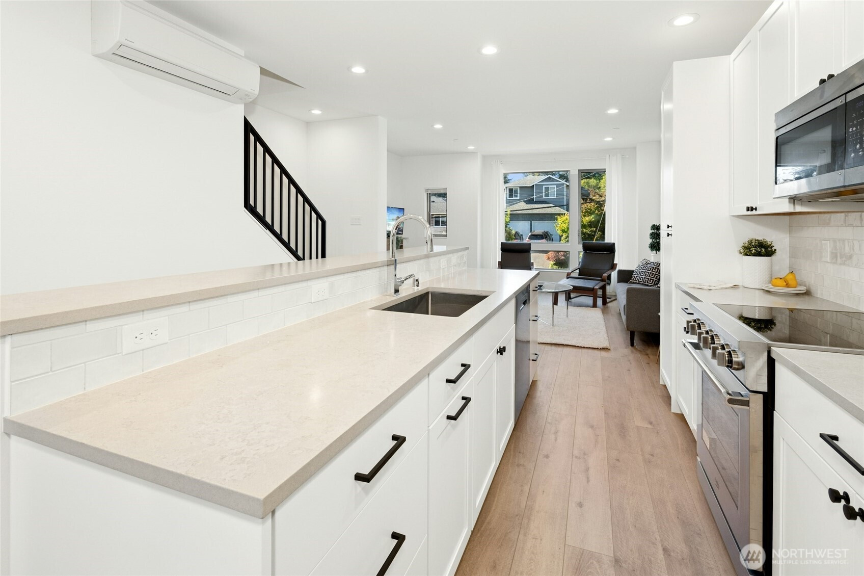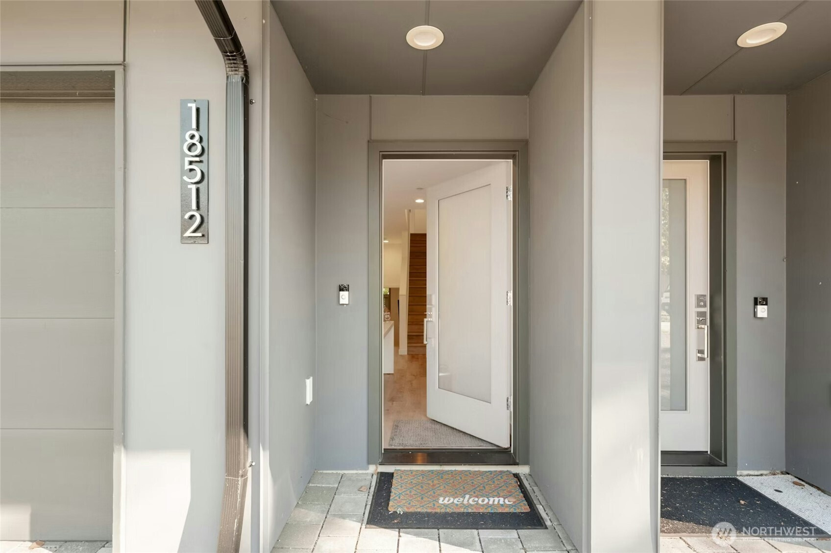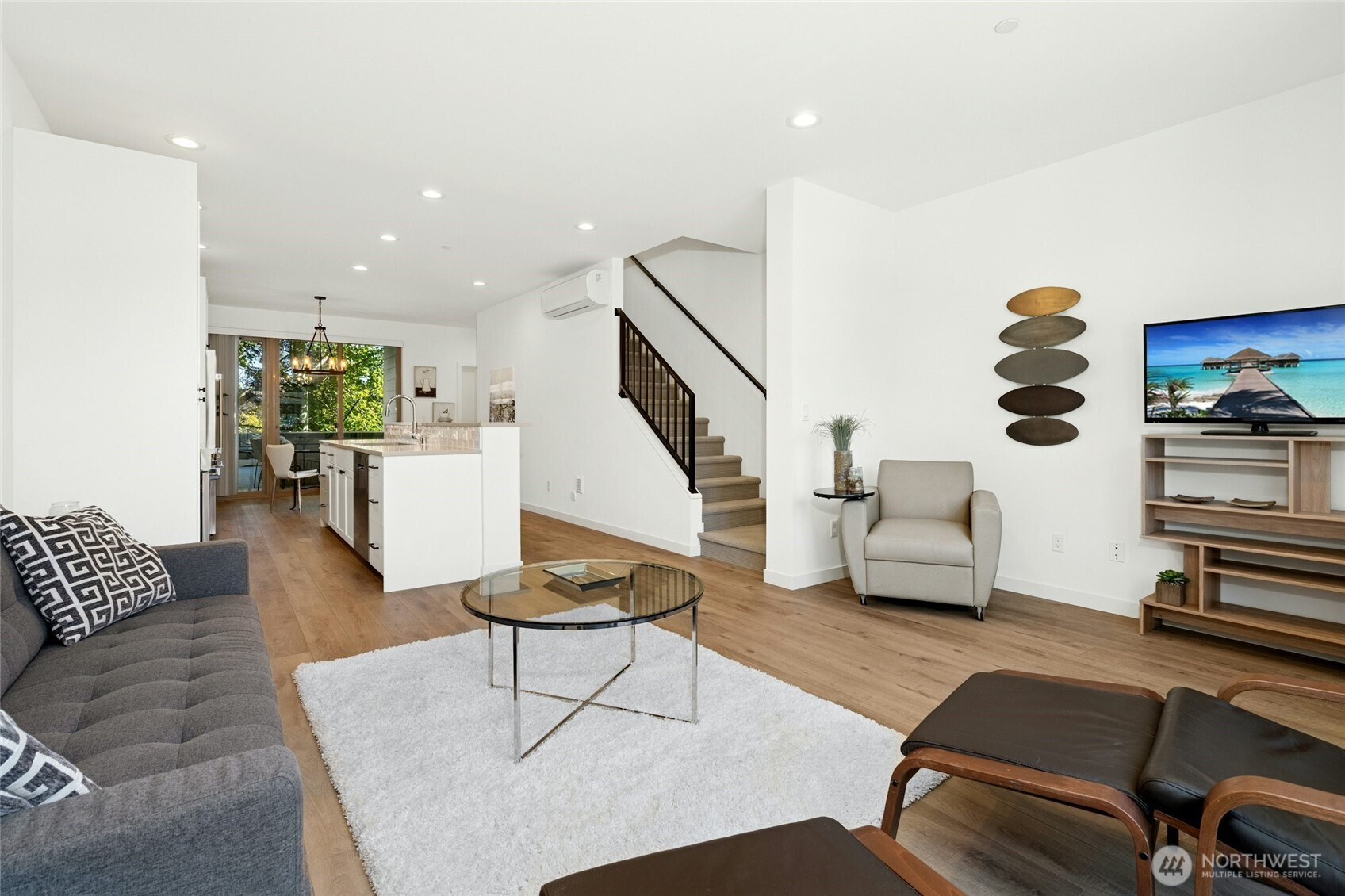 Sophisticated contemporary townhome offering over 1,700 SF of luminous living space. Features 3 spacious bedrooms, 3 baths, and a powder room on the main floor. Elegant interior palette with modern lighting, hard-surface floors and A/C in main living area, and plush patterned carpet in bedrooms. Gourmet kitchen with quartz countertops, stainless steel appliances, and breakfast bistro. Bright Owner’s suite has large windows and A/C. Spacious Walk-in closet. Enjoy a fenced backyard, abundant natural light, and a 1-car attached garage. Spacious balcony on 2nd floor. Located within the acclaimed Shoreline School District, with easy access to I-5 and North Shoreline lightrail station. A vibrant community with exceptional growth potential.