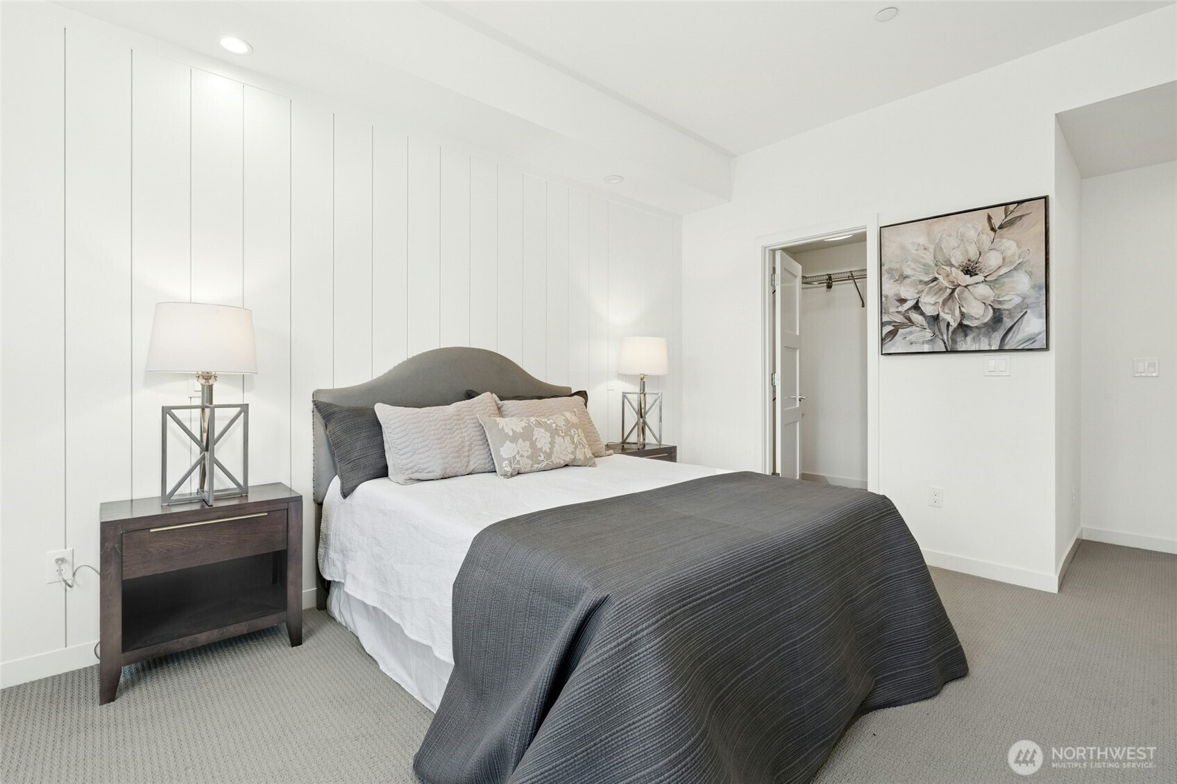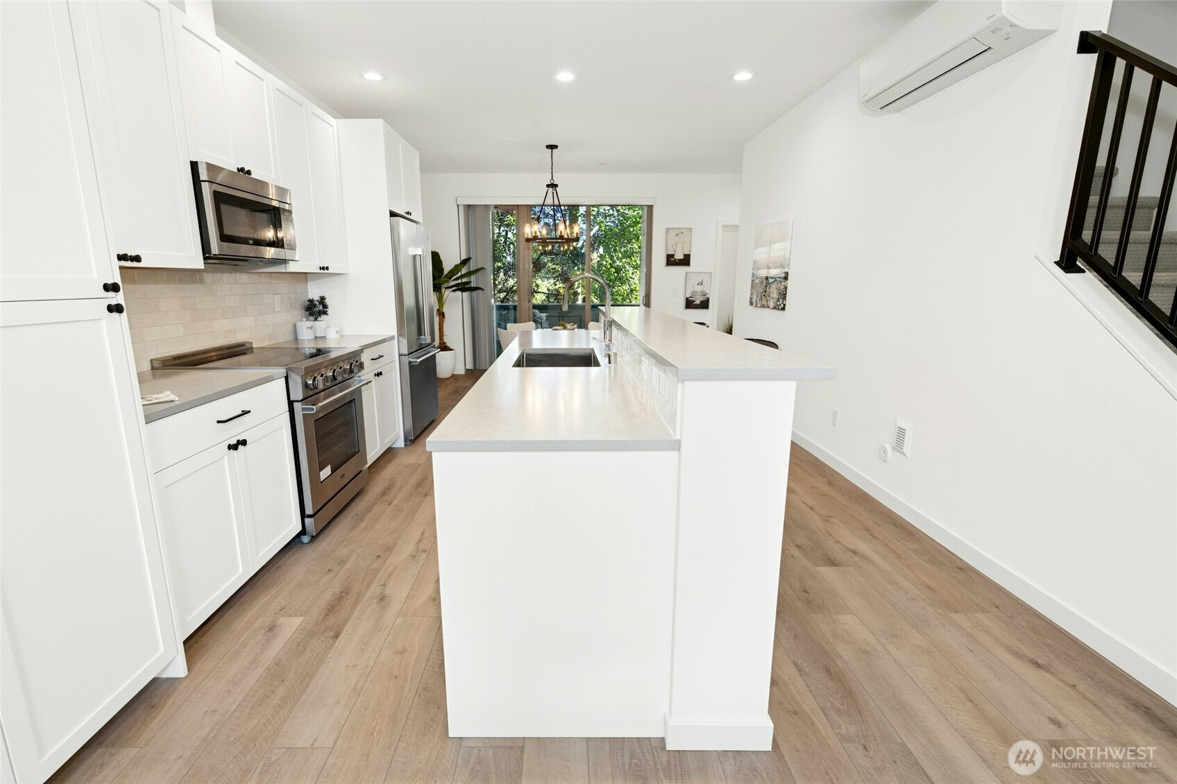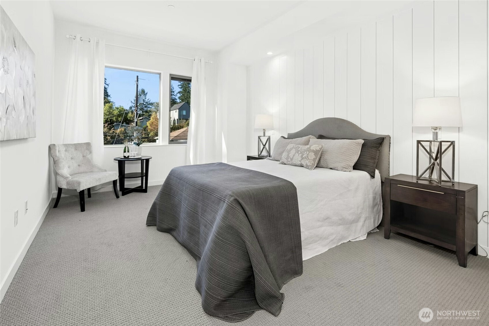 Sophisticated contemporary townhome offering over 1,700 SF of luminous living space. Features 3 spacious bedrooms, 3 baths, and a powder room on the main floor. Elegant interior palette with modern lighting, hard-surface floors and A/C in main living area, and plush patterned carpet in bedrooms. Gourmet kitchen with quartz countertops, stainless steel appliances, and breakfast bistro. Bright Owner’s suite has large windows and A/C. Spacious Walk-in closet. Enjoy a fenced backyard, abundant natural light, and a 1-car attached garage. Spacious balcony on 2nd floor. Located within the acclaimed Shoreline School District, with easy access to I-5 and North Shoreline lightrail station. A vibrant community with exceptional growth potential.