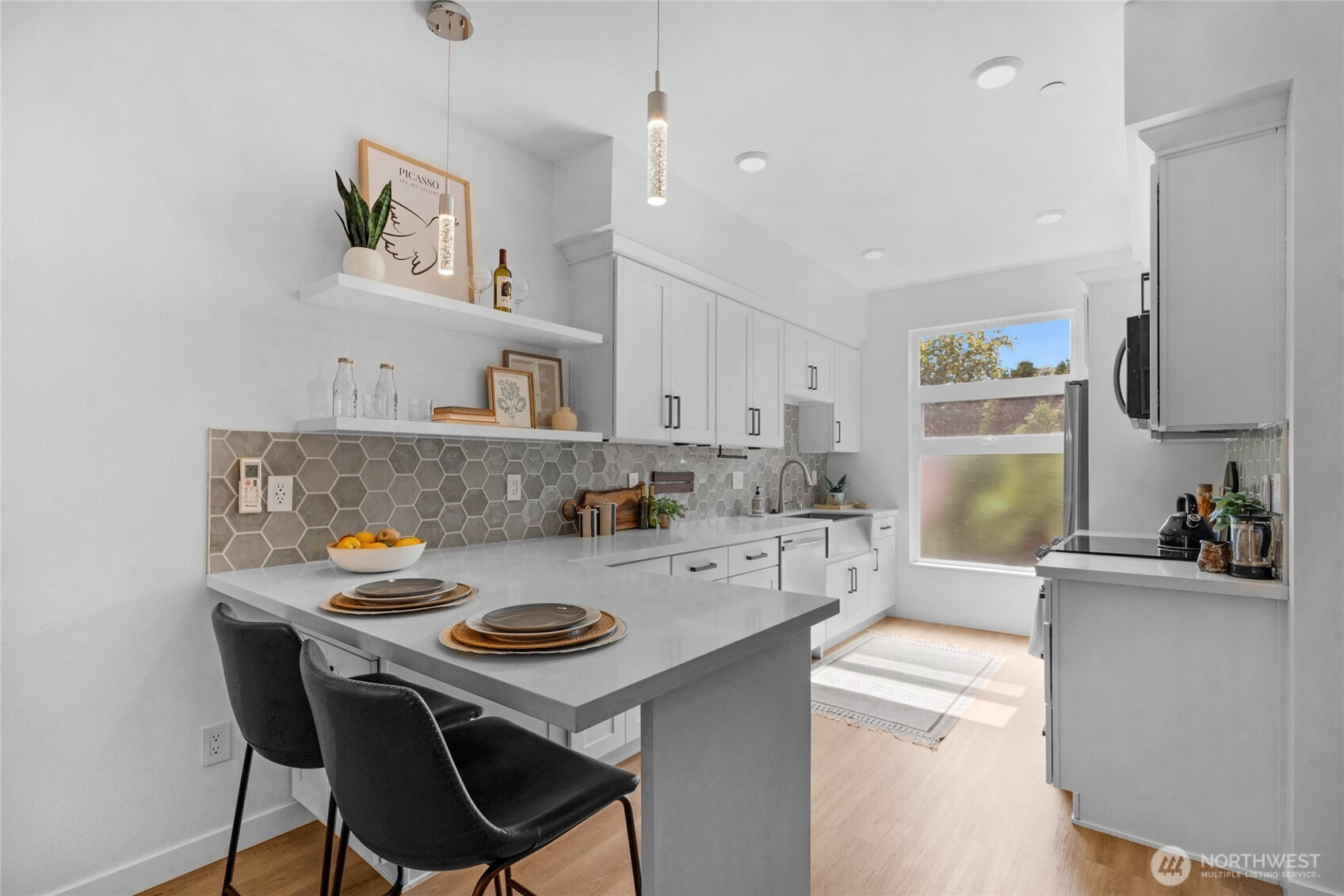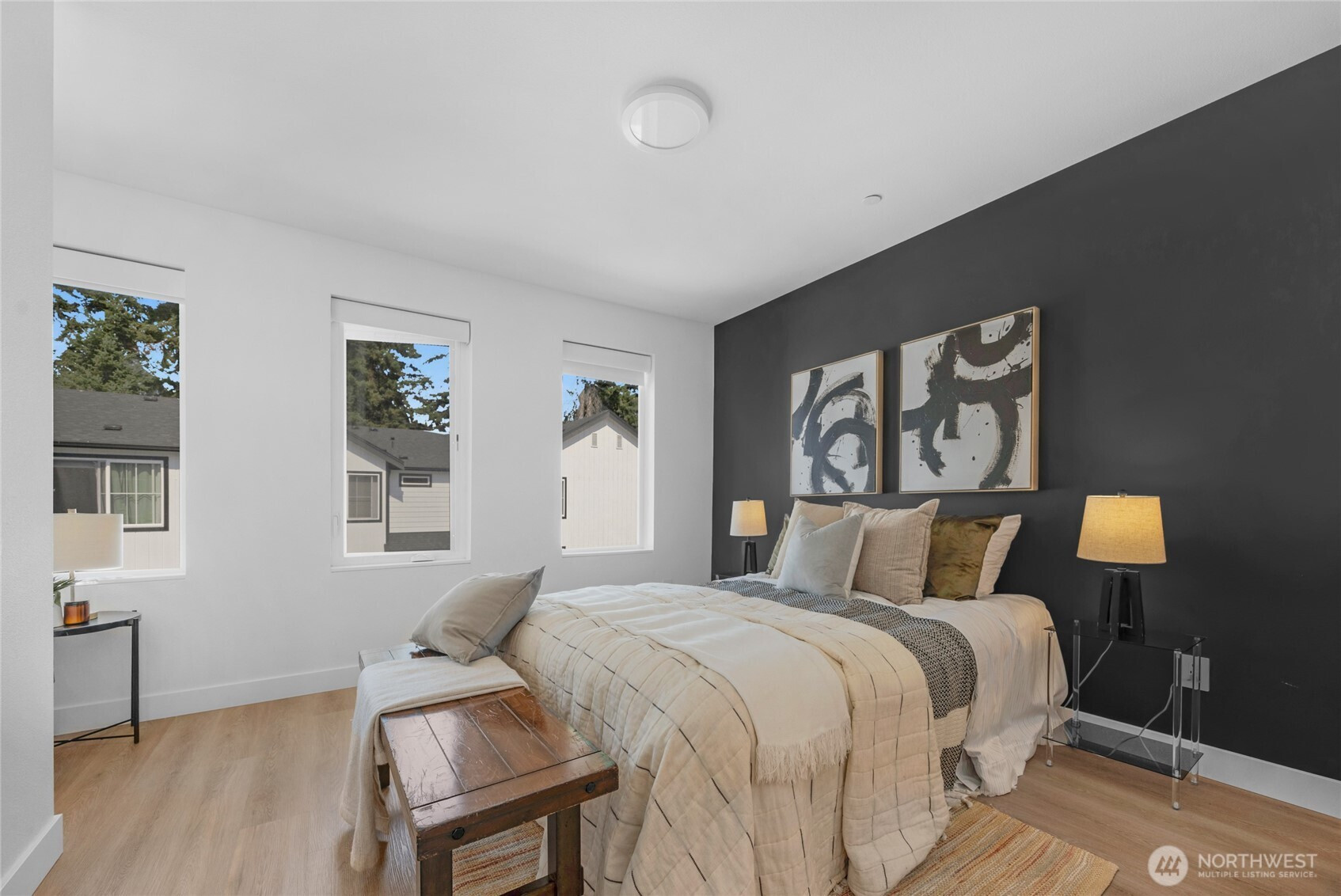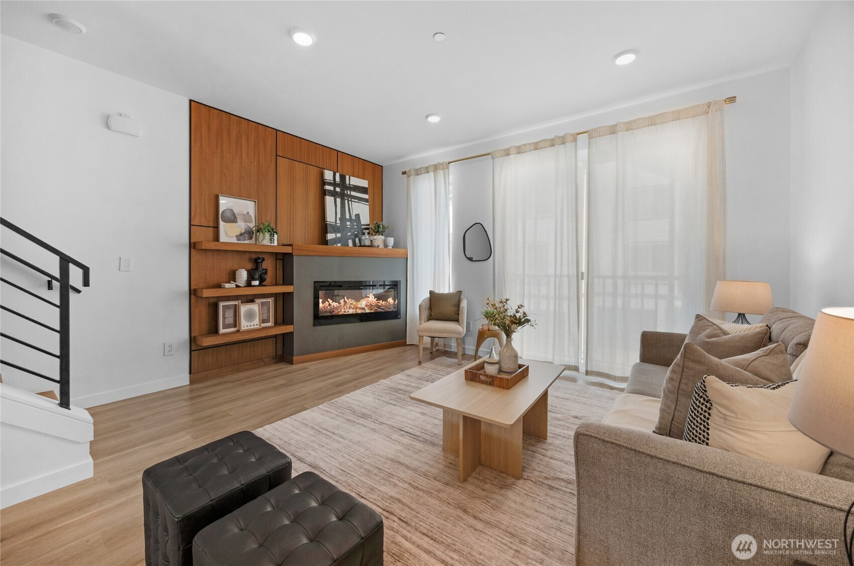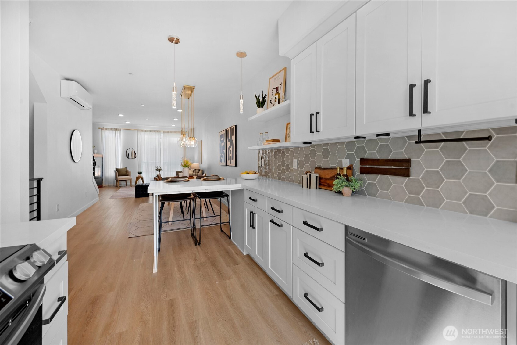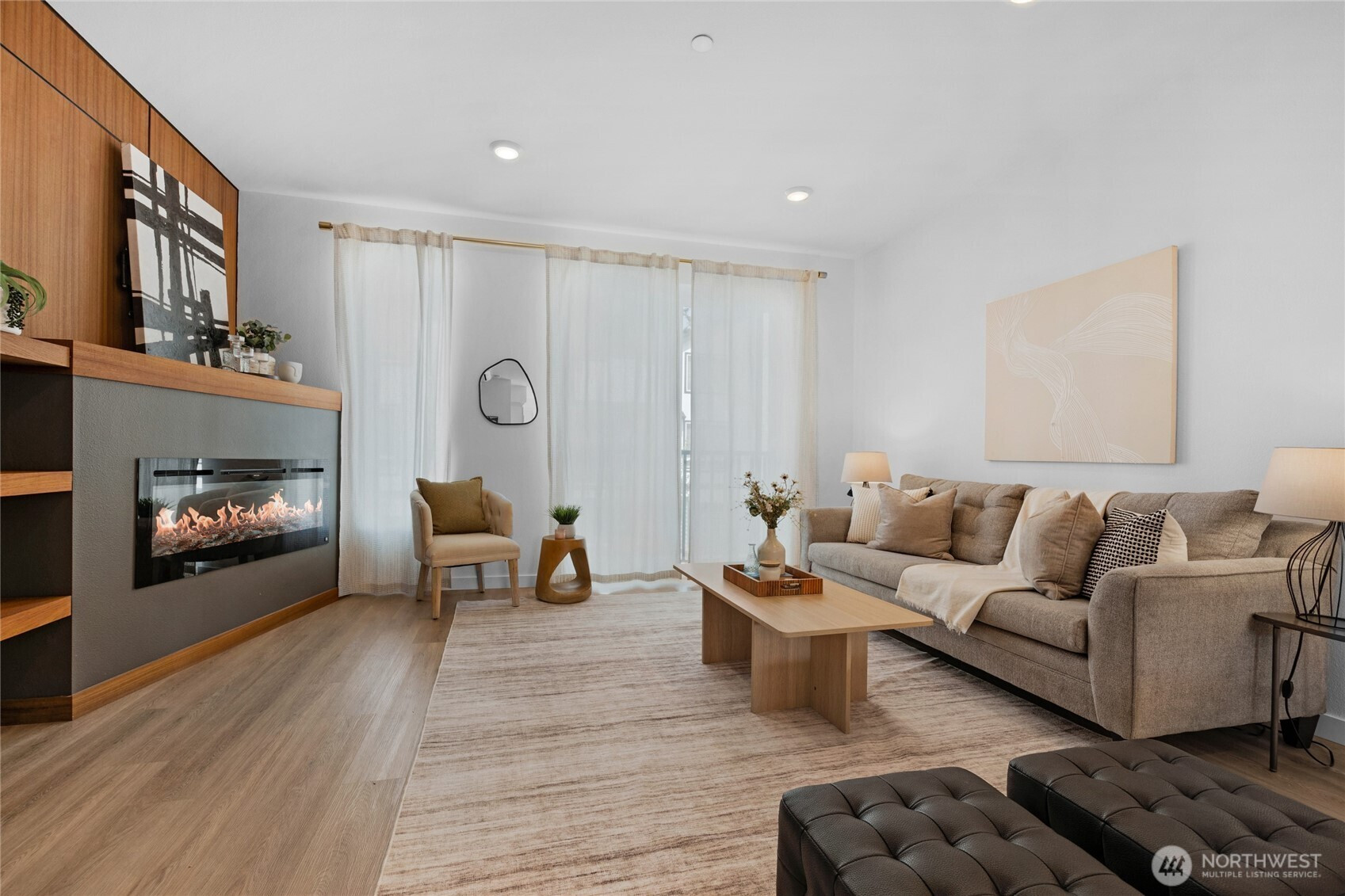Fresh, flexible, and perfectly placed, minutes from commuter routes, light rail, restaurants & parks—your ideal urban-suburban launchpad in Shoreline awaits. This modern townhome lives large with bright open flow and contemporary finishes throughout. A barn-door enclosed flex space off the garage is perfect for an office, gym, or studio. The sleek kitchen features stainless steel appliances, quartz counters, and ample cabinet space including pantry space —ideal for both everyday living and entertaining. The primary suite includes a deep California closet, and each bedroom enjoys its own private bath. **Buyer Bonus: $10,000 incentive available!**