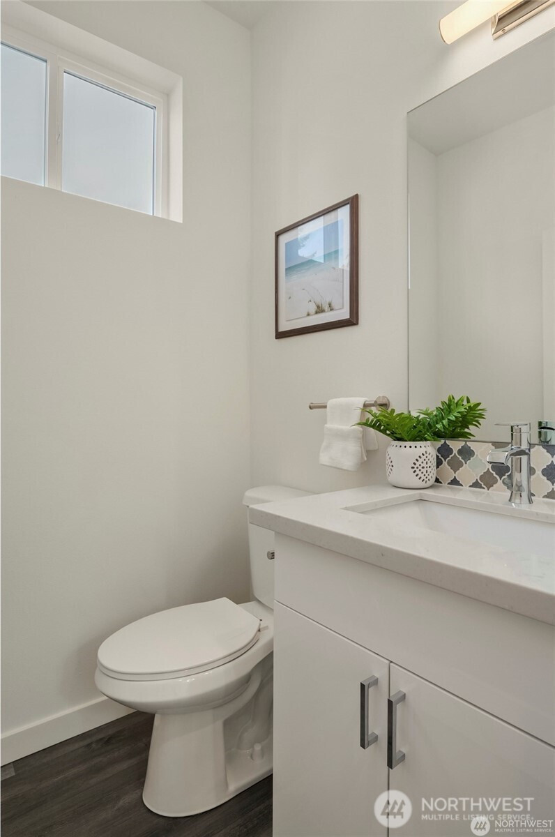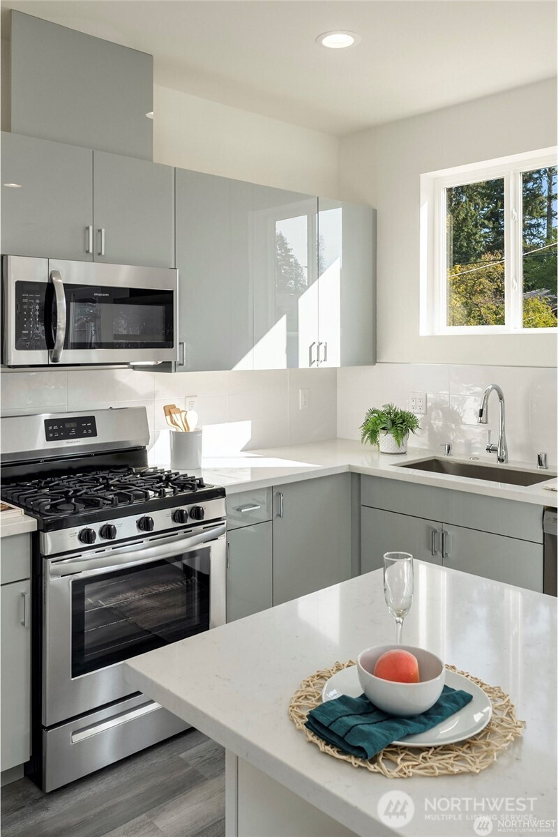 Eco-friendly 4-Star Built Green townhome! Boasts an open layout, 9-foot ceilings, fire sprinklers, ample windows, LVP flooring, smart Ring doorbell, dual-car garage with programmable keypad, on-demand tankless water heater, and a (96%) high-efficiency furnace. Kitchen features quartz countertops, stainless steel appliances, gas stove range, soft-close cabinets, and floating shelves. Upper level includes 3 Bedrooms and 2 Baths, with the Master Suite offering a spacious double shower, dual sinks, and extra closets. The 12x19 ft rooftop deck is ideal for unwinding and entertaining. Proximity to shopping, bus lines, upcoming light rail, Costco, Trader Joe’s, and I-5. Less than 10 minutes to beaches, parks, golf, and schools.