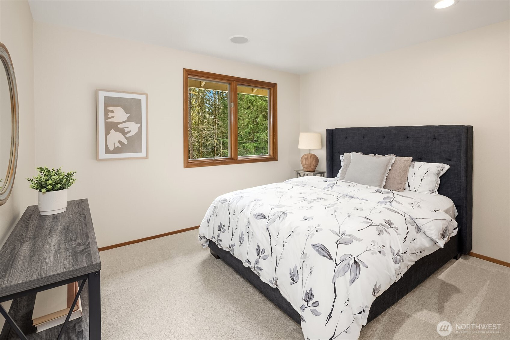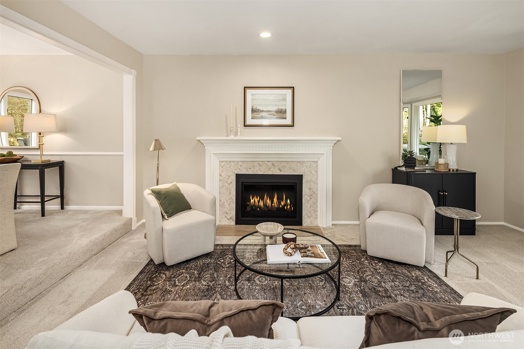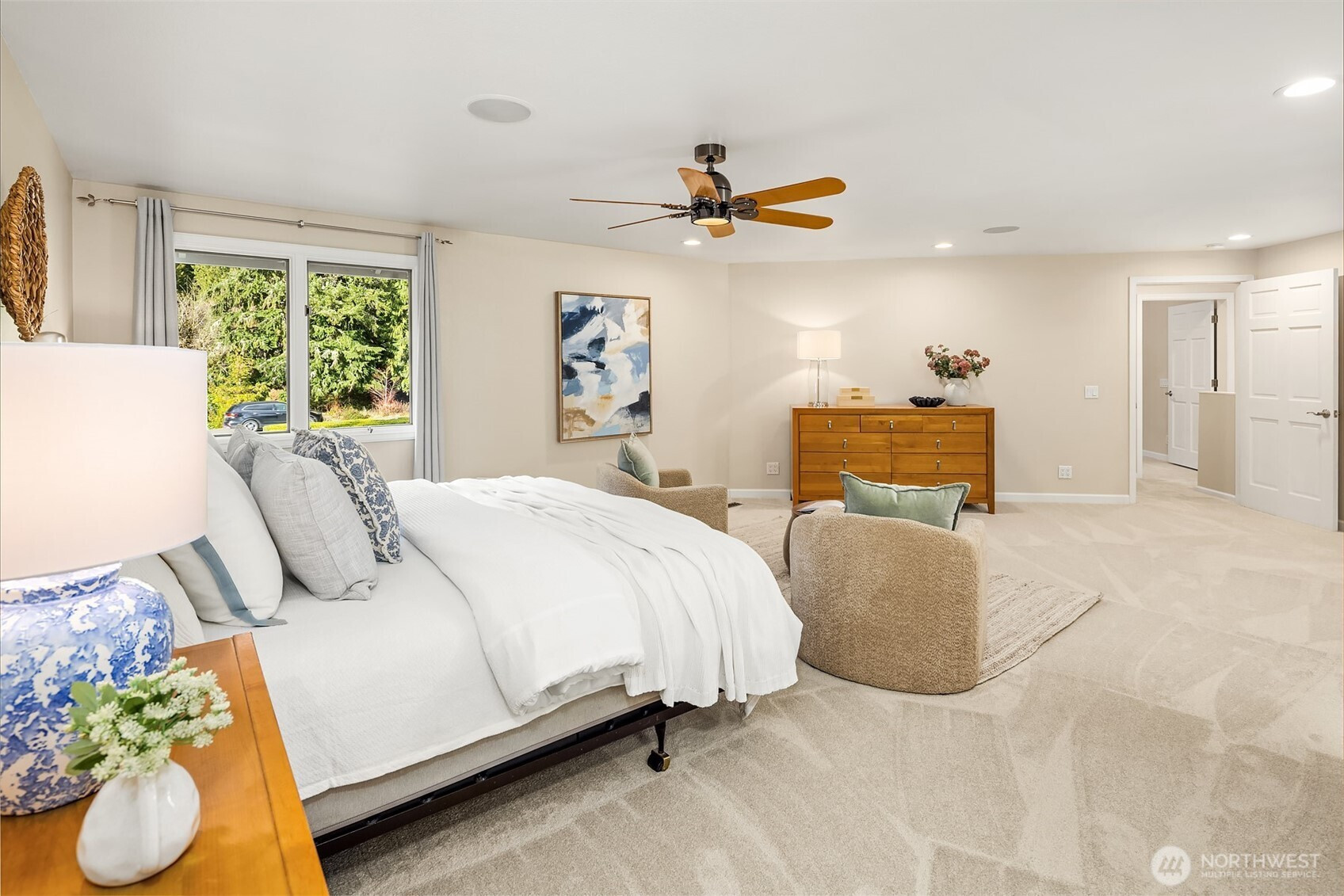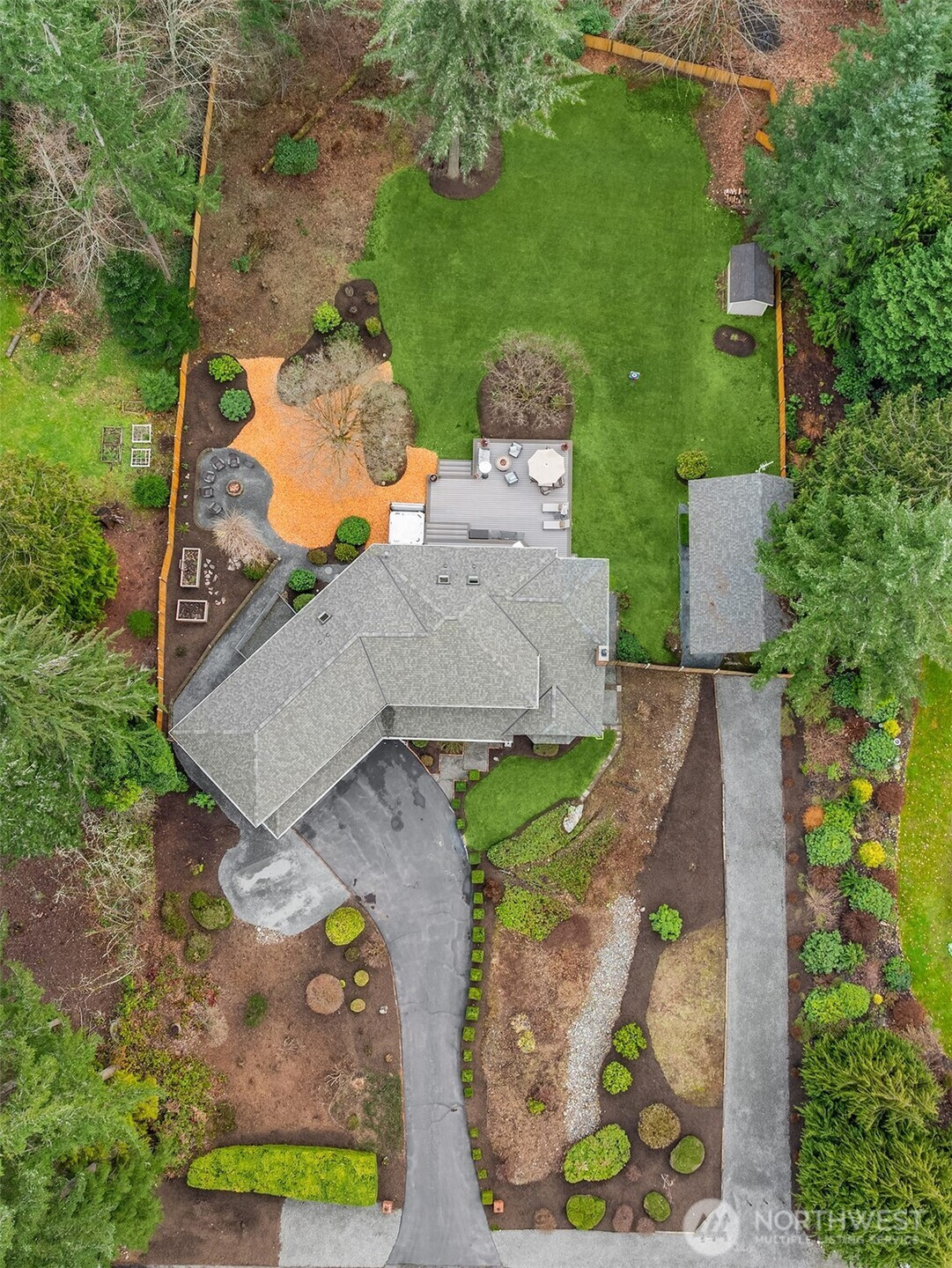 Refined Northwest living in a private, estate-like setting. Nestled within a serene Woodinville enclave surrounded by towering evergreens, this beautifully refreshed residence offers rare privacy and expansive, usable grounds. Set back from the street and approached by a sweeping driveway with manicured landscaping, the home feels tranquil yet connected.The spacious kitchen anchors the main level with generous counter space, abundant cabinetry and seamless flow to gathering areas and outdoor living spaces, ideal for entertaining. Fresh paint and new carpet provide a crisp, move-in-ready interior.Outdoor living shines with an expansive Trex deck, secluded hot tub, dedicated firepit lounge and a level lawn framed by mature evergreens for exceptional privacy. Upstairs, the primary suite features a fully renovated spa-inspired bath with quartz surfaces, dual vanities, soaking tub and oversized glass shower. Convenient to Woodinville, Redmond and Bellevue.