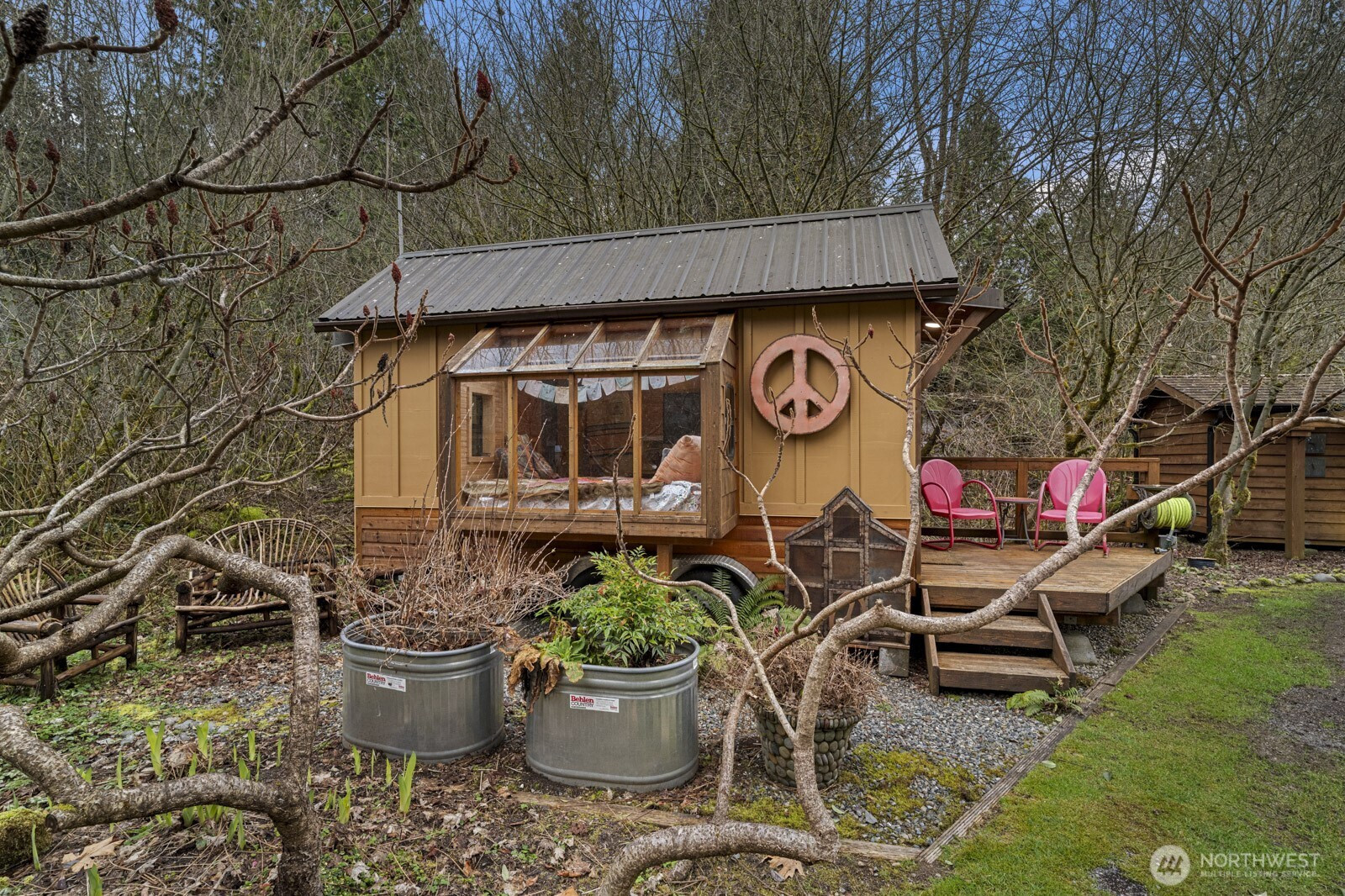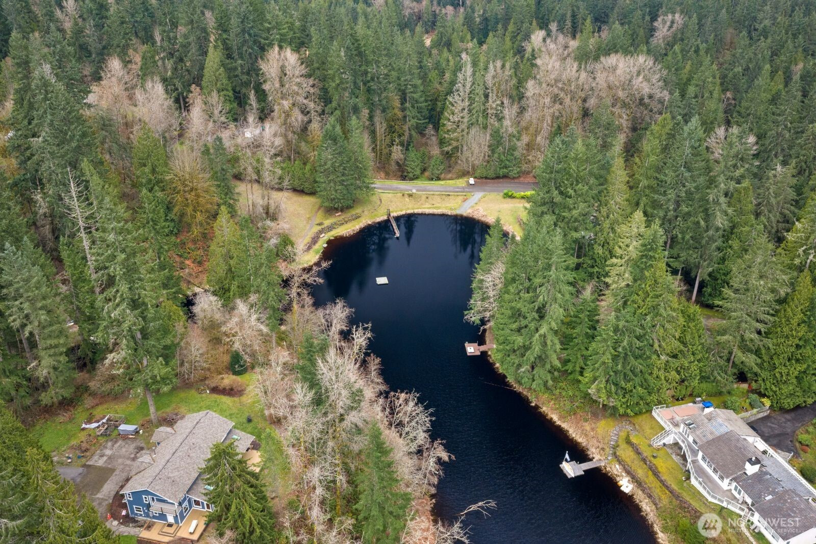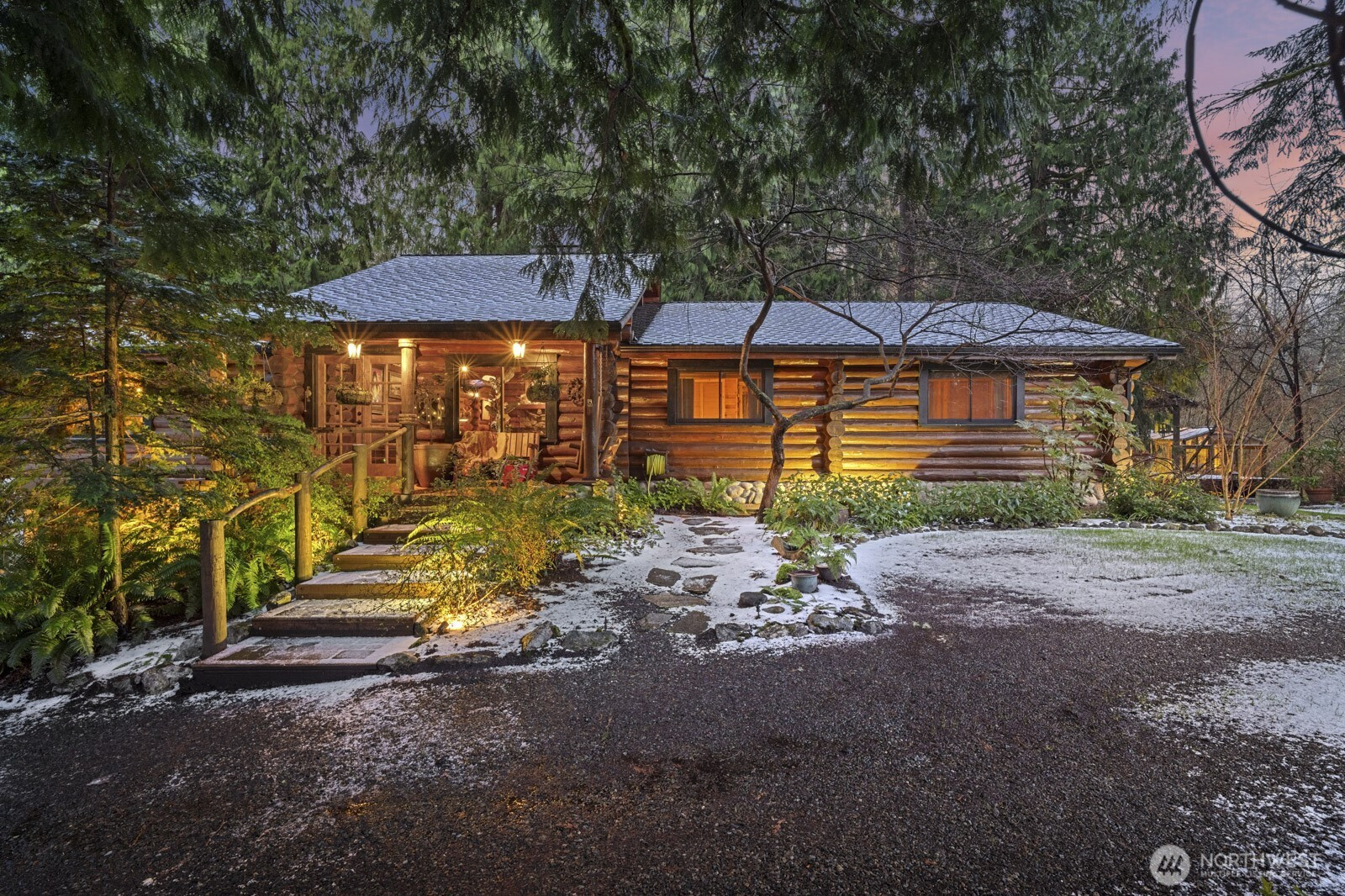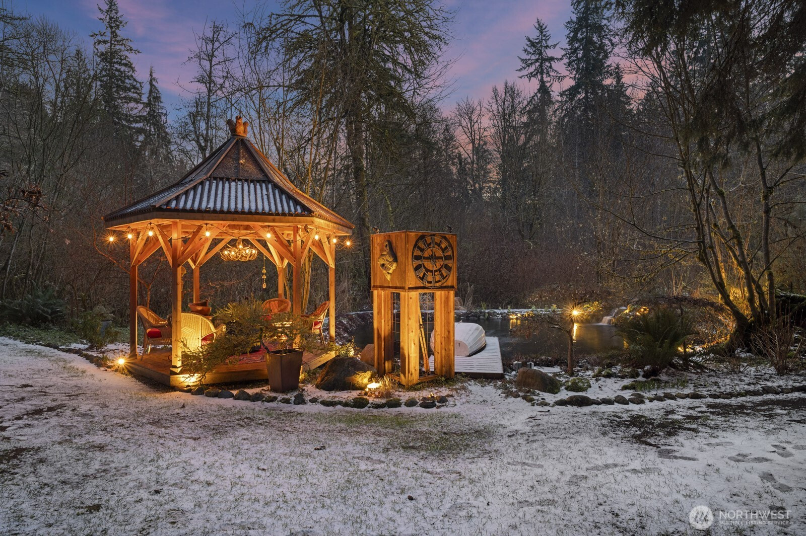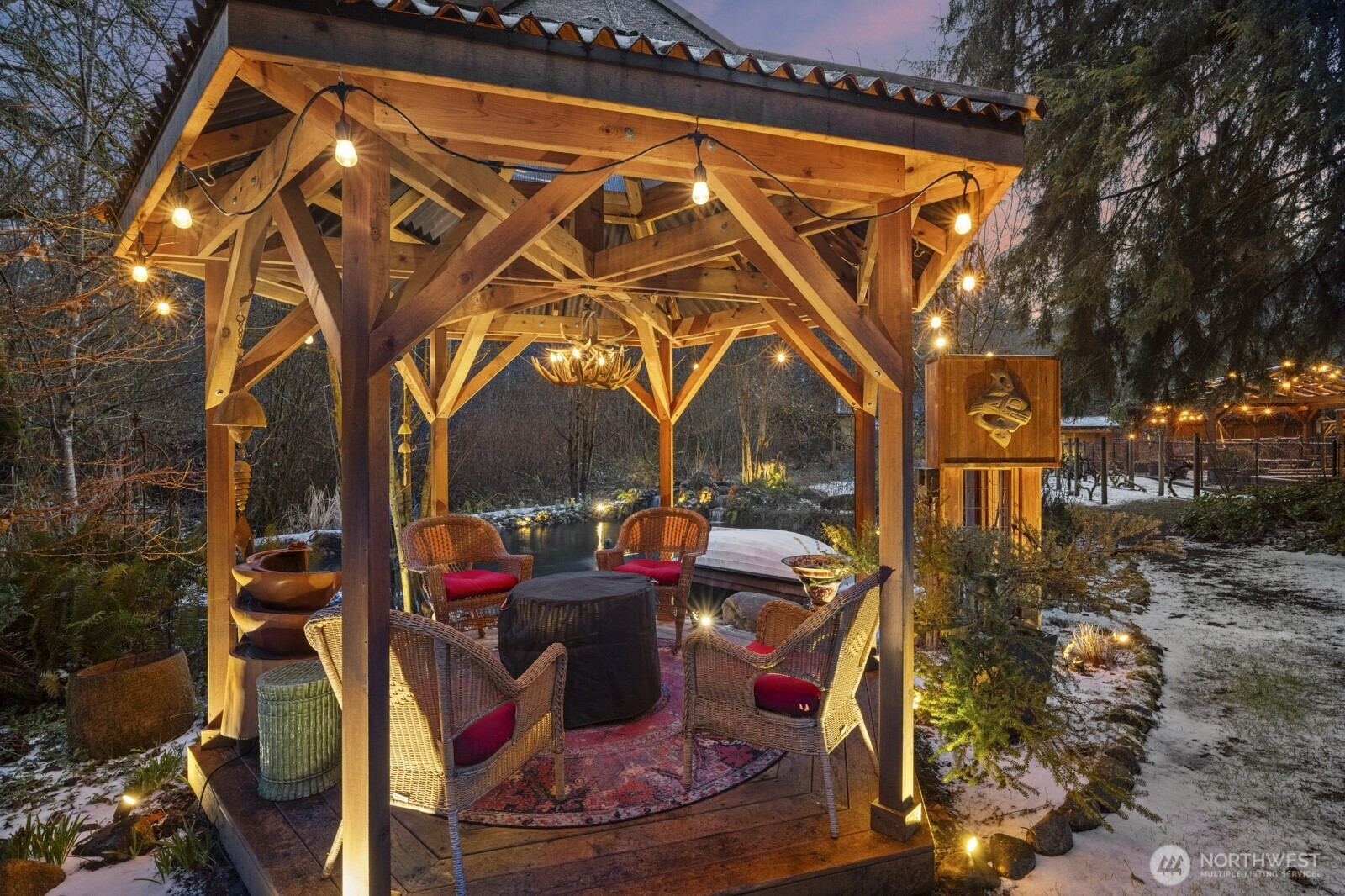 Spacious log lodge–style home in Woodinville’s sought-after, gated Lake Tuck community. Set on a shy 5-acre parcel, this exceptional property offers remarkable privacy and an array of outdoor amenities. Covered deck with fireplace overlooks a serene wooded setting, while wrap-around decks invite year-round entertaining and relaxation. Wander the grounds to discover waterfalls and pond with charming gazebo, vineyard and gardens illuminated by enchanting night lighting. A sport court is ideal for pickleball. Unwind in the hot tub or lounge in the detached tiny home. Inside, vaulted gathering spaces showcase reclaimed wood floors and inviting fireplaces that create warmth and character. A loft / office provides a quiet retreat, while the open lower level offers versatile flex spaces for recreation, media, or hobbies. Enjoy the benefits of a private lake community and the highly rated Northshore School District, all within convenient reach of the Eastside. A rare opportunity for peaceful living without sacrificing proximity to city amenities.