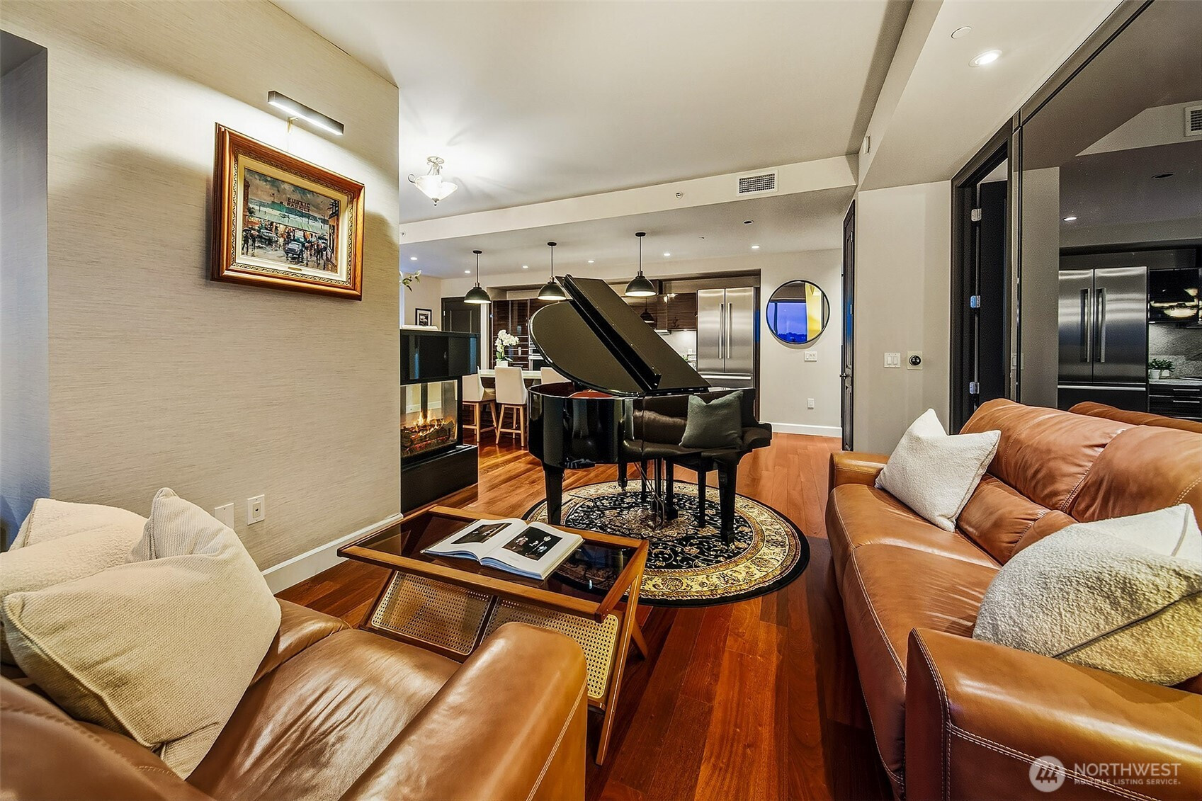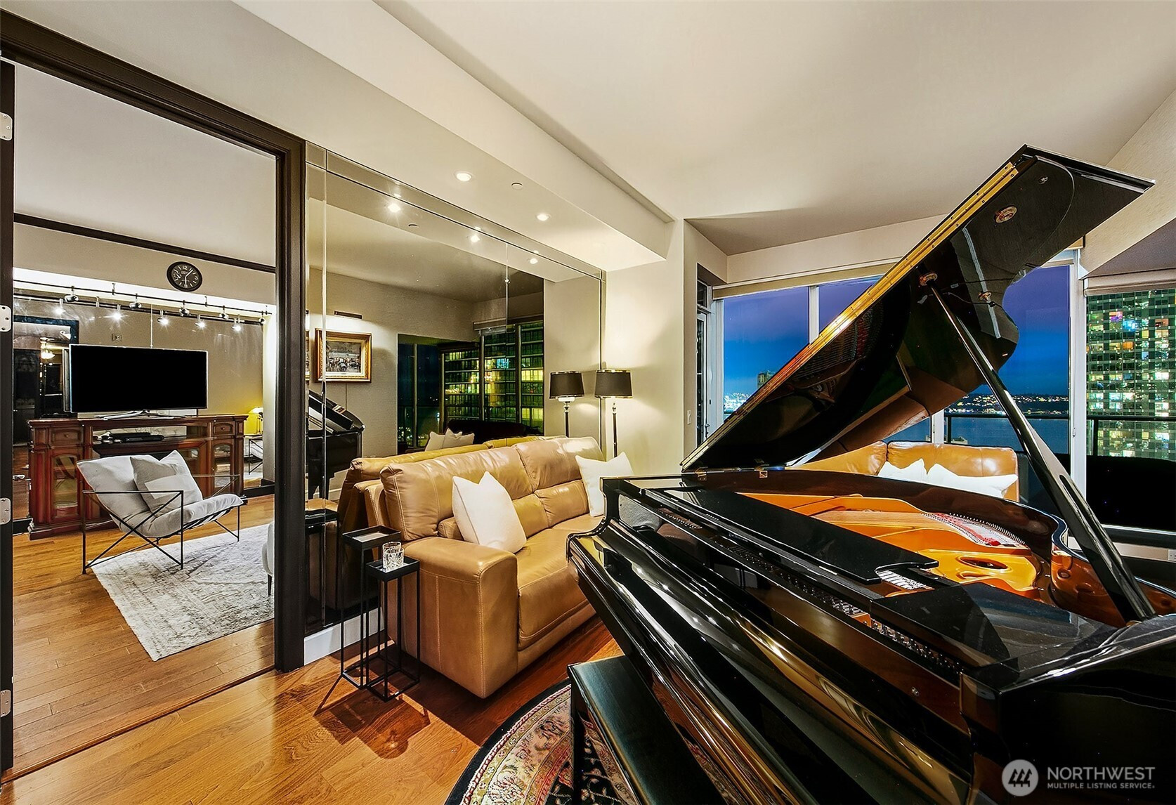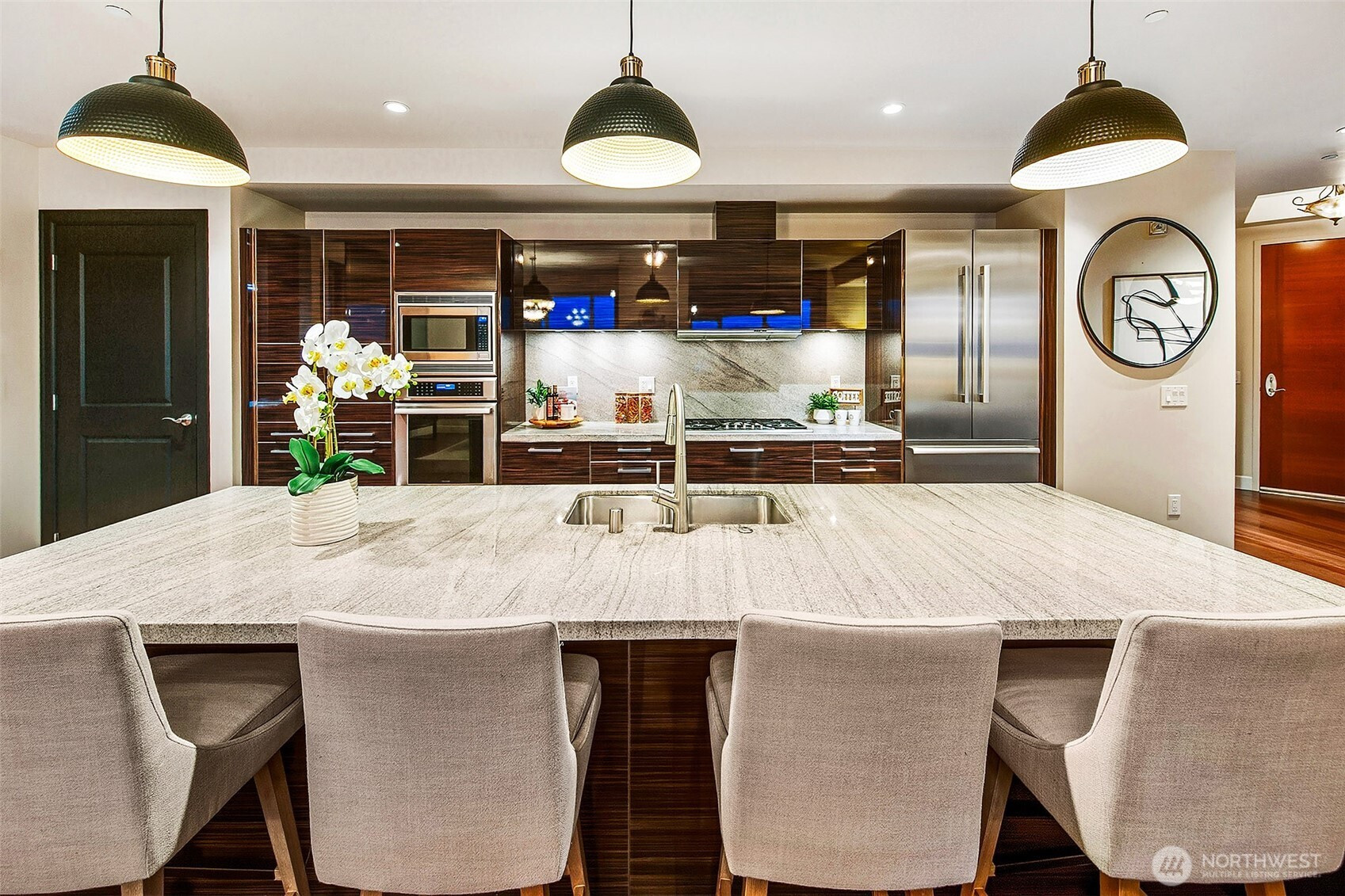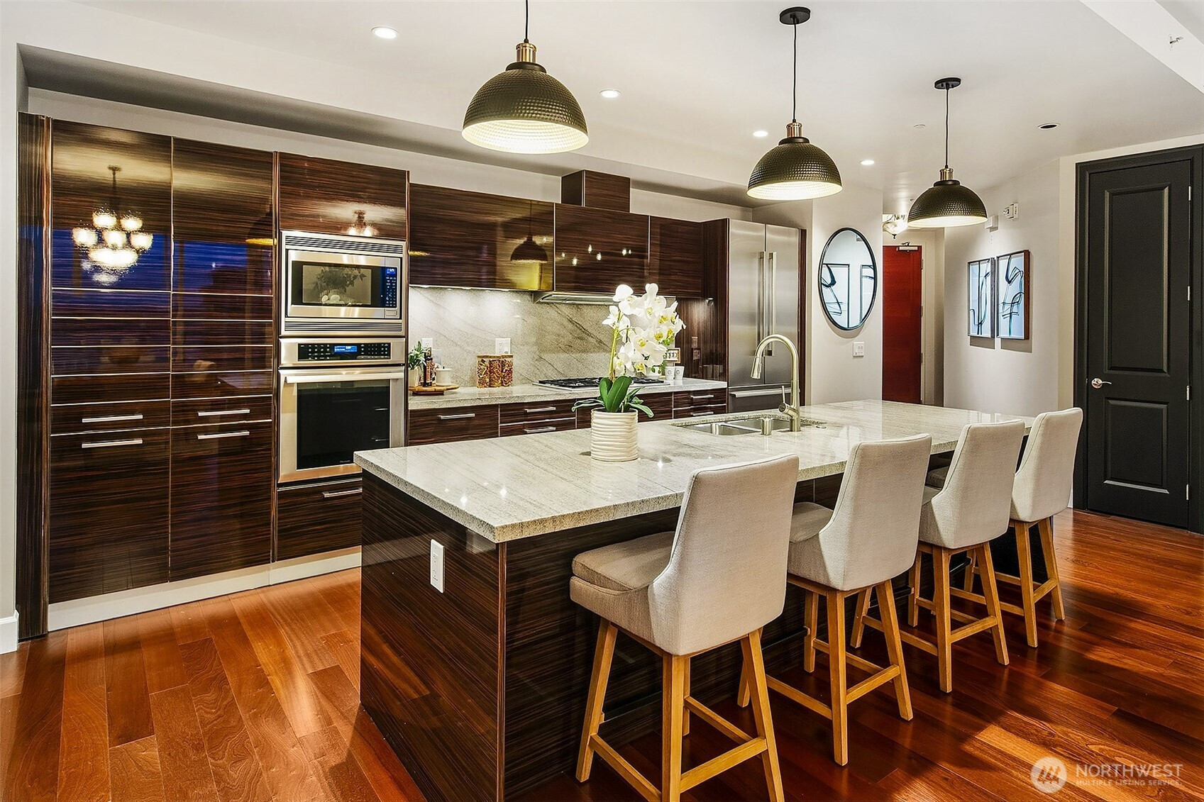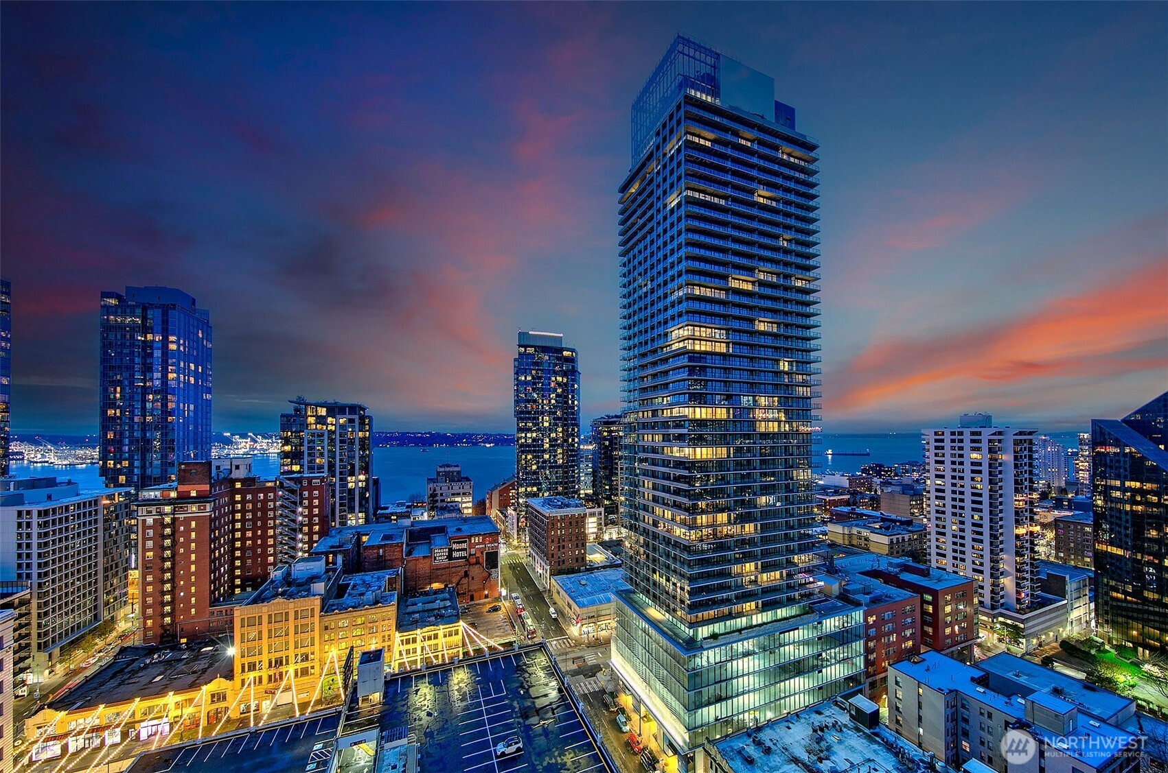 Penthouse style luxury at Escala- 23rd floor Coveted Private Vestibule near 2000 sqft- west facing water,city & mountain views.Only 10 of these floor plans in ESCALA. Unwind to the evening glow of city lights & dreamy sunsets, flanked with walls of floor to ceiling windows. Sun drenched by day -sparkling by night. Designer touches through out the home, beautiful open-concept design lovely flow between living, dining, & kitchen. Oversized slab stone island, gas cooking & cozy gas fireplace. Enjoy 2 oversized primary suites- spa like bath, amazing wardrobe room. Hardwoods throughout home.World class building & Location 24/7 staff on site- be sure to ask about all amenities.2 lap pools,sauna, fitness center.2pk 1stg.Ev capacity.