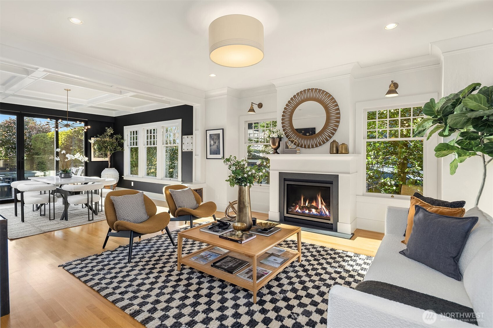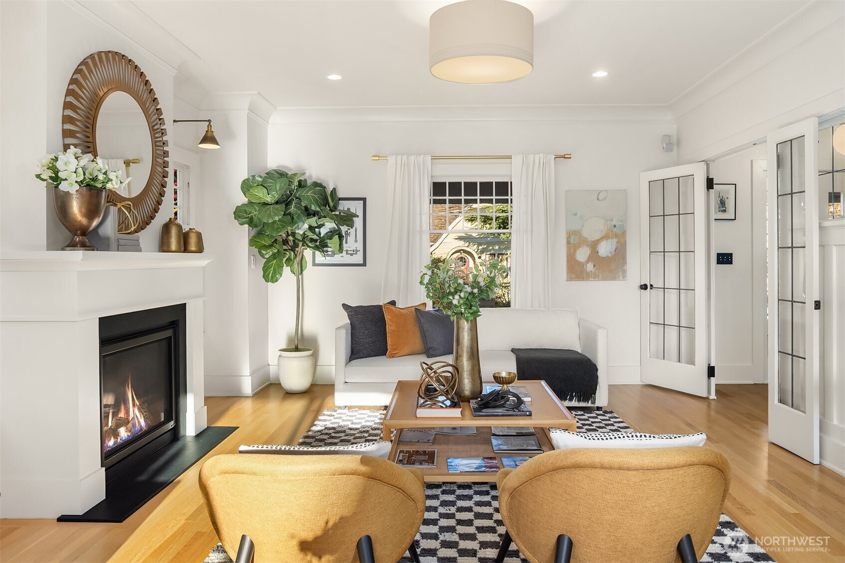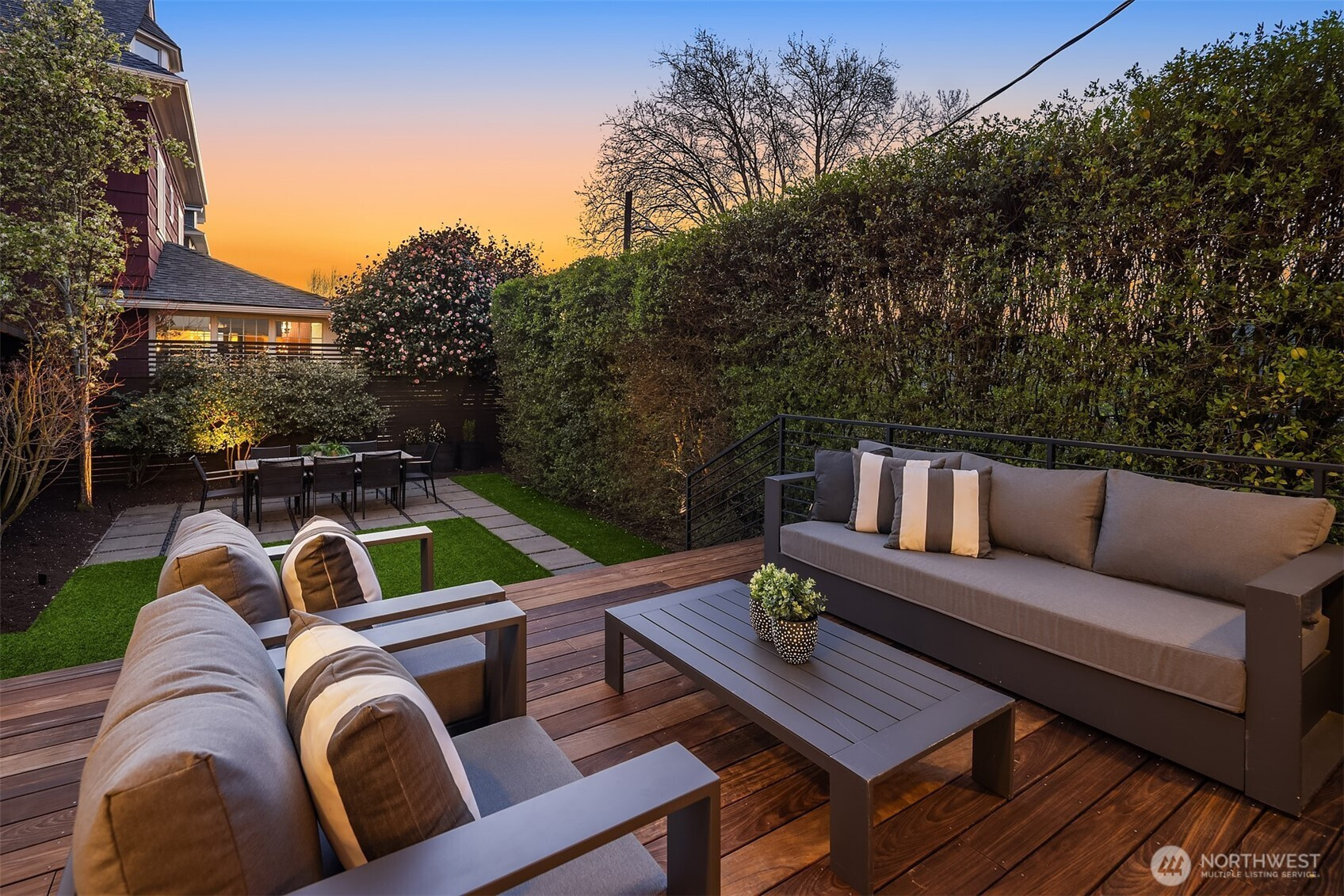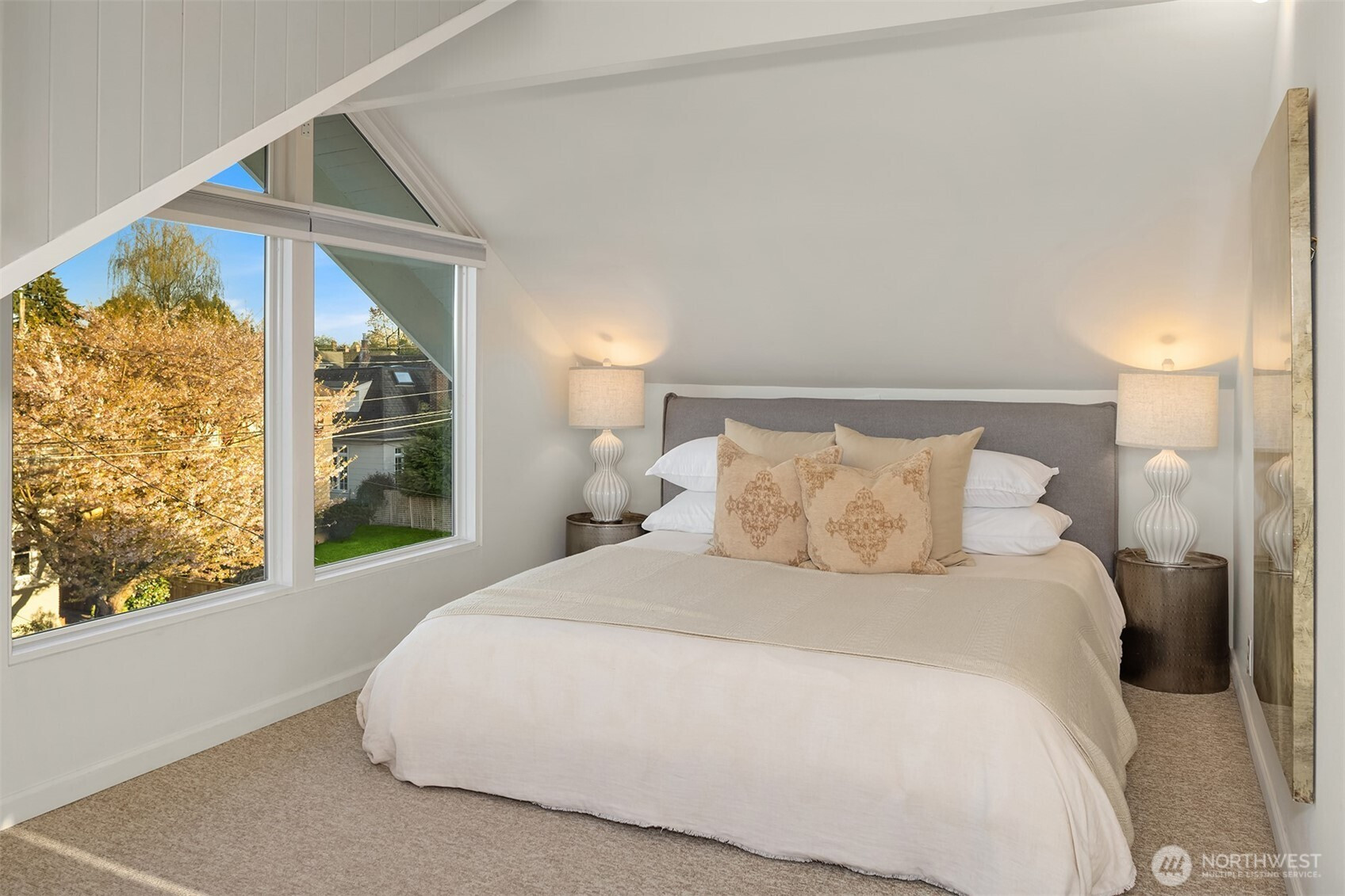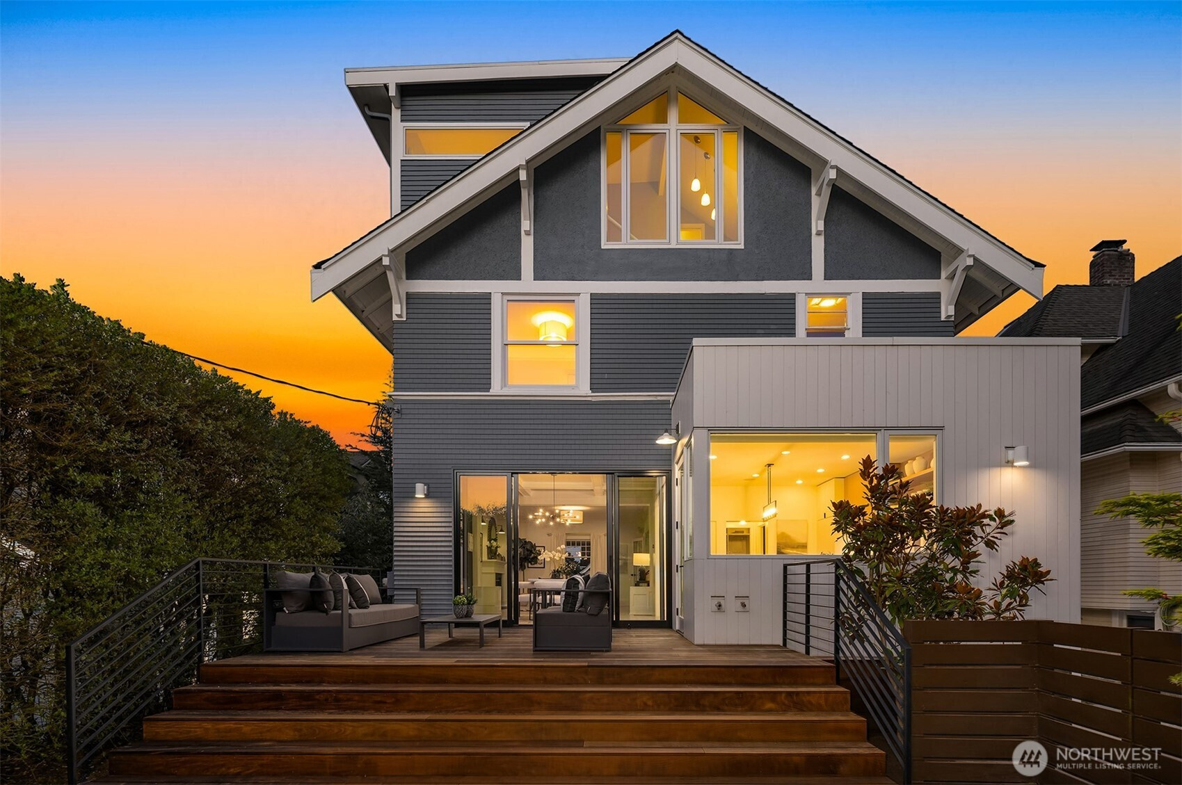 Breathtaking 270-degree views of the Olympics, Cascades, Mt. Baker, and Lake Washington. Modern finishes throughout. This is North Capitol Hill at its finest: a meticulously maintained 1910 Craftsman with all its original charm, thoughtfully renovated by award-winning Board & Vellum in 2018. A wide covered front porch welcomes you into a light-filled interior where timeless architecture meets refined updates. Glass doors open to an ironwood entertaining deck overlooking a secluded backyard for effortless indoor-outdoor living. The kitchen anchors the main floor with a waterfall-edge island, custom cabinetry, quartz counters, Liebherr refrigerator, and Miele dishwasher. A private office and powder room complete the level. Upstairs, newly refinished fir floors lead to three spacious bedrooms and a full bath. The top-floor primary suite offers something few homes can match: sweeping mountain and water views framed by all-new Marvin fiberglass windows, with a walk-in closet and en-suite bath. In the finished basement, an apartment-style suite features a family room with built-in surround sound, a second kitchen, bedroom, bathroom, laundry, spaces for home gym and wine cellar, with a private exterior entrance ideal for guests or multigenerational living. Nest-controlled heating and A/C, spacious carport with storage, and a shared driveway. Steps to several local parks, independent cafés, and excellent private schools, with easy access to both I-90 and SR-520 highways.