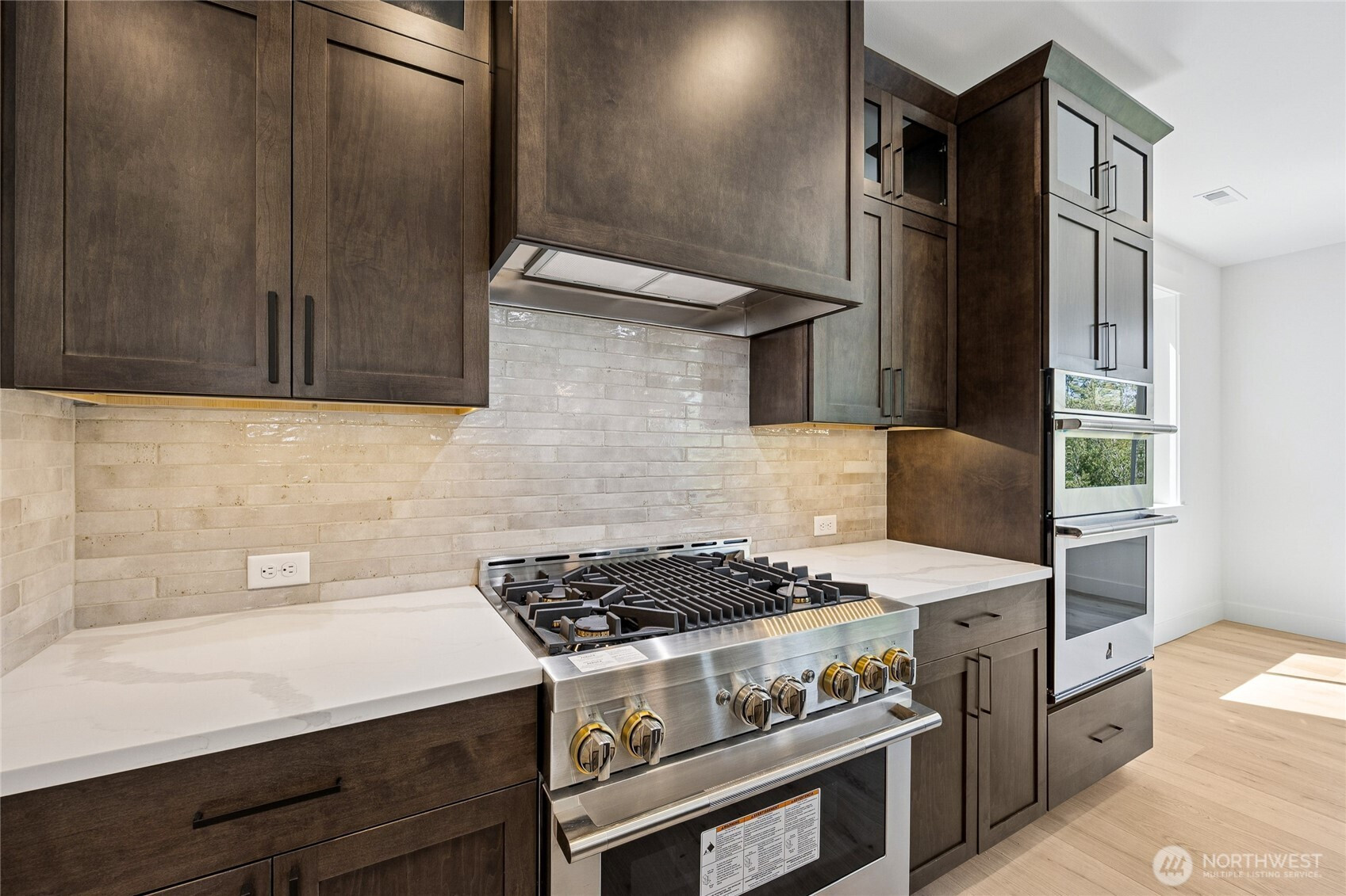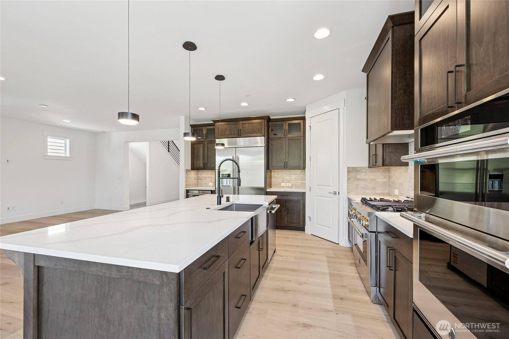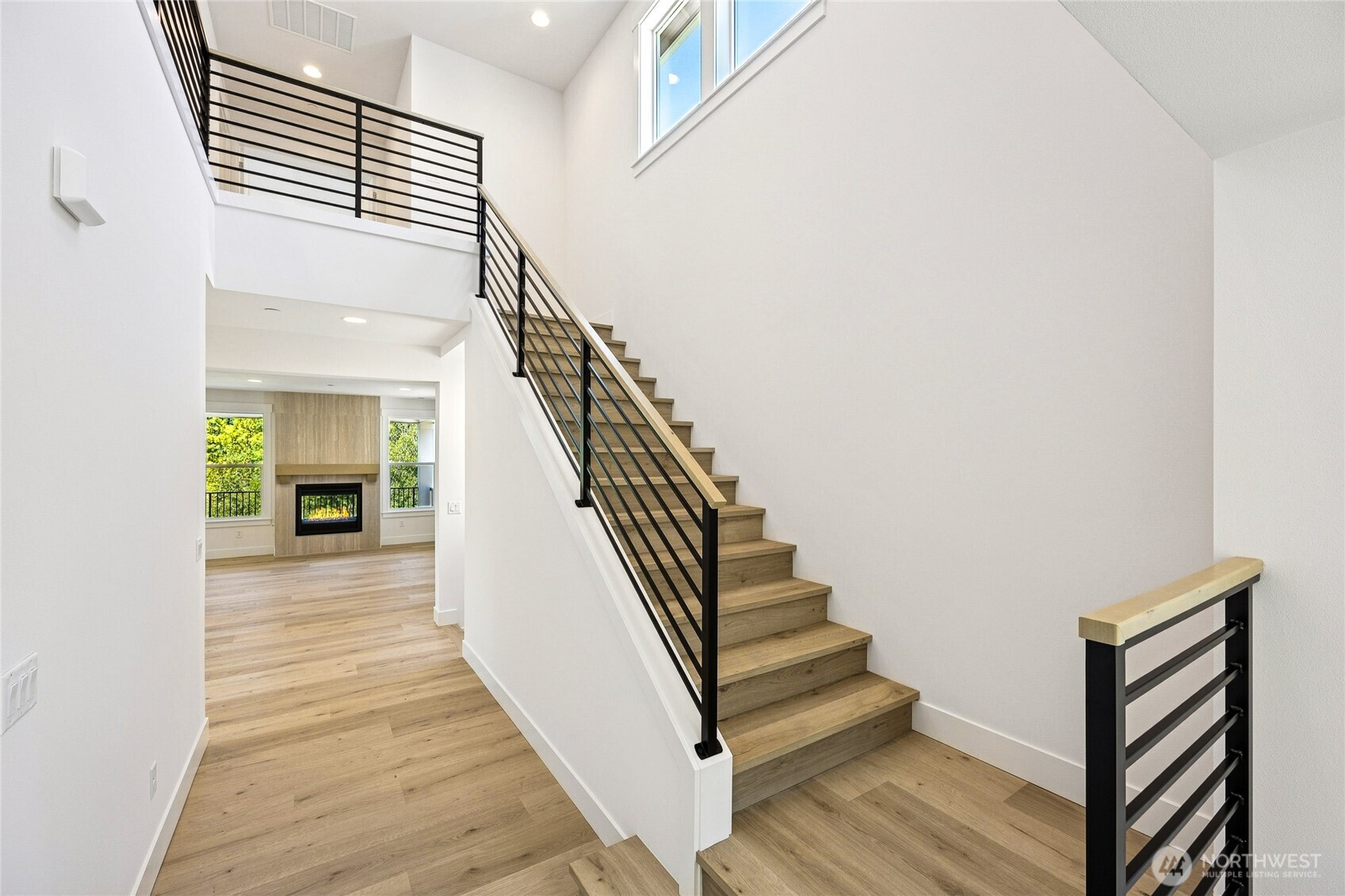 Our largest plan w/3921 sq ft of flexible living, backs to NGPA. Main floor offers spacious great rm w dramatic double-sided FP, covered outdoor living & peaceful views. Spacious kitchen w/quartz counters, soft close cabinetry, pull out shelves, JennAir Rise appliances w refrigerator included, pantry, & bev fridge. Office/den & 1/2 bath round out the space.2nd floor Primary w peaceful views. Ensuite has heated floors, floating vanity, backlit mirrors, huge shower, soaking tub, & 2 custom closets. 3 more BRs, full bath, large bonus rm, & utility rm. Lower-level Walk out basement w rec rm, 5th BR, 3/4 bath, and covered deck w yard access. 2 car garage, full fence, EV charger, AC/heat pump. Northshore SD & easy access to Seattle & Eastside.