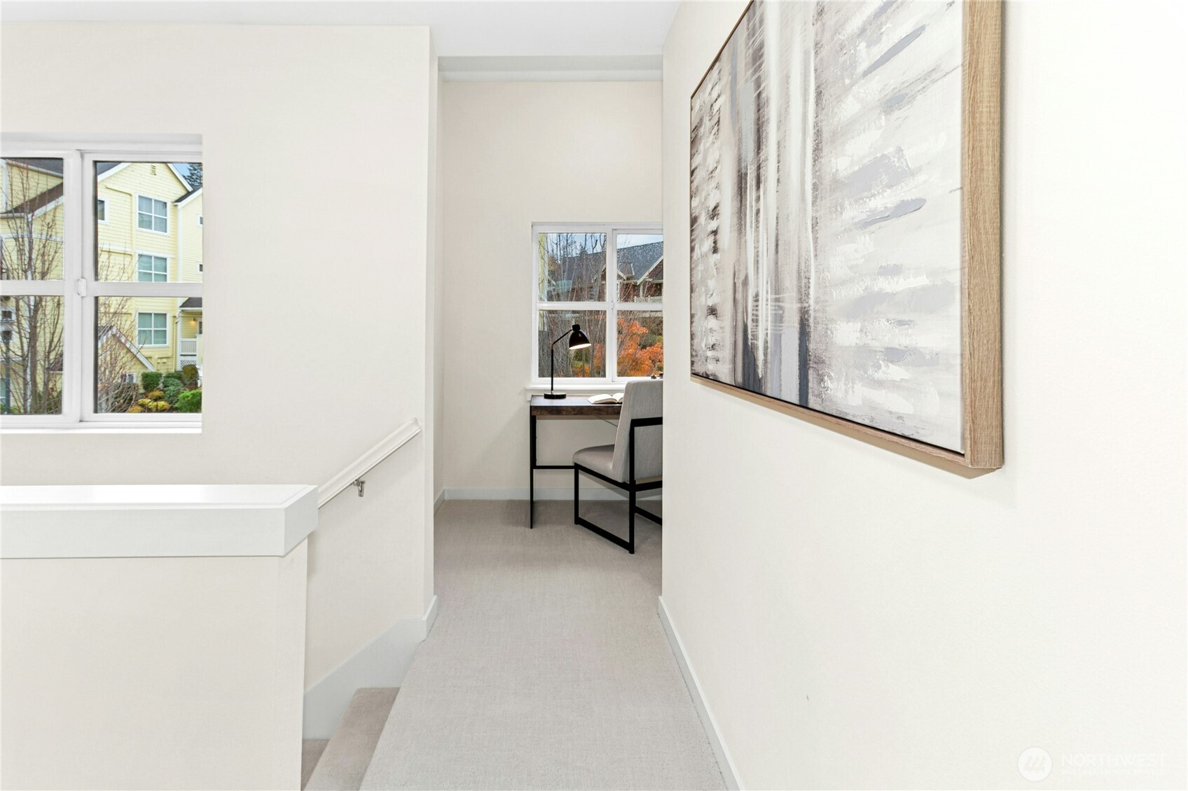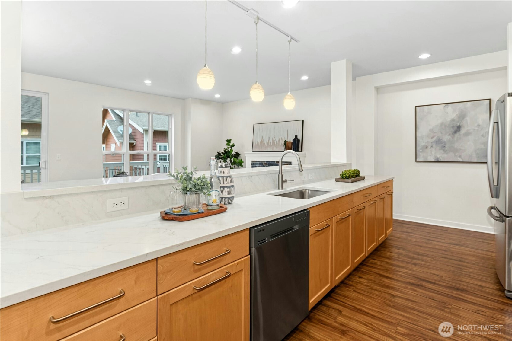 Welcome to Crofton Springs in the desirable Issaquah Highlands! This beautifully refreshed townhome offers open-concept main floor living perfect for entertaining and large gatherings. Enjoy modern updates throughout, including new carpet and paint, quartz countertops, stylish lighting, stainless steel appliances, engineered hardwood floors, and a cozy electric fireplace. Upstairs features a primary suite with a large walk-in closet and private bath, a second bedroom and full bath, plus a versatile bonus area ideal for a home office or reading nook. Take in mountain views and appreciate the oversized two-car garage. Close to Grand Ridge Elementary, Zeek’s Pizza, trails, shopping, dining, and entertainment.