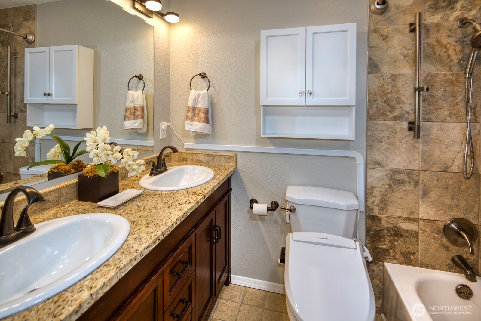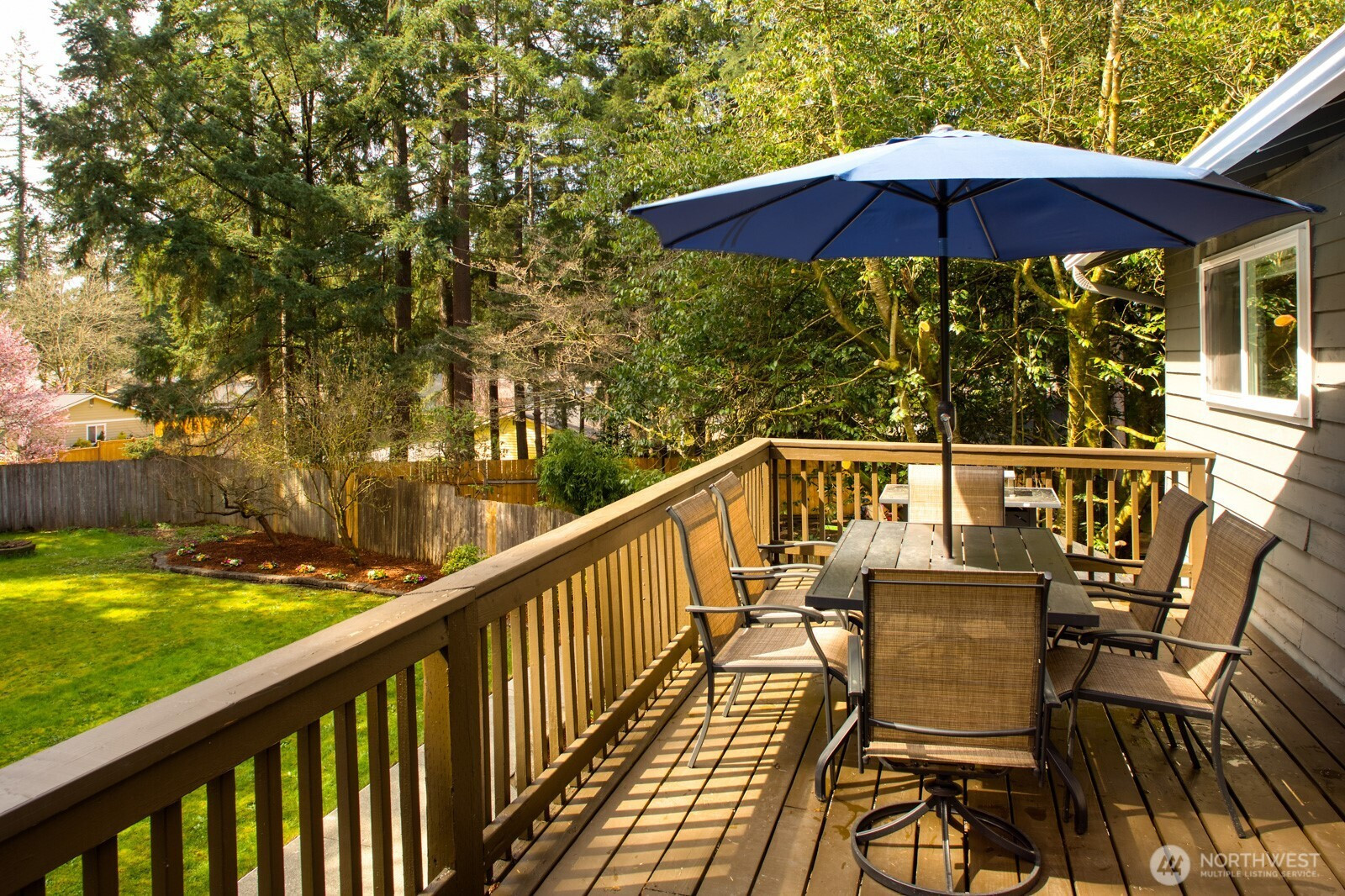 Fabulous Home with Expansive Backyard and Modern Upgrades. Welcome to this inviting three-bedroom, two-and-a-half-bathroom home, thoughtfully designed for comfort, entertaining, and functionality. The open layout seamlessly connects the kitchen, dining, and living areas to a spacious outdoor deck, offering ideal flow for gatherings and everyday living. Enjoy brick fireplaces on two levels, main-level bedrooms with a full bath, and a guest half bath for added convenience. The updated kitchen features a brand new gas convection range, tile floors, custom soft-close cabinetry, stainless appliances, granite countertops, an island with seating, and a skylight for natural light. Glass doors open from the dining area to a large outdoor deck for dining alfresco. Built-in bookcases and a huge 80” mounted TV add movie night and game day fun to the lower-level family room. Whole-house high-speed internet and surround sound wiring on both levels provide modern amenities. A lower-level office space with an additional full bath adds flexibility for a work-from-home option. Step outside to an enormous, fully fenced backyard with a covered brick patio and a garden shed for extra storage. Extra—a brand new, 20x12 permitted outbuilding with electricity is ideal for a hobby/craft/pottery atelier, yoga studio, or man cave. This property blends warm fall and winter indoor cozy spaces and contemporary features with fabulous spring and summer outdoor living, giving it a PNW Living 5-STAR rating.