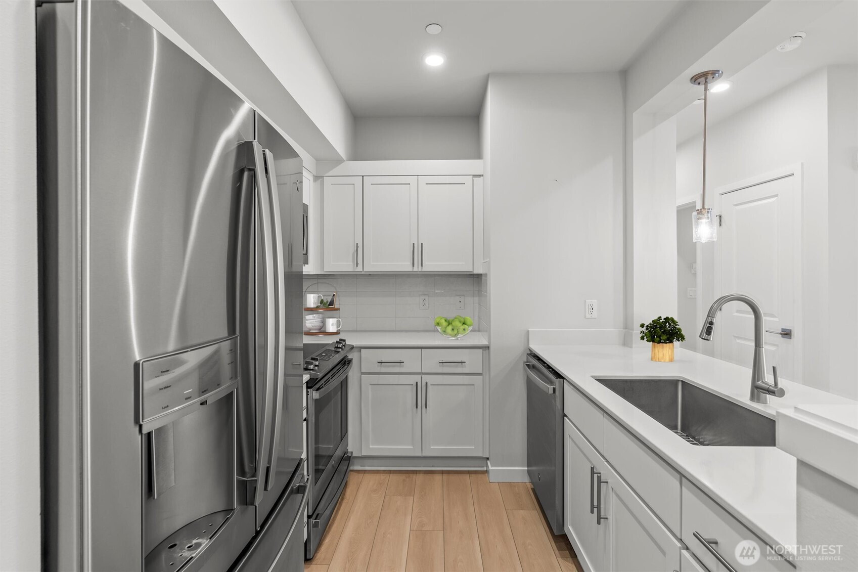 Welcome to Timberstone, where modern luxury meets an unbeatable location and outdoor adventure is right outside your door. This 2024-built corner-unit home offers elevated living with an open-concept floorplan, 9-foot ceilings, luxury vinyl plank flooring throughout, quartz countertops, stainless steel appliances, and abundant natural light. Enjoy your morning coffee or dine alfresco on the patio while taking in the fresh air and sweeping mountain views. Parking is effortless with your private garage, an additional reserved space, and ample guest parking. Just steps away, the community park features volleyball and pickleball courts, along with a covered picnic area. With easy access to the Snoqualmie Valley Trail and River—and just blocks from the shopping, dining, and amenities of downtown North Bend—this home offers the perfect blend of comfort, convenience, and Northwest lifestyle. Pet friendly complex with no rental cap.