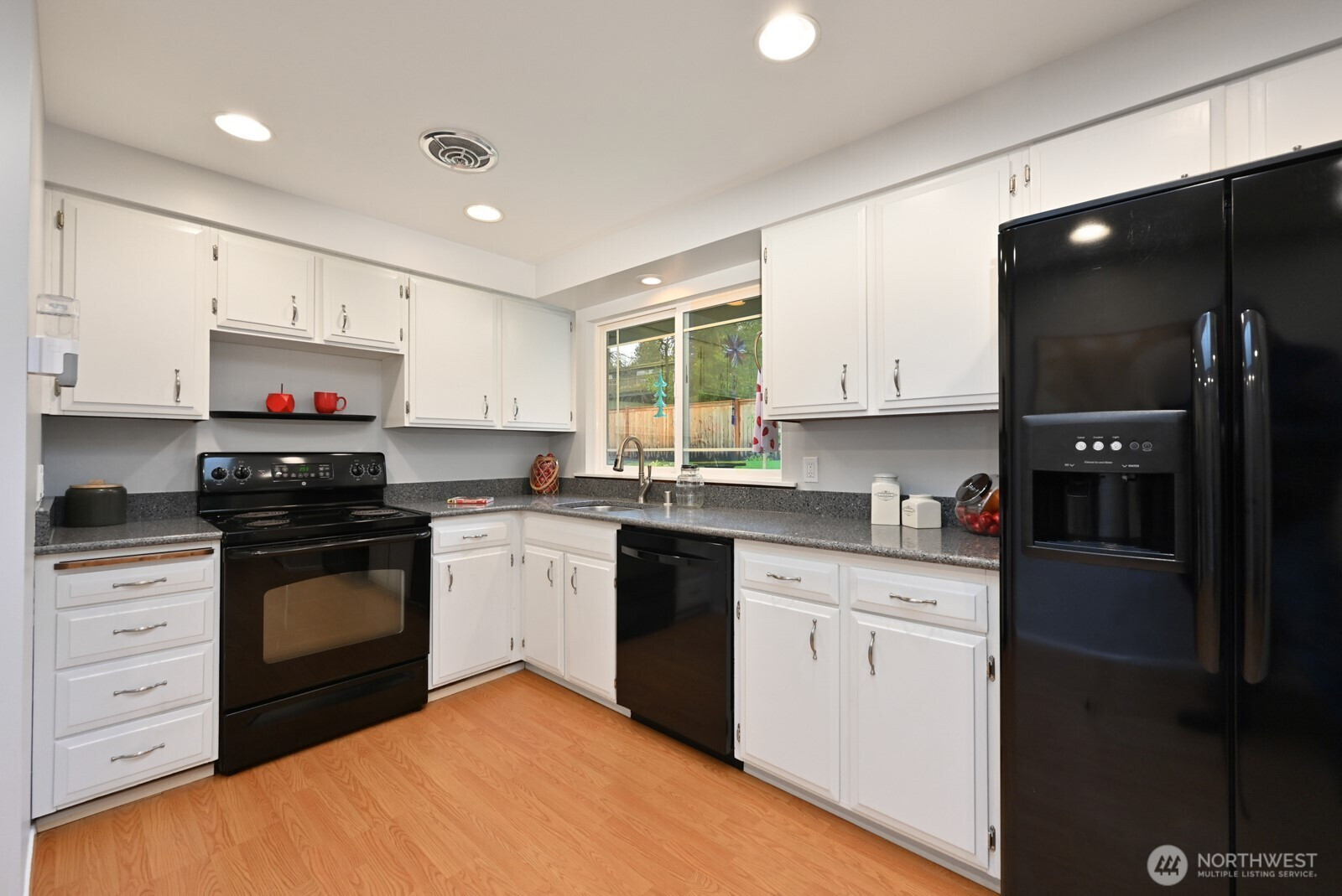 Nestled across from Syre School, this inviting Tri-Level home sits in scenic Richmond Beach neighborhood, where neighbors know each other by name. The main floor boasts hardwood floors throughout spacious living/dining areas. Kitchen includes quartz counters, eating area with view of the tranquil backyard. Step through the dining room’s sliding doors to a generous fenced backyard, patio, & Gazebo with iron firepit—ideal for morning coffee/evening fire. Designed for comfort, the home offers 3 bedrooms upstairs-including large primary with walk-in closets & three-quarter bath, hallway full bath. Downstairs is a 4th bedroom, half bath, sizable rec-room with built-in bar perfect for Game Rm/TV area. Addtl amenities include laundry room with utility sink & oversized 2-car garage with insulated garage door & plenty of attic storage space. Special Features: Energy Efficient Gas Forced Air Furnace & Heat Pump (2020), Reme Halo Zero Whole Home Air Purifier (2024), updated plumbing, 40 yr Composition Shingle Roof, Insulated Garage Door, Backyard Gazebo with Iron Fire Pit, Sprinkler System, hardwood floors under upstairs carpet, freshly Painted inside. Enjoy proximity to Richmond Beach Saltwater Park, local schools, grocery stores, & restaurants. This idyllic neighborhood is highly sought after—the opportunity awaits to make it your own!