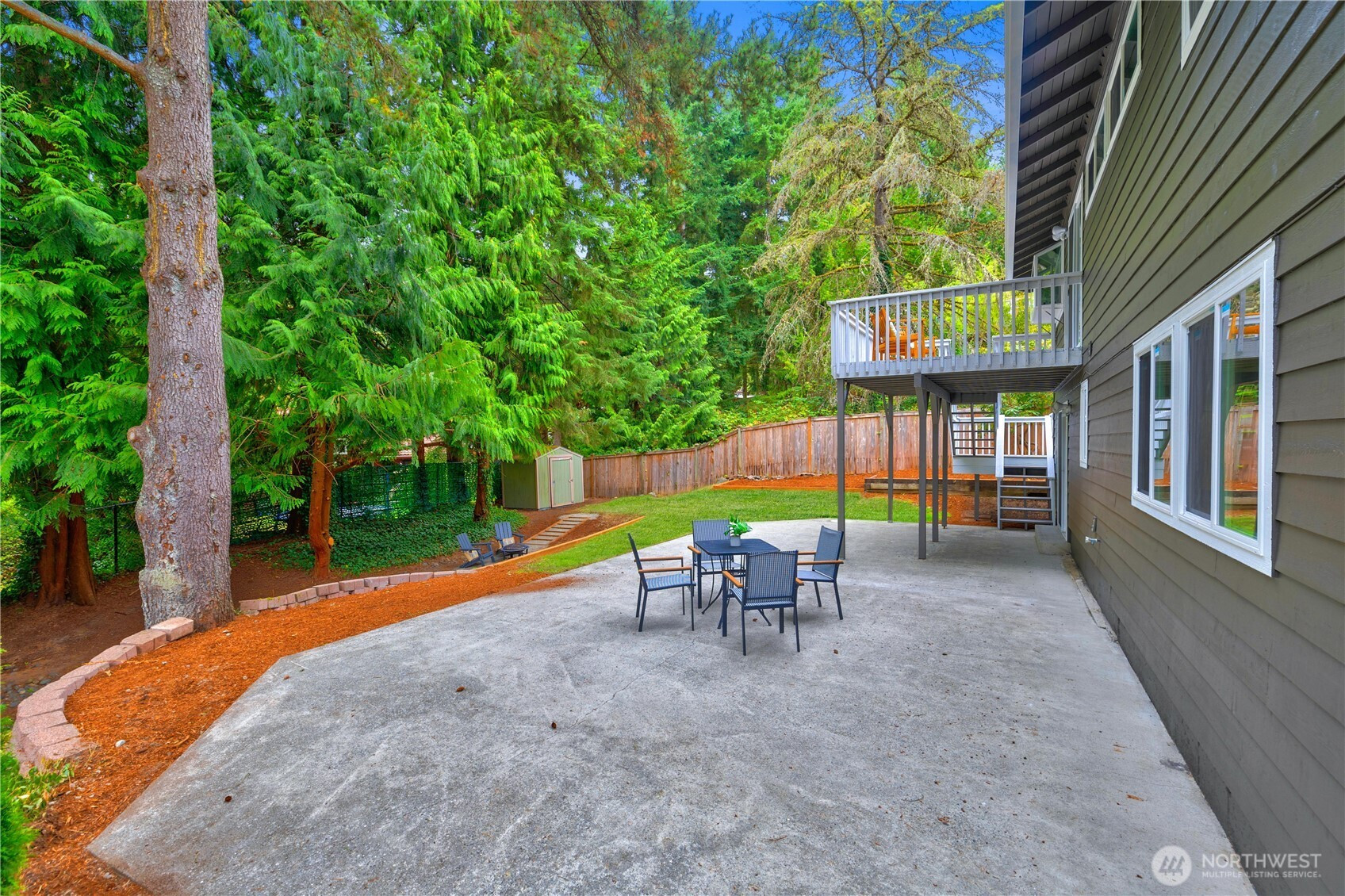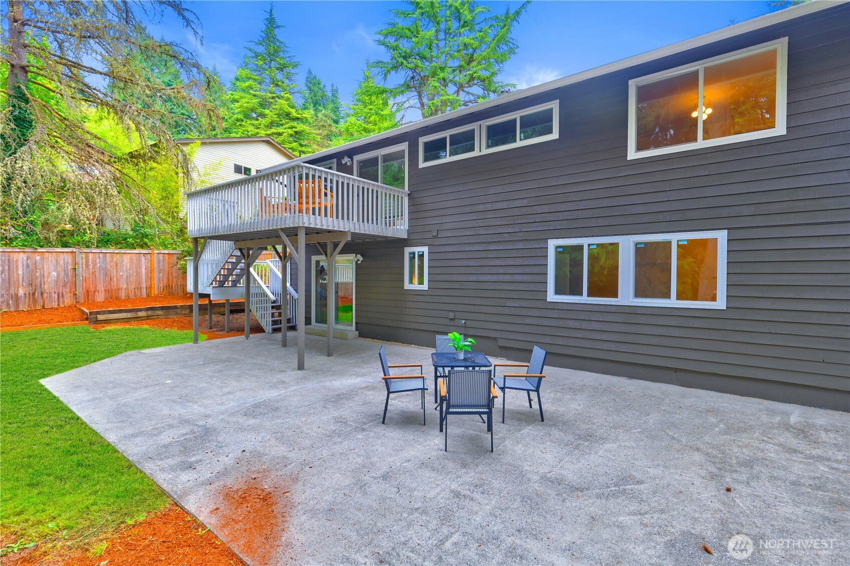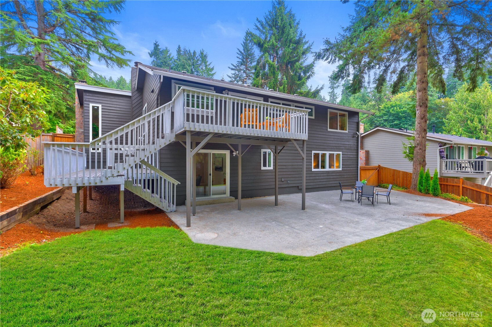Remodeled tri-level in Lake Forest Park, tucked in a friendly neighborhood near Horizon View & within the Shoreline School District. Deeded beach access via the Lake Forest Park Civic Club. Vaulted ceilings on the main level with open living room, custom kitchen with newest slim shaker cabinets & stone countertop & backsplash, pot filler, stainless appliances, & formal dining area. Main floor primary suite with double vanity and ¾ bath, plus 2 more bedrooms & full hall bath. Lower level offers family room with patio access, 4th bedroom, ¾ bath, and laundry. Private backyard with multiple decks & oversized patio, perfect for entertaining all year around & for everyone to enjoy. 2-car garage, central A/C, quiet established neighborhood