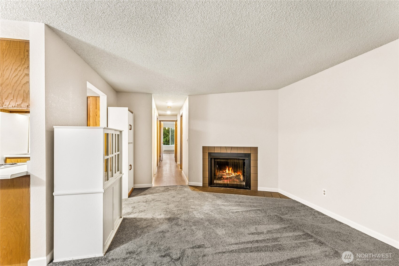 A wonderful opportunity to own in Ballinger Community; a well cared-for complex with new roof, cement siding, exterior paint, vinyl insulated windows, (lots of natural light), and paved parking lot. 2 bedrooms, 1.25 updated bath, newer laminate hardwood flooring, new carpet and interior paint. Inviting wood burning fireplace connects living room, dining, and kitchen into a very comfortable living area. Slider to private deck with large storage closet, over-looking water feature and bird-friendly environment. Generously sized bedrooms, primary has access to bath + separate vanity. Roomy laundry room with full-size washer/dryer (stay) and extra storage. Just minutes from shopping, I-5 access, restaurants, and public transportation, yet a quiet/private location. No rental cap. No new special assessment. Existing assessment for work completed will be paid by Seller at closing with acceptable offer. One reserved parking space + plenty of visitor parking too. Move-in ready!