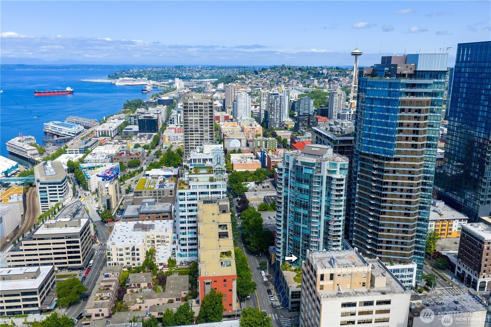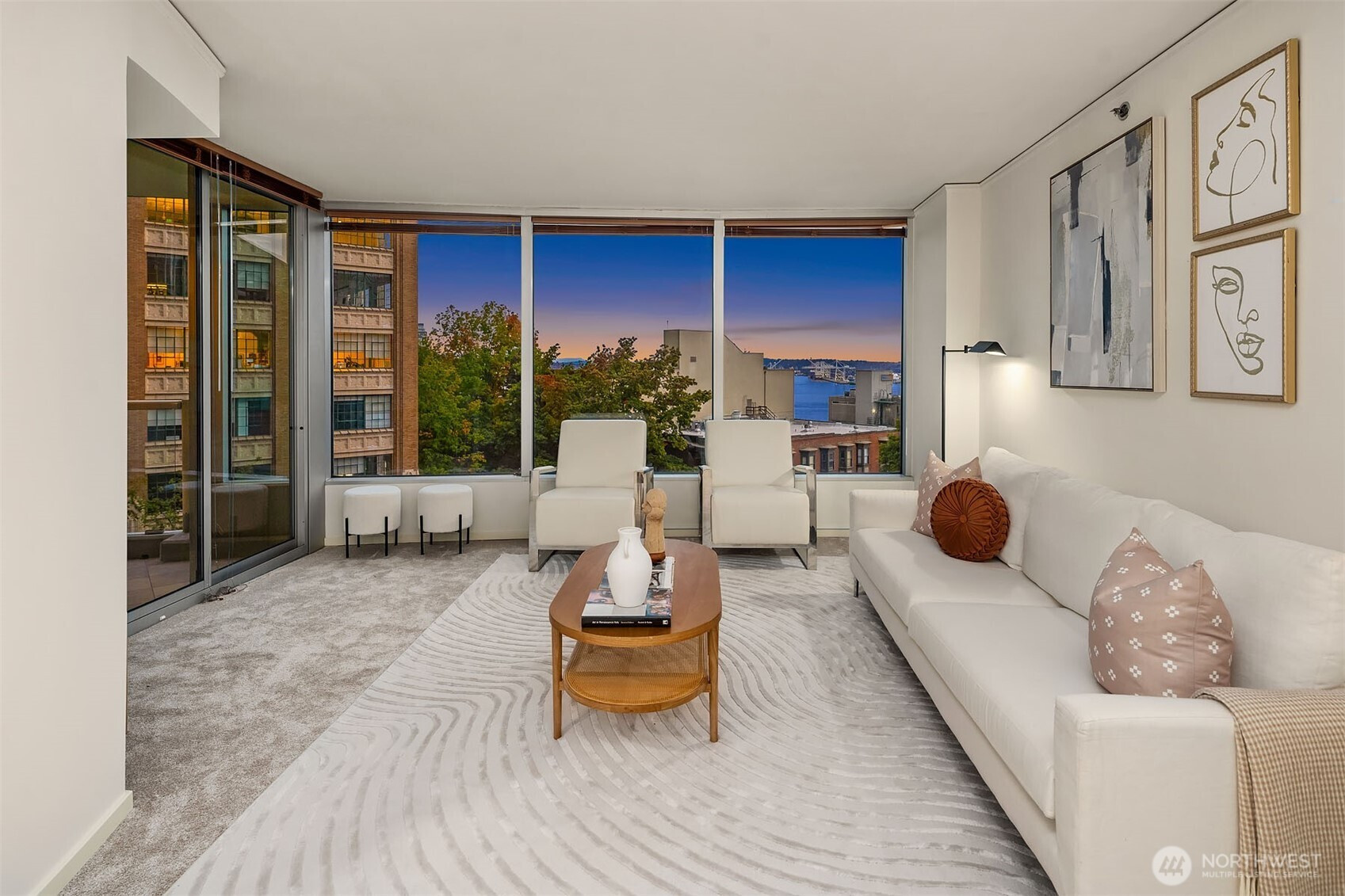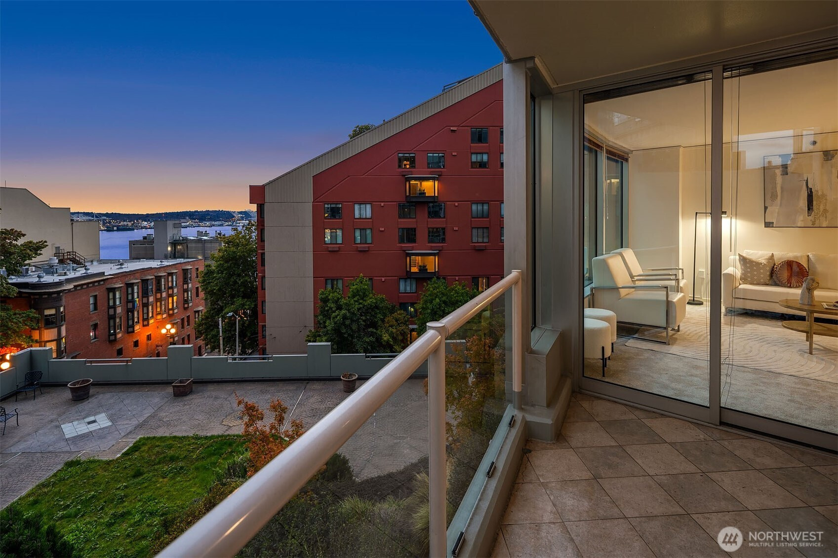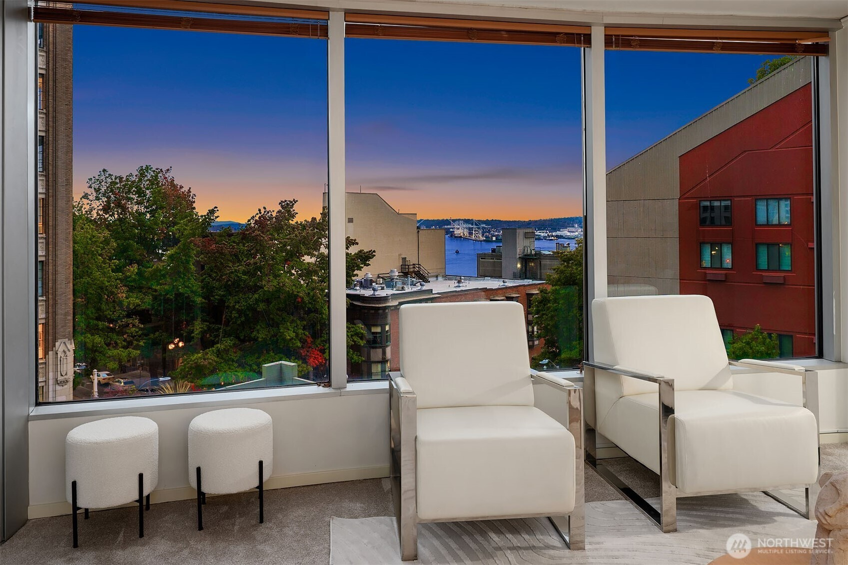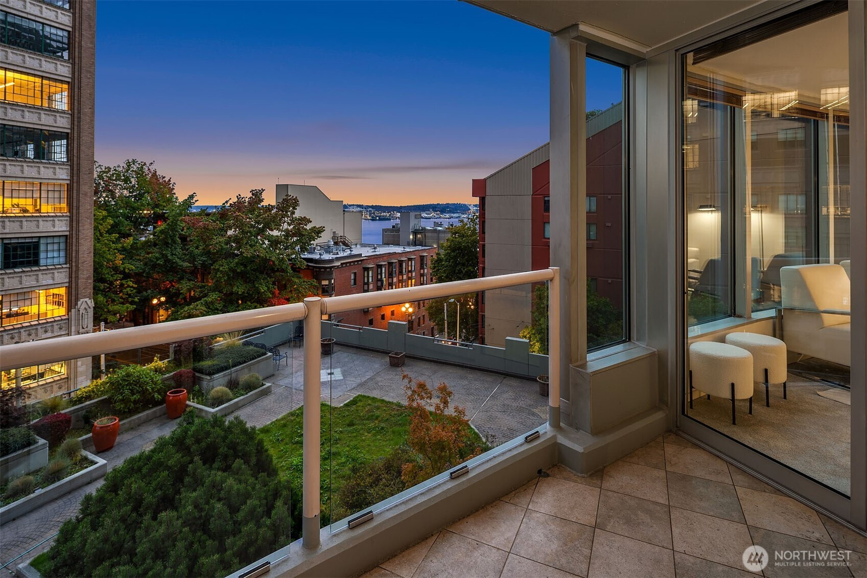 Incredible value in Downtown Seattle, steps to Pike Pace Market & the revamped waterfront! Spacious 1BR+DEN, which could double as a 2nd BR w/ its own bath. This SW-facing home is drenched in natural light through oversized windows framing tranquil views of the garden terrace & protected views of Elliott Bay, visible from both main room & bedroom. Features incl. Central A/C, newly refinished patio, Sub-Zero fridge, granite kitchen counters/floors, fresh paint/carpet, limestone entry. Versatile den w/pocket doors doubles as guest room/flex space. Primary BR offers full en-suite bath + separate 3/4 bath for guests. Amenities: 24/7concierge, indoor pool/spa, gym, event room, view terrace. Garage parking. No rental cap & well-managed building!