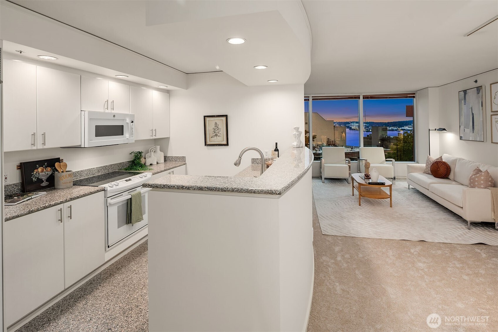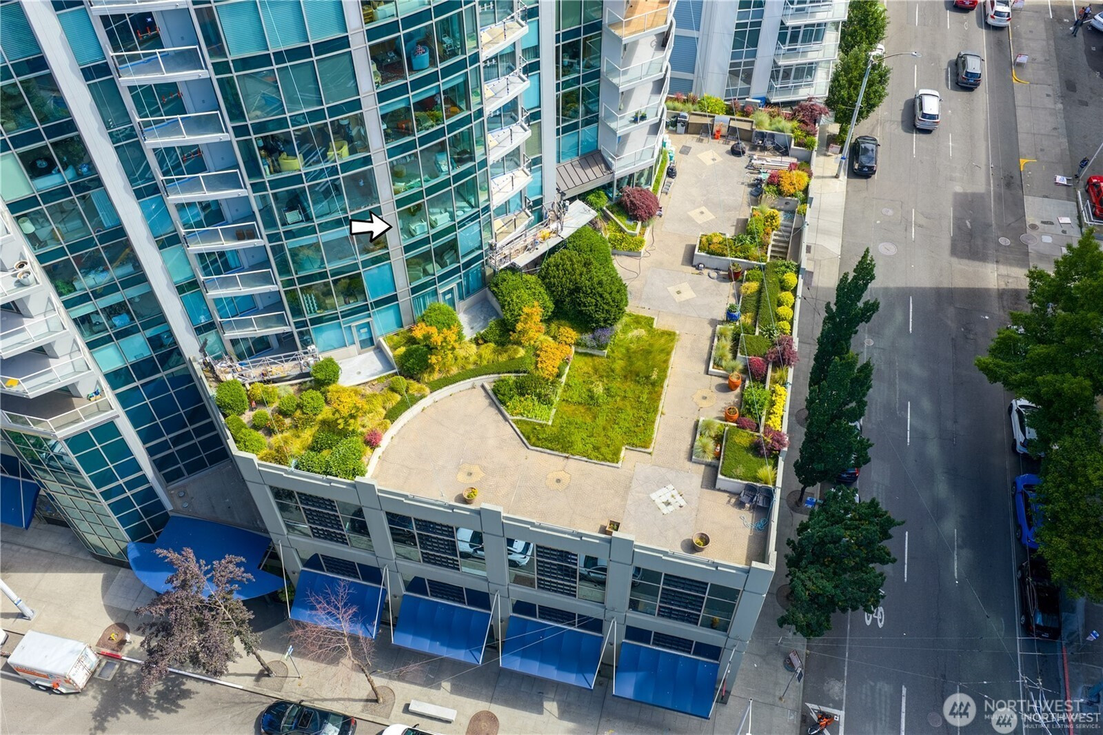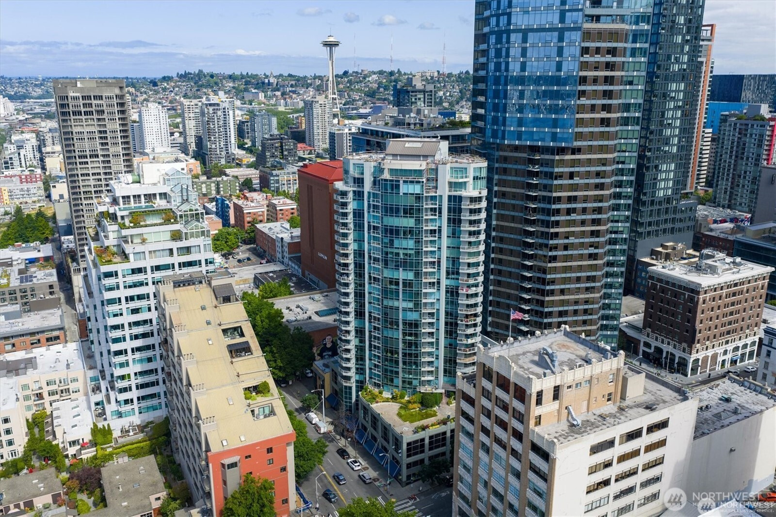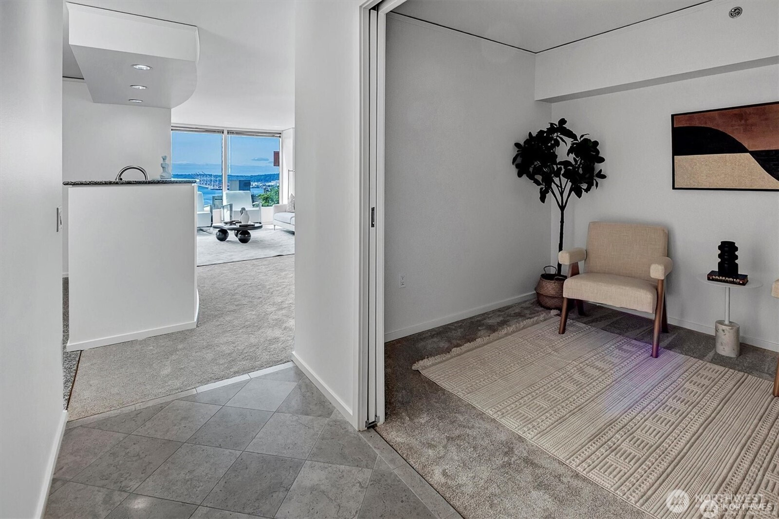 Incredible value in Downtown Seattle, steps to Pike Pace Market & the revamped waterfront! Spacious 1BR+DEN, which could double as a 2nd BR w/ its own bath. This SW-facing home is drenched in natural light through oversized windows framing tranquil views of the garden terrace & protected views of Elliott Bay, visible from both main room & bedroom. Features incl. Central A/C, newly refinished patio, Sub-Zero fridge, granite kitchen counters/floors, fresh paint/carpet, limestone entry. Versatile den w/pocket doors doubles as guest room/flex space. Primary BR offers full en-suite bath + separate 3/4 bath for guests. Amenities: 24/7concierge, indoor pool/spa, gym, event room, view terrace. Garage parking. No rental cap & well-managed building!
