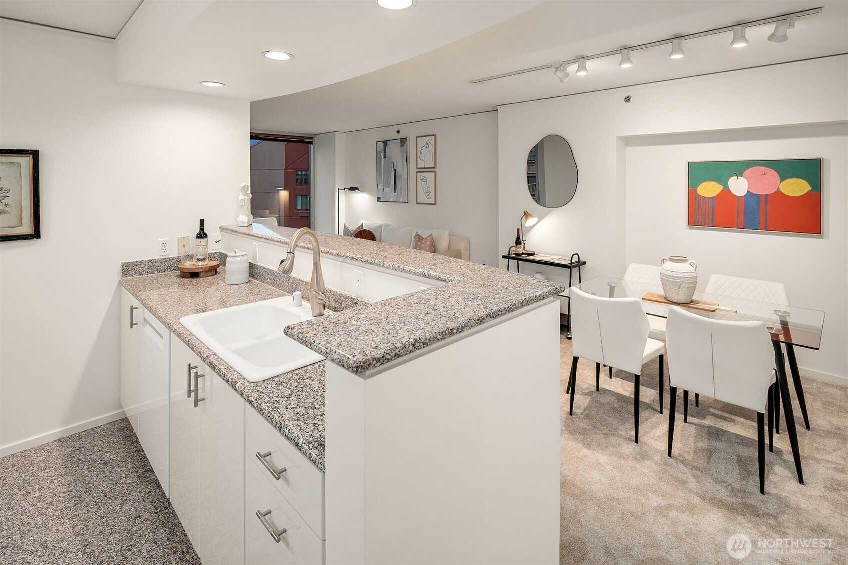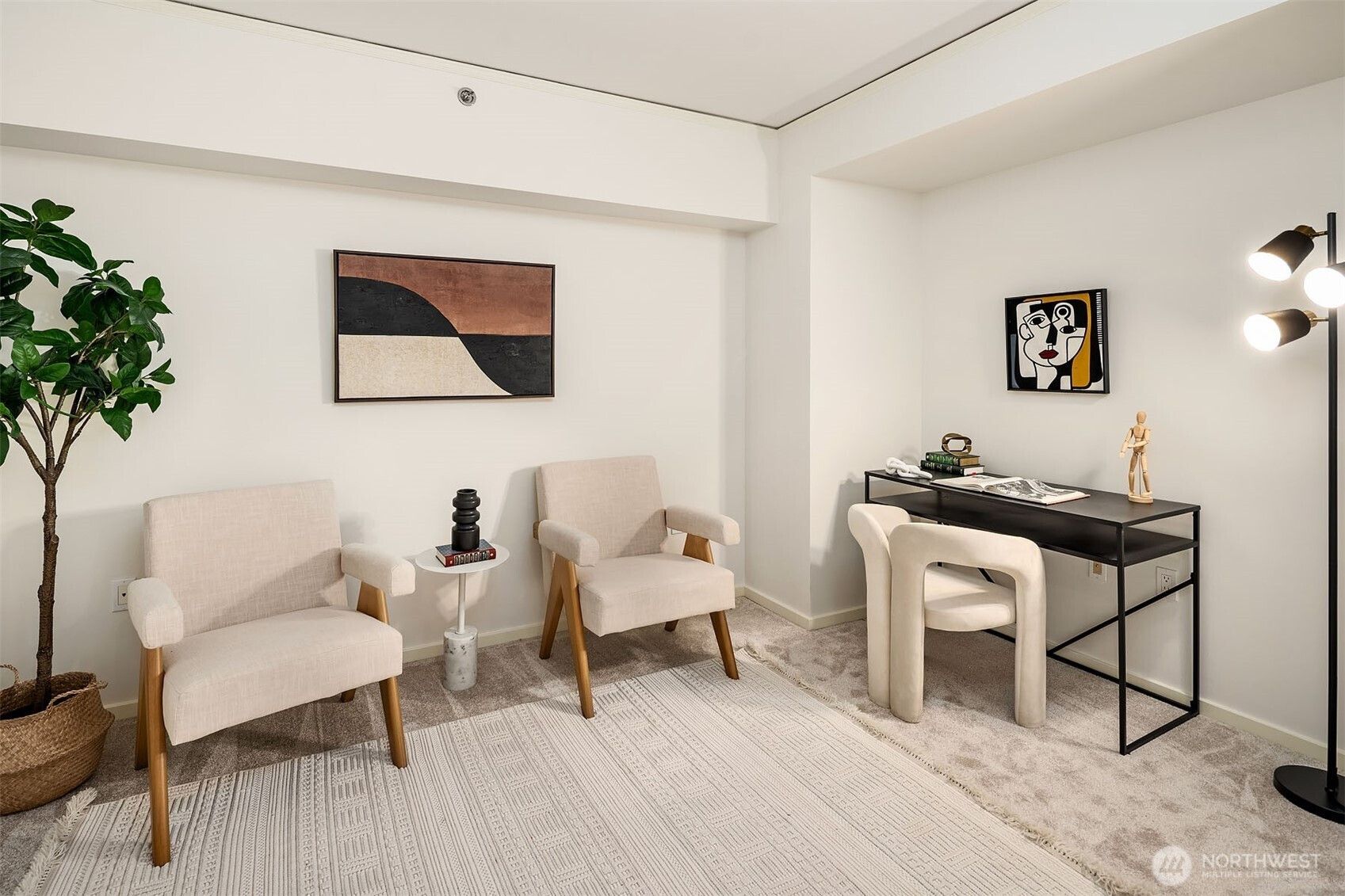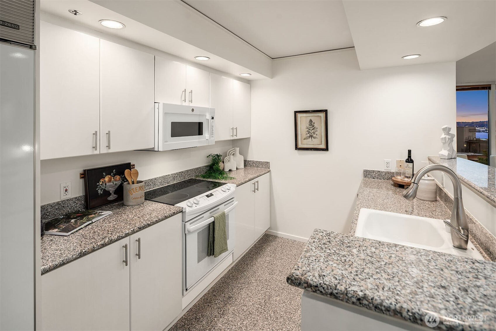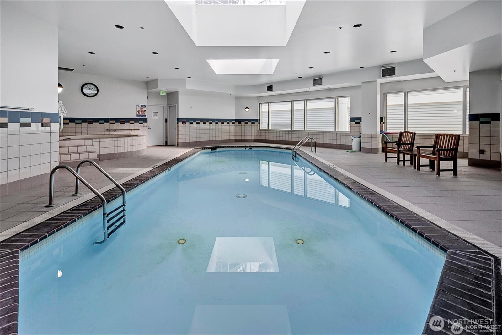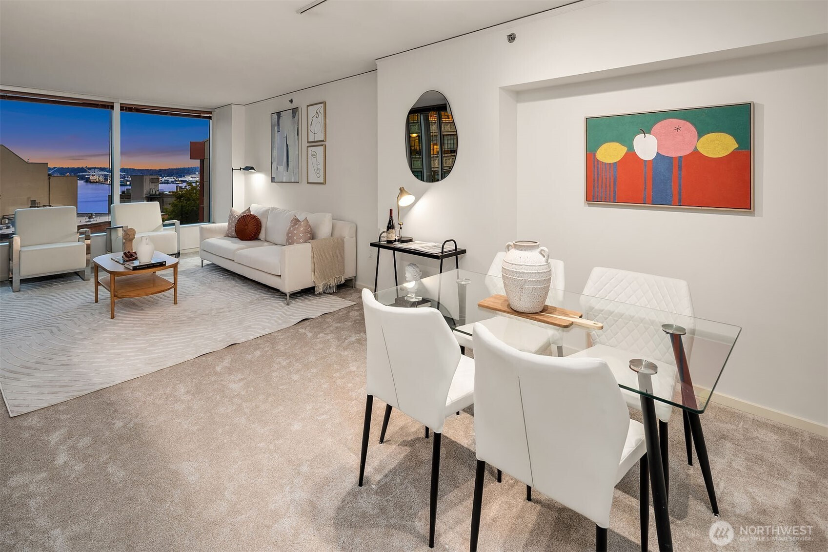 Incredible value in Downtown Seattle, steps to Pike Pace Market & the revamped waterfront! Spacious 1BR+DEN, which could double as a 2nd BR w/ its own bath. This SW-facing home is drenched in natural light through oversized windows framing tranquil views of the garden terrace & protected views of Elliott Bay, visible from both main room & bedroom. Features incl. Central A/C, newly refinished patio, Sub-Zero fridge, granite kitchen counters/floors, fresh paint/carpet, limestone entry. Versatile den w/pocket doors doubles as guest room/flex space. Primary BR offers full en-suite bath + separate 3/4 bath for guests. Amenities: 24/7concierge, indoor pool/spa, gym, event room, view terrace. Garage parking. No rental cap & well-managed building!