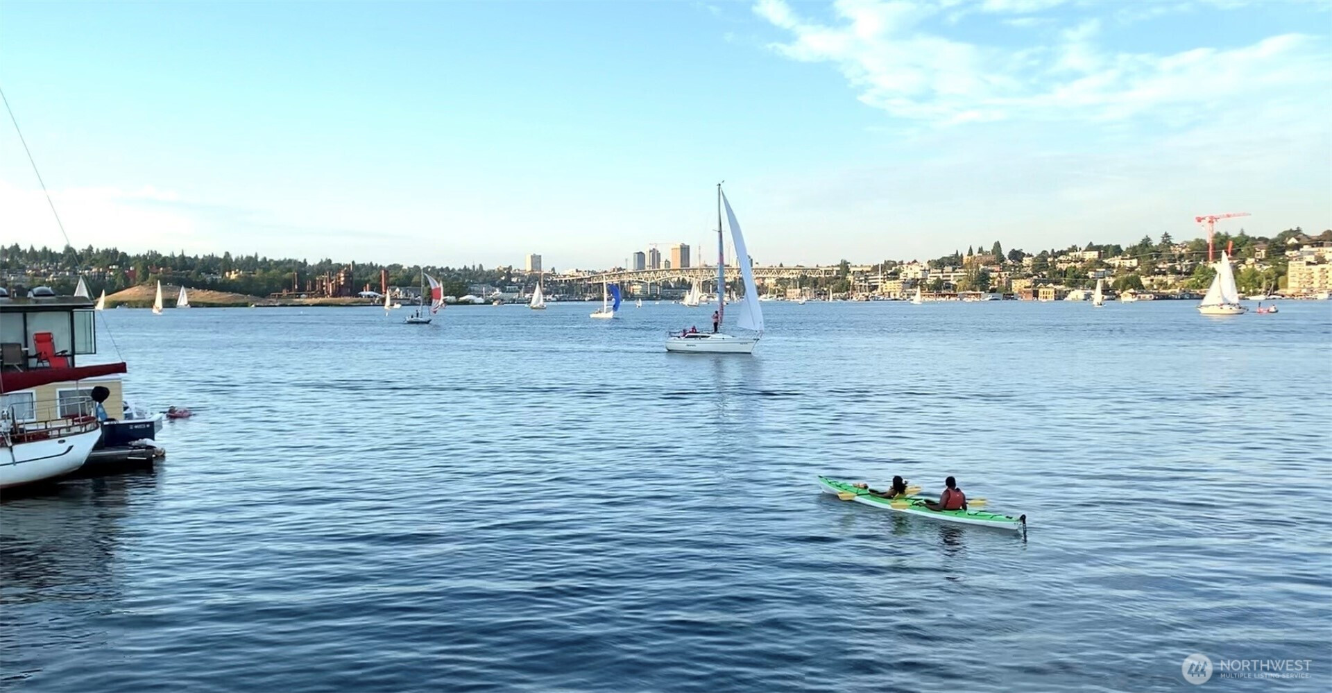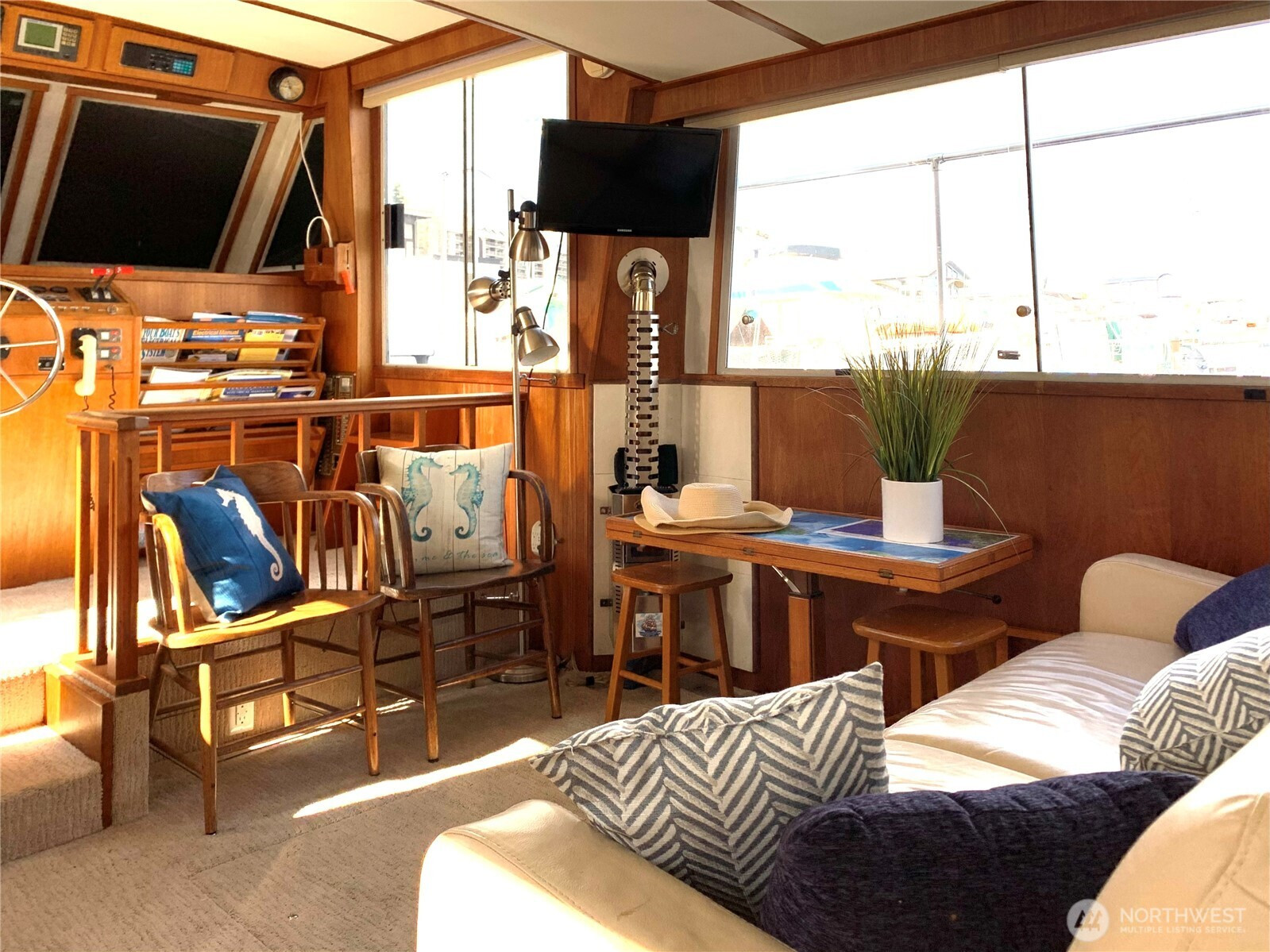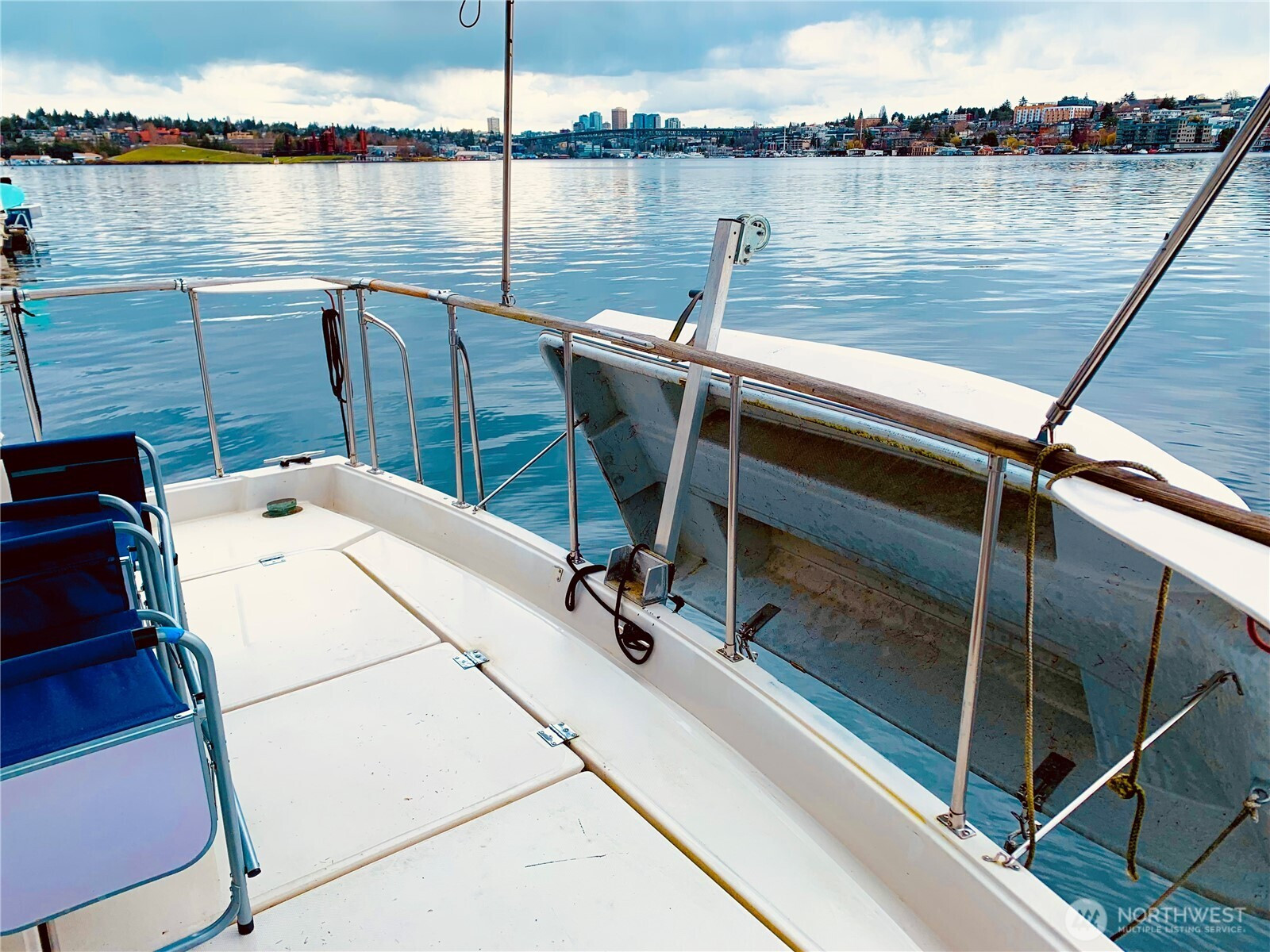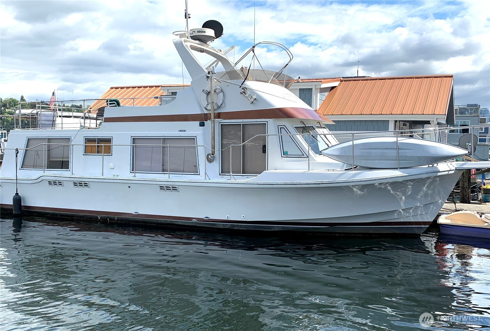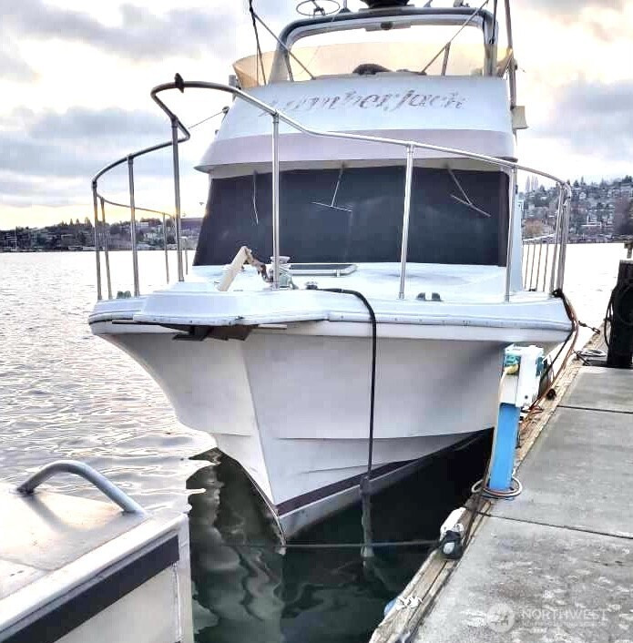 BEST VIEW on LAKE UNION -- This 45-foot live-a-board Uniflite Yacht-Home has the best location on the lake – a panoramic view to the east on an end moorage – runabouts, paddleboards, rowers, kayaks, seaplanes, Tuesday Duck Dodge, Independence Day fireworks are all just off the stern deck. This craft also features a large outdoor upper deck with barbeque and furniture and an even better 360 degree views from the Space Needle to Gasworks Park. Large separate main bedroom with queen bed, TV, spacious closets, reading lamps and separate bath with large shower. Up front is a spacious twin V-berth and bath with shower available, The main salon offers a leather sofa-hide-a-bed, large kitchen, pantry, spacious cabinets, double sink, full refrigerator, propane range/oven, TV and diesel heater. The cabin has central heating or wall heaters in salon, bath and bedroom. Sliding salon doors for access on port and starboard sides. Plenty of bow and under-floor storage and spare gear. Twin Caterpillar 3208 inboards and adjacent equipment just thoroughly serviced and upgraded, bilge pumps fore and aft, diesel AC generator, Full lines and docking gear. Livingston dinghy included. FOWR is pending; Parking permit Zone 25 by annual fee; Assumable moorage lease includes water and garbage. Internet w/Atlas; various TV options; 60 amp electric service. Full live-a-board moorage lease; short term rental not authorized. Owner/agent