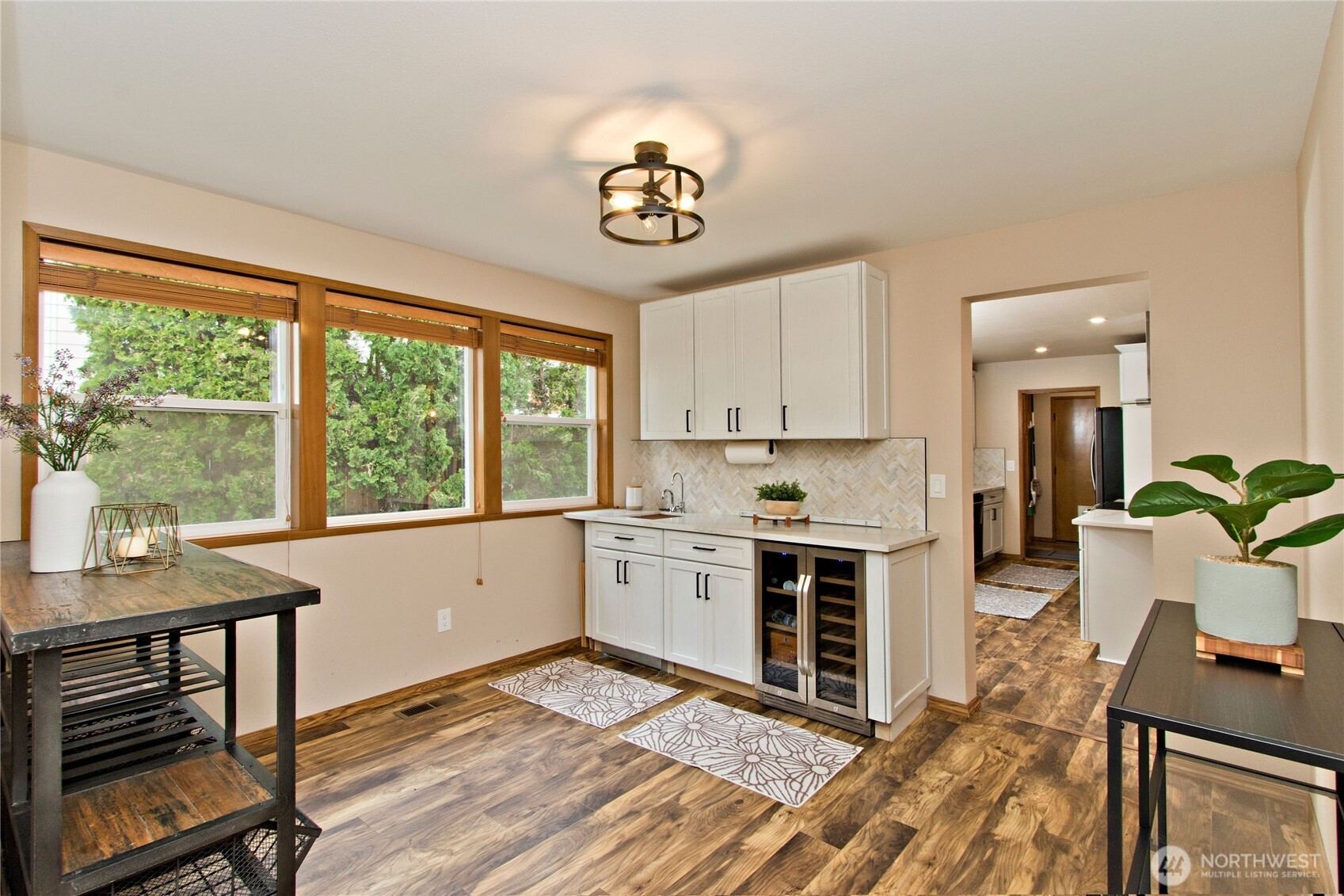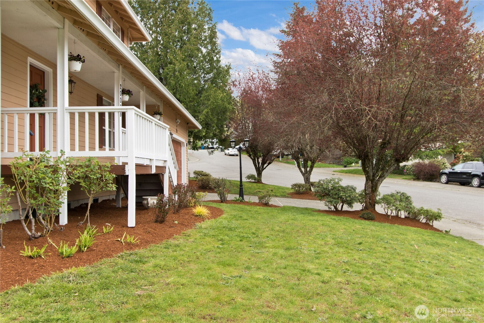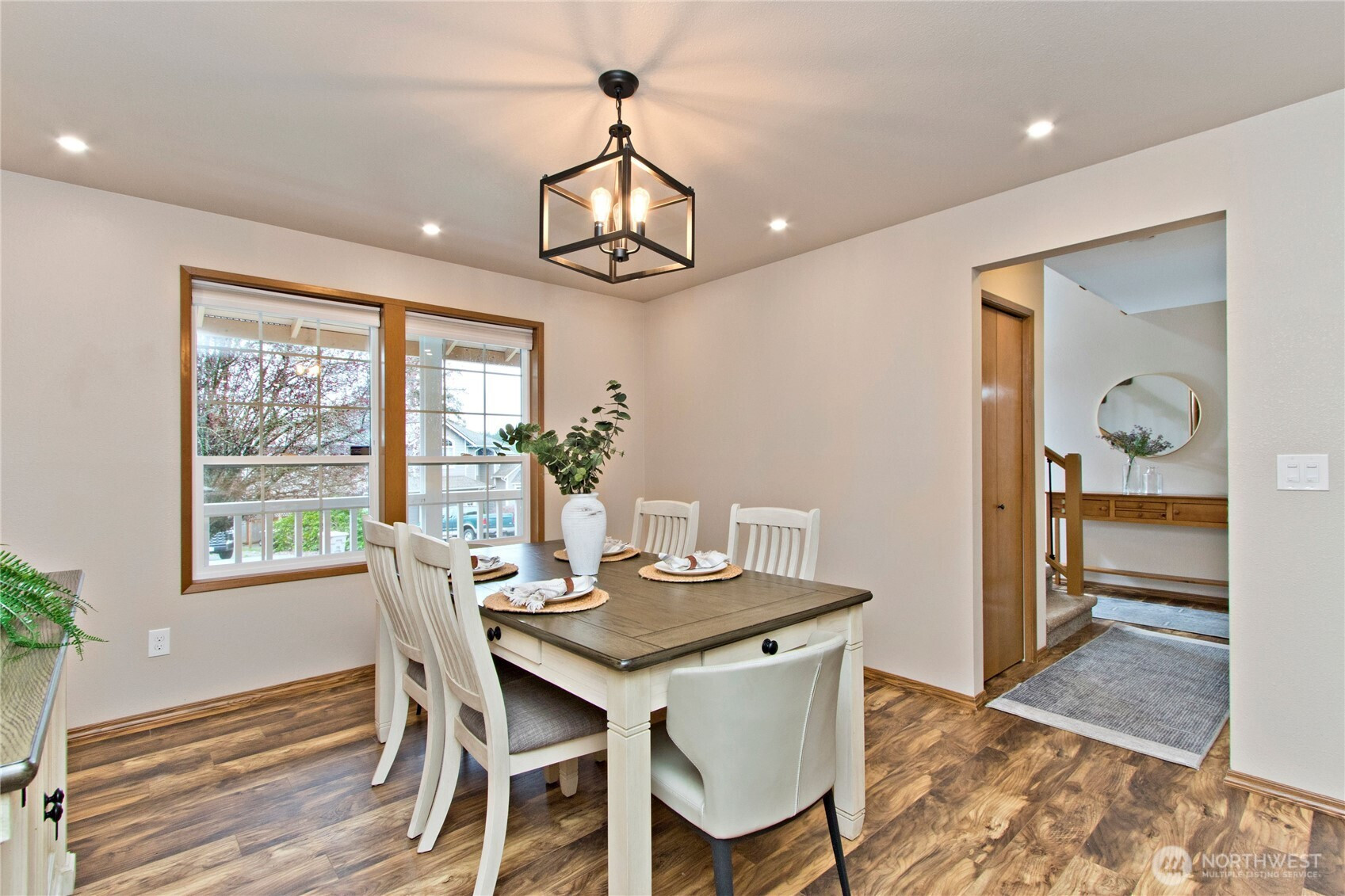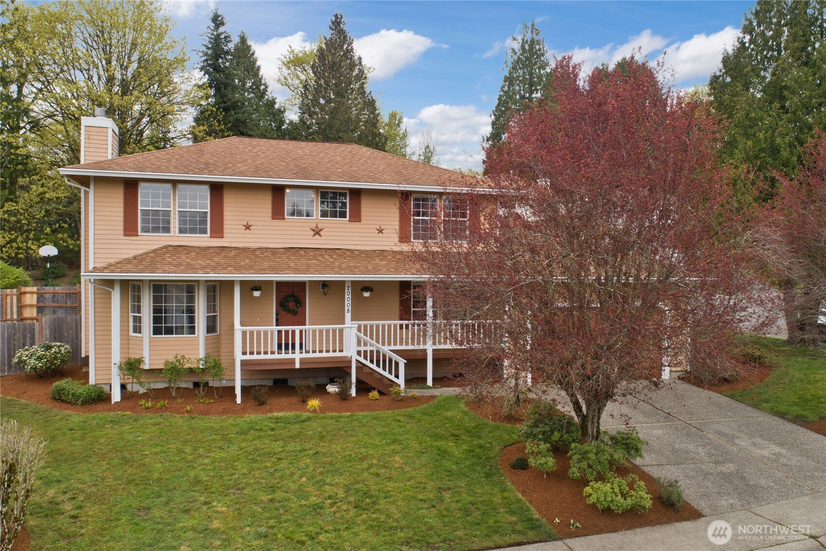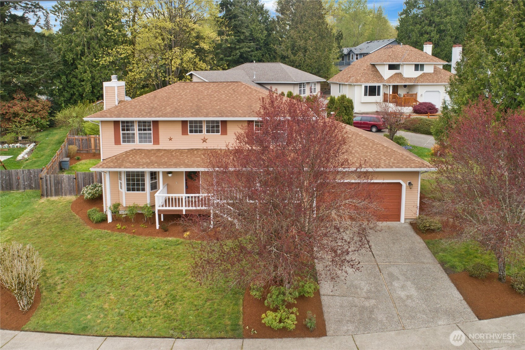 Farmhouse-style home with a welcoming covered front porch, set on a spacious corner lot connected to a cul-de-sac in the Tall Timbers community! Updated throughout with new laminate wood flooring, interior paint, leaf guard gutters, LED lighting, and custom dimmable zones in the living, dining, and kitchen areas. Remodeled and expanded kitchen features quartz countertops, an extra-large peninsula, added cabinetry plus a beverage/bar area with fridge. Main floor half bath updated with new fixtures. Four bedrooms upstairs, along with ample storage throughout the home and garage. Enjoy covered porches in both the front and back and established landscaping. Conveniently located near shopping, dining, and commuter routes.