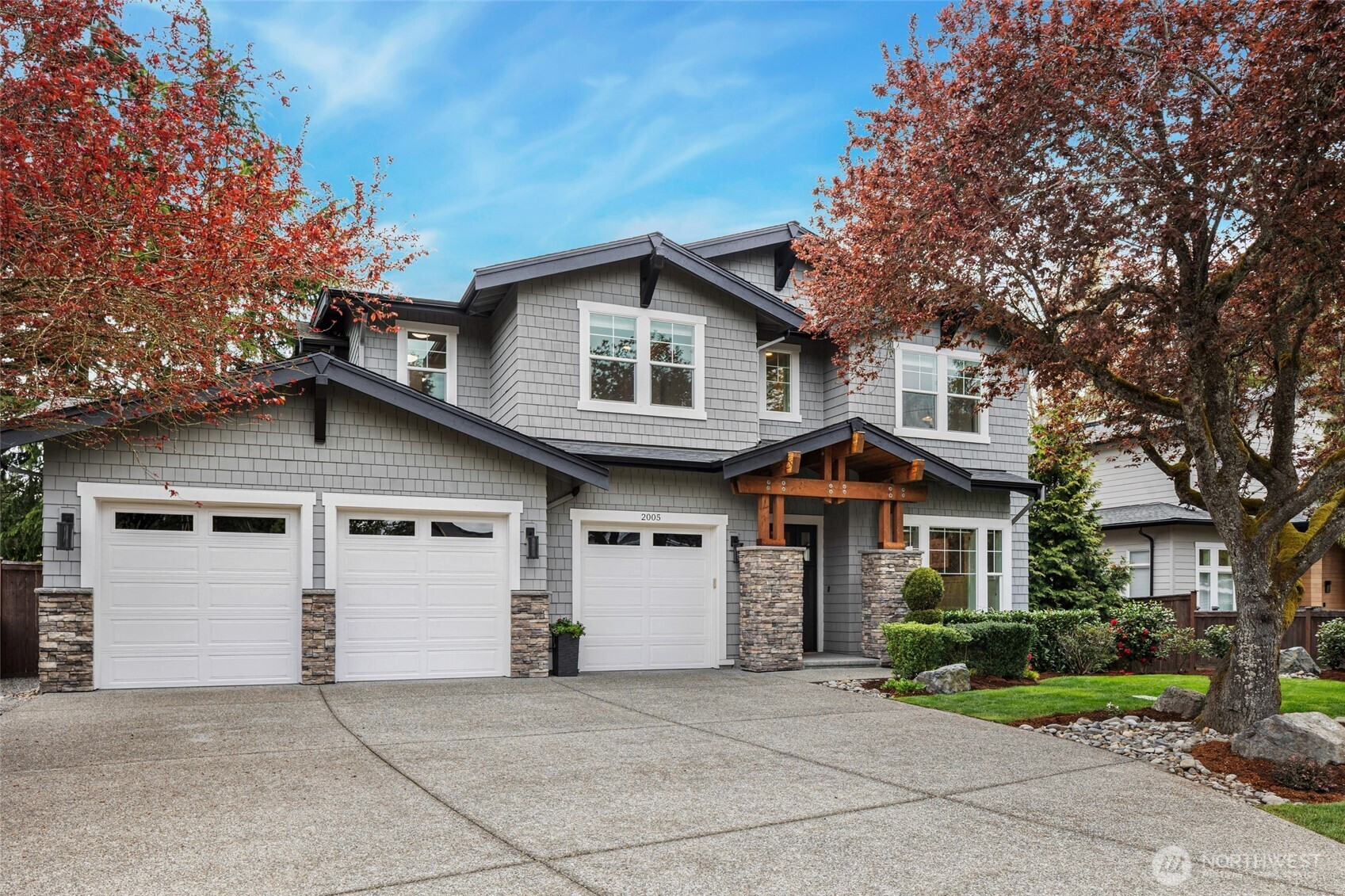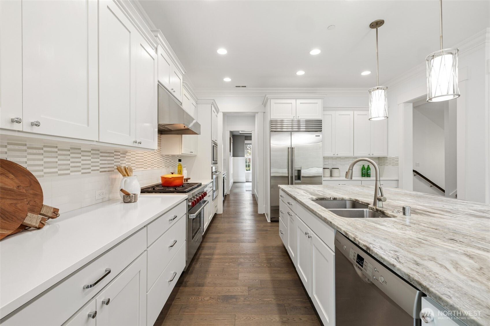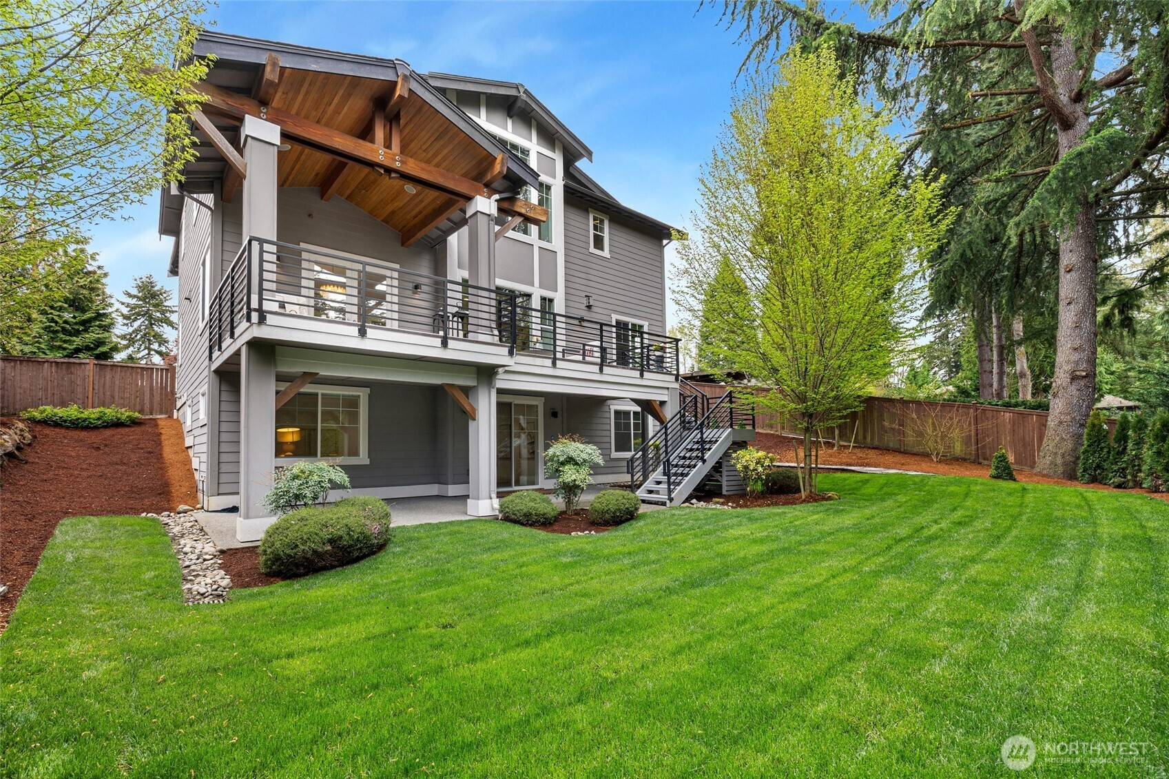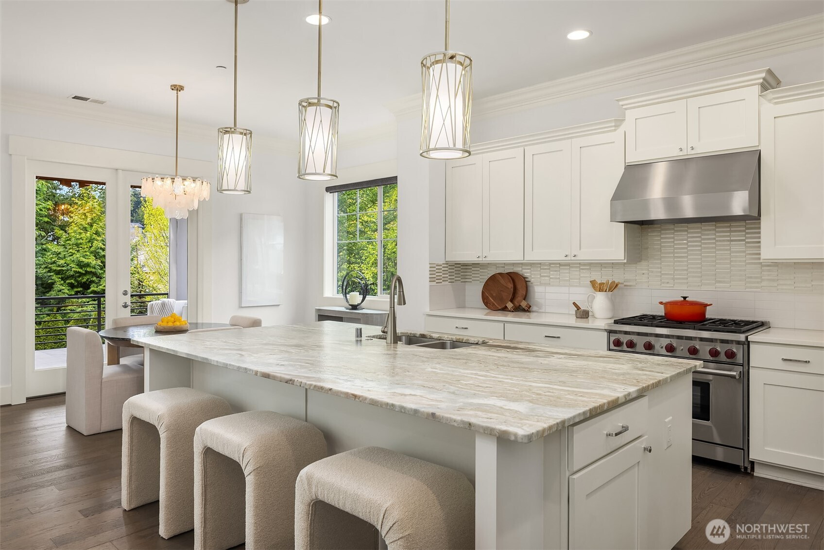Exceptional JayMarc resale showcasing timeless craftsmanship and a thoughtful layout. Set on a private dead-end street just minutes from Downtown Bellevue’s premier dining, shopping, and amenities, this home offers both privacy and convenience. Designed for entertaining, the open great room flows to a large covered deck through French doors, creating effortless indoor-outdoor living. The chef’s kitchen features top-tier Sub-Zero and Wolf appliances, a butler’s pantry, and a casual dining area. An ocean wave–inspired natural stone island with a leathered finish serves as a one-of-a-kind centerpiece. Upstairs includes four spacious bedrooms and three baths, highlighted by a luxurious primary suite with a sitting area, a generously sized spa-like bath, and a walk-in closet, all framed by vaulted ceilings and bright, airy interiors. The refined lower level features a spacious rec room that opens to a flat, west-facing backyard, along with a private guest space and separate entrance—ideal for visitors or multigenerational living. Lush, mature landscaping is complemented by a full irrigation system and fully fenced grounds. Fresh interior paint enhances the home’s crisp, move-in-ready appeal. Additional highlights include a three-car garage with EV charging and dual-zone heating and cooling for year-round comfort. Ideally located just a short stroll from the Bellevue Farmers Market.