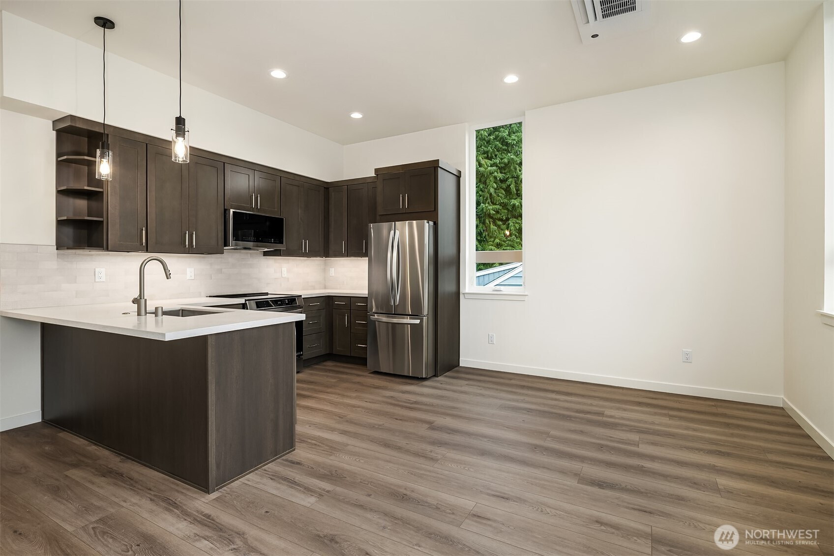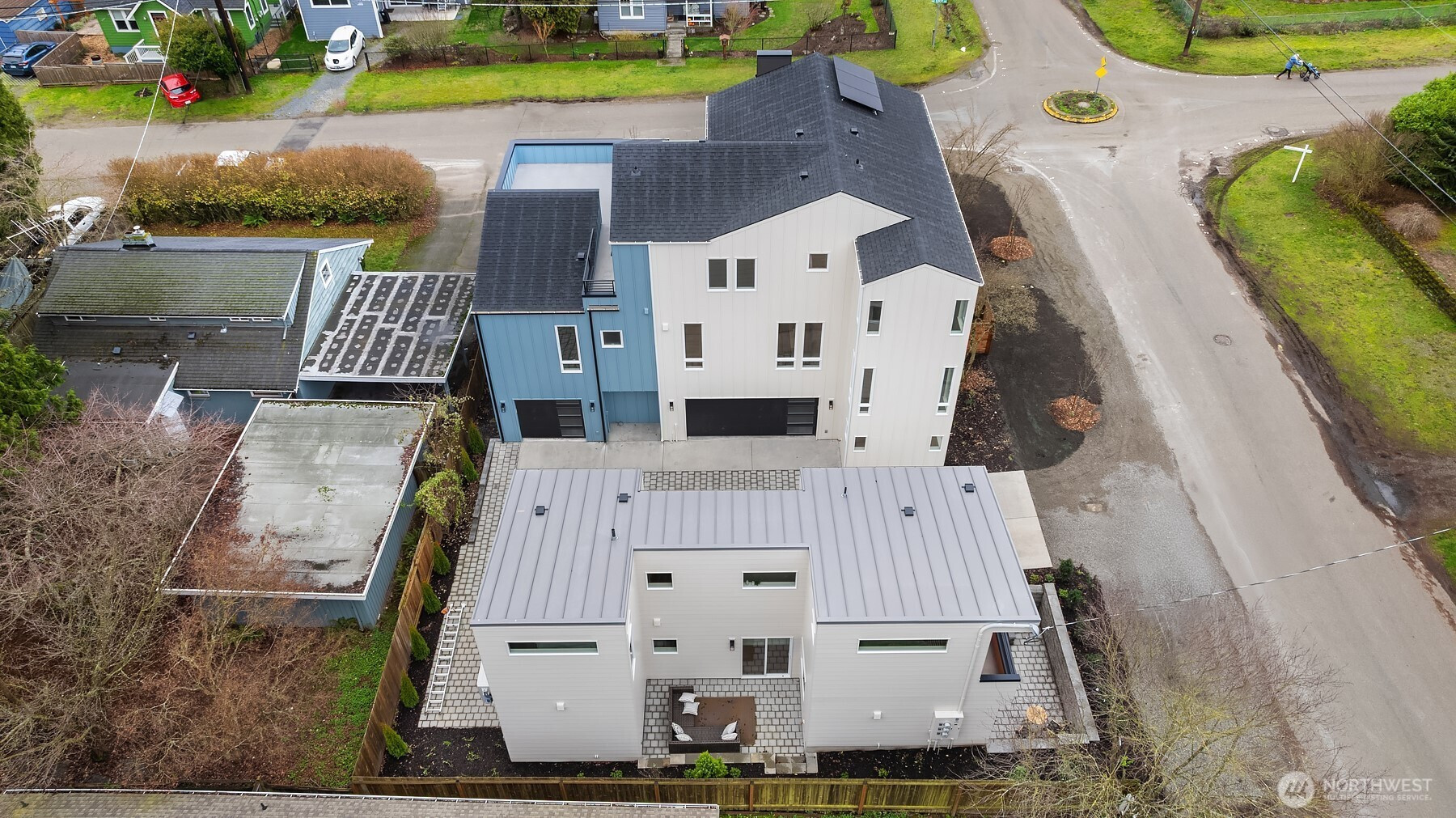 Brand-new 2-bedroom home showcasing modern design, premium finishes, and exceptional craftsmanship throughout. A fully landscaped front yard offers a warm welcome, while secure garage parking provides both convenience and flexibility. The lower level features direct garage access, along with a private bedroom and full bath perfect for guests, a home office, or additional living space. The main level highlights a stunning primary suite with vaulted ceilings and a beautifully appointed bath, complemented by an open-concept kitchen, dining, and living area designed for seamless entertaining. Enjoy the rooftop deck with incredible south-facing views, including a peekaboo view of Lake Washington, mountain vistas, and stunning sunrise-to-sunset scenery. Every detail of this home reflects impeccable quality and thoughtful design, custom-built by Steven Martinsen, founder of Homes West Inc. This home reflects over 35 years of expert craftsmanship and attention to detail from site development to fine finishes. Ideally located just blocks from Hazel Wolf School, neighborhood shops, and restaurants, with easy access to Light Rail and the vibrant Northgate redevelopment featuring 41 acres of retail, dining, and the Kraken practice facility. Nestled between Lake Washington and Green Lake, Victory Heights offers the perfect blend of peaceful residential living and convenient access to city amenities.