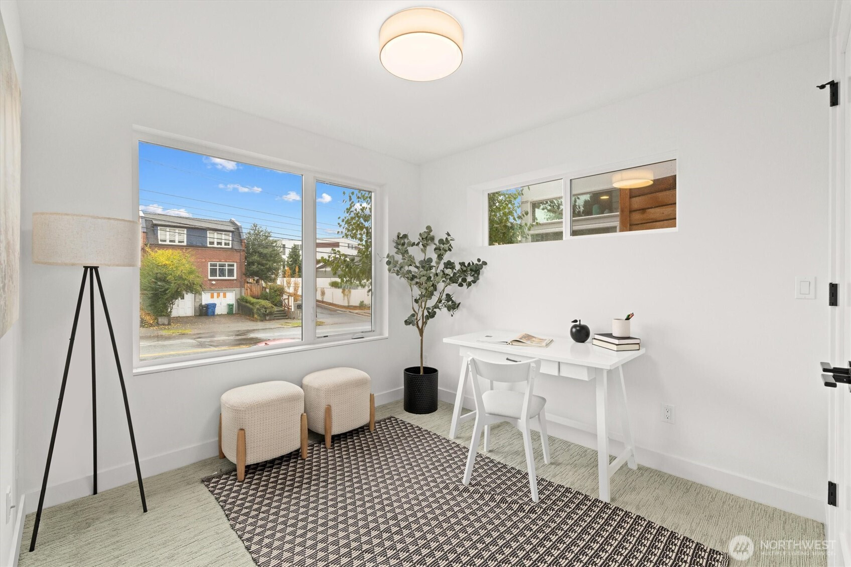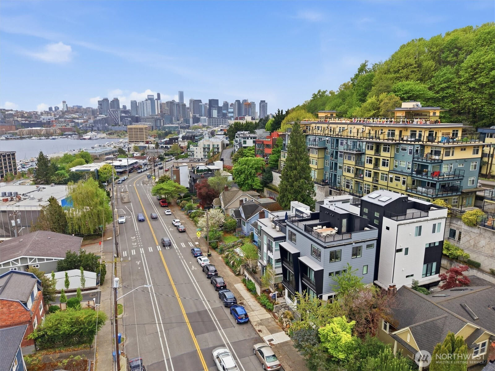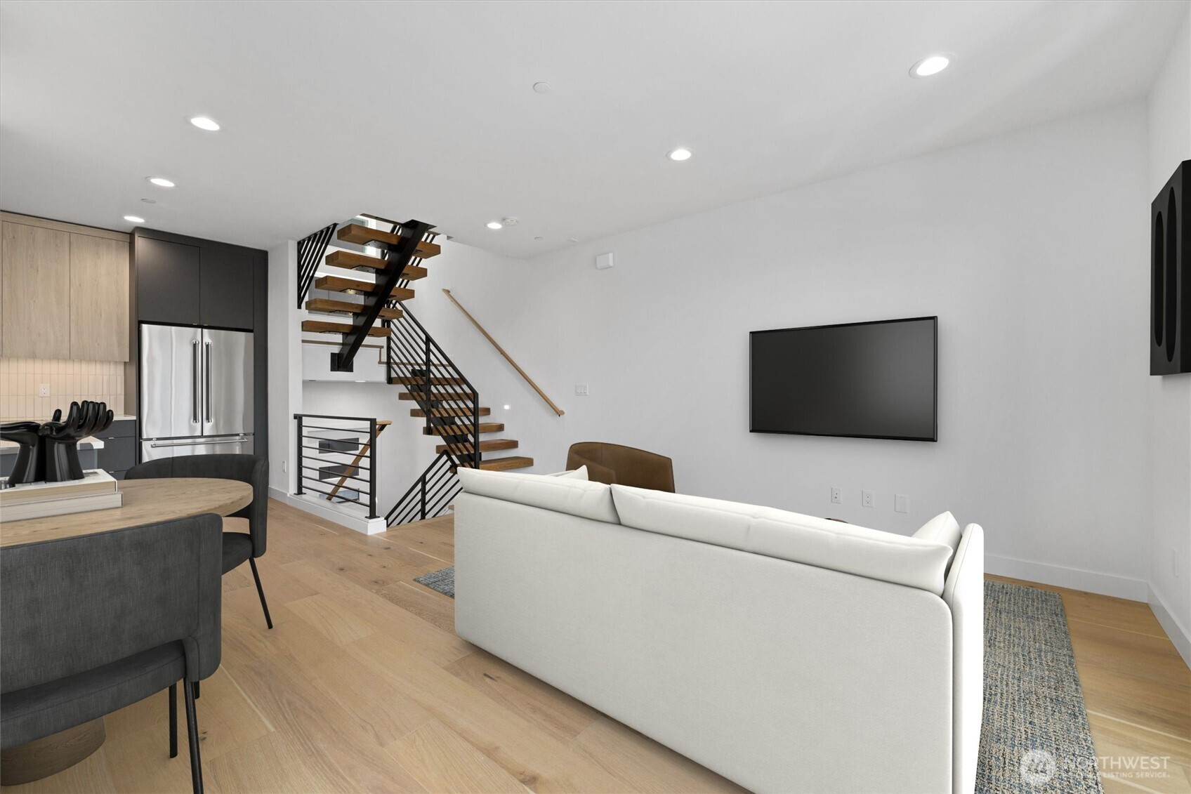 LAST HOME! Right in Westlake, where everything feels close but never crowded, this home puts you minutes from Lake Union, SLU, and the café-lined edges of Queen Anne. Your private rooftop deck sets the tone—lake views, city lights, and summer nights that stretch a little longer. Inside, the layout is open, bright, and built to connect. Three bedrooms offer flexibility, while the main level flows seamlessly for both everyday living and hosting. The kitchen is clean and modern with a social feel, anchored by a sleek island and quality finishes. A floating open-tread staircase adds a sharp architectural moment, and a bonus flex space easily adapts to WFH or a home gym. Zoned heating and A/C keep things comfortable year-round, with covered EV-ready parking, WA/DR included, engineered hardwoods, and smart storage throughout. A refined take on urban living, right where Westlake hits its stride.