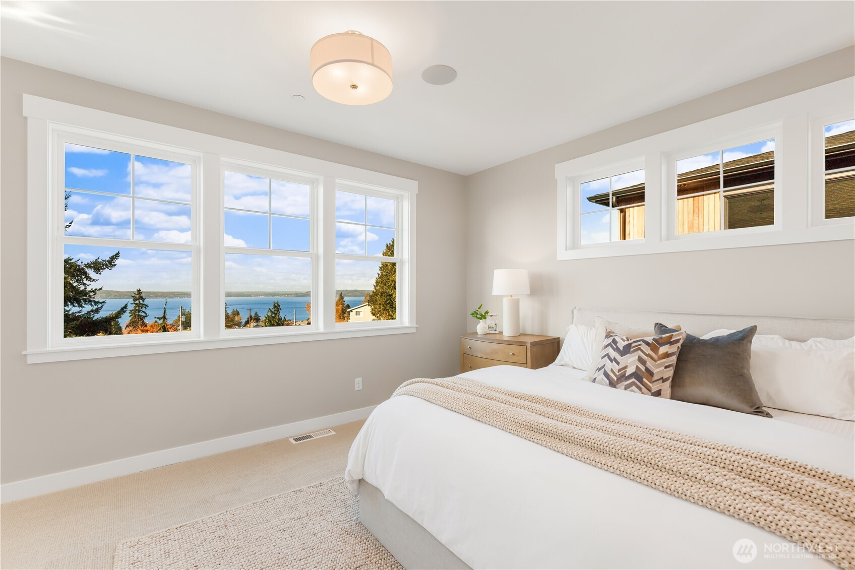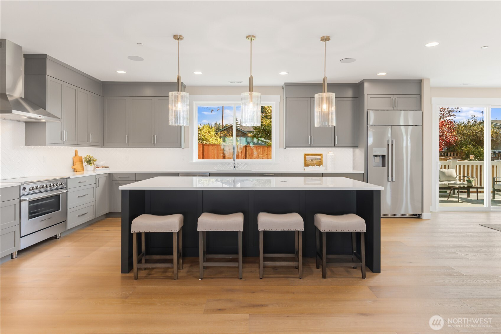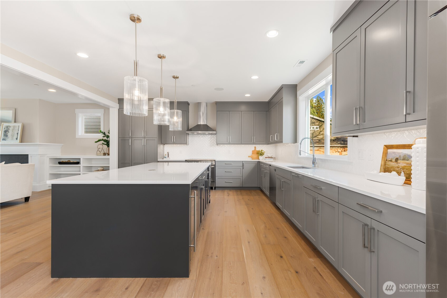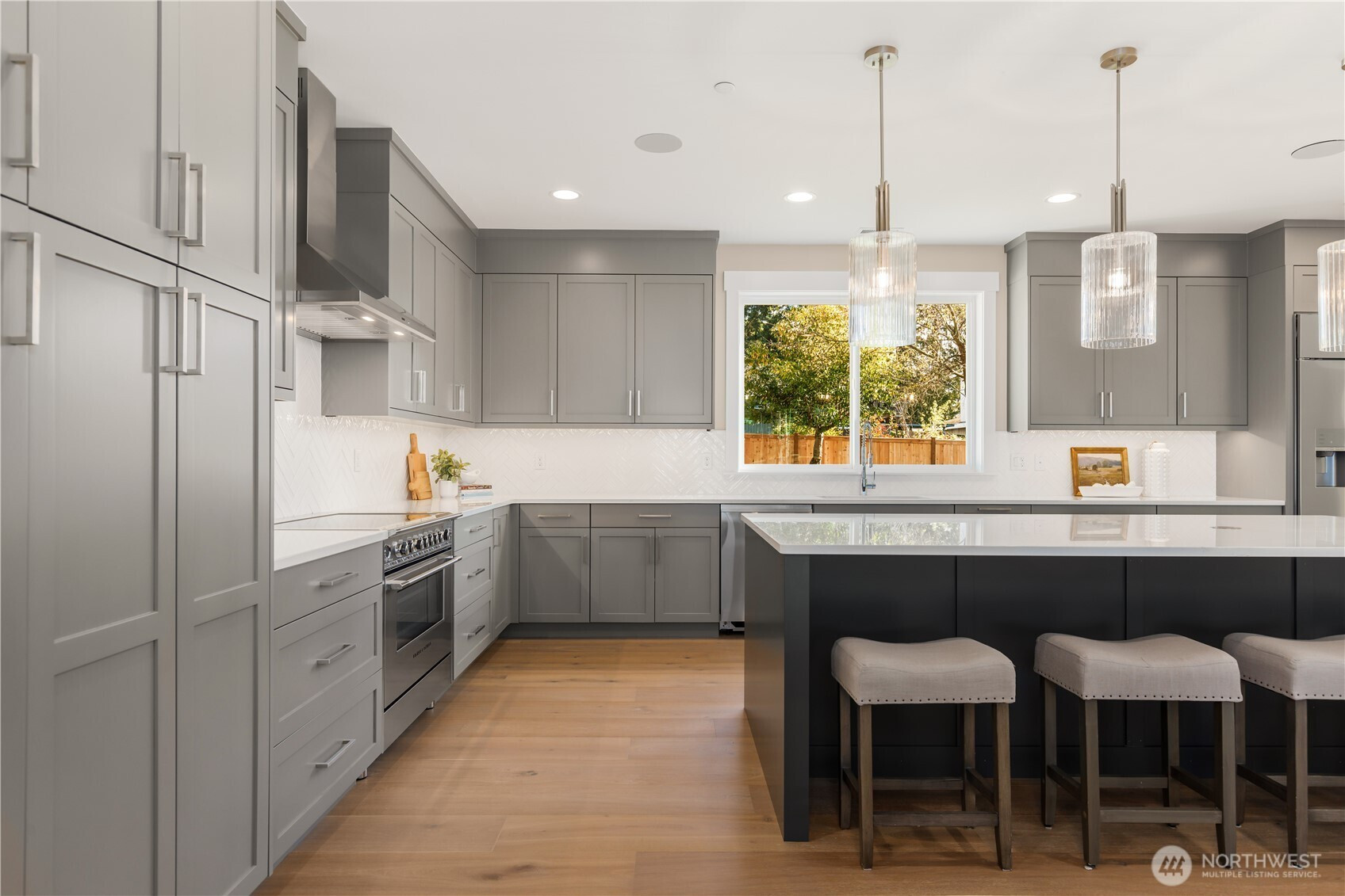 Winfield Homes presents modern design in the heart of Richmond Beach with Sound and Olympic Mountain views. This new construction showcases soaring ceilings and stacking glass doors that open to a covered view deck for seamless indoor-outdoor living. Enjoy wide-plank hardwood floors, a chef’s kitchen with oversized quartz island, custom cabinetry, and designer lighting. The spa-inspired primary bath features heated floors and elegant finishes. The lower level includes a spacious rec room, guest suite, and full bath. Fully fenced yard, smart wiring, security system, and pre-wired surround sound complete this exceptional home.