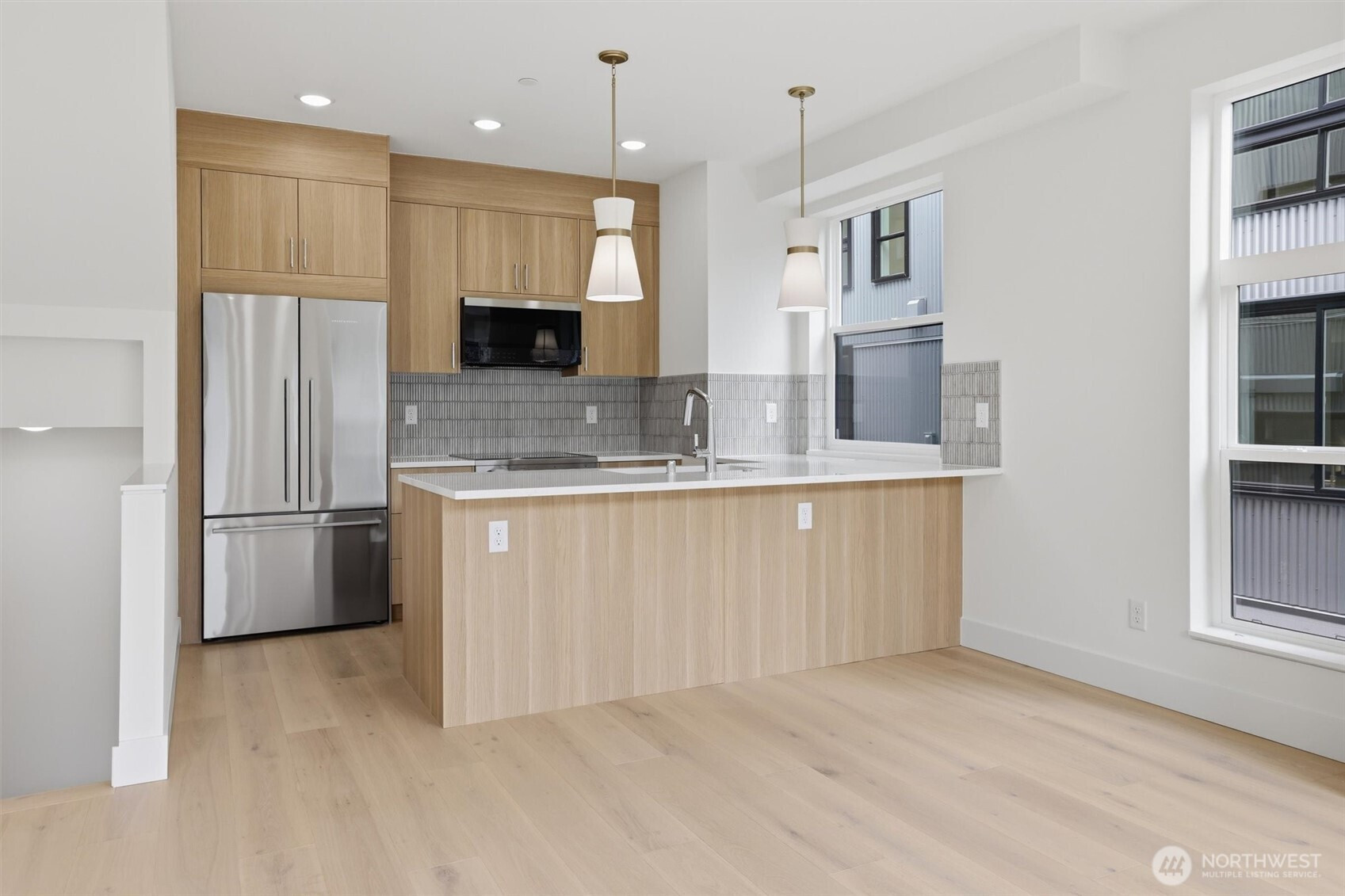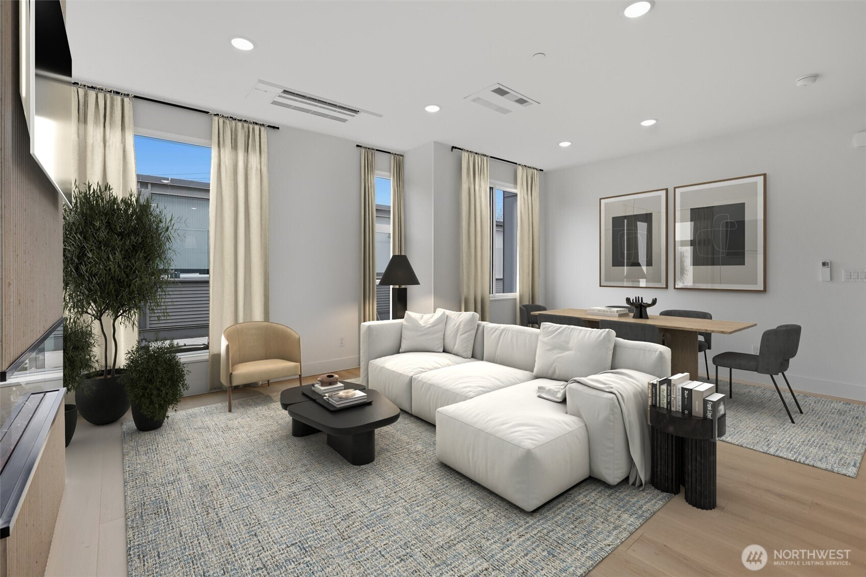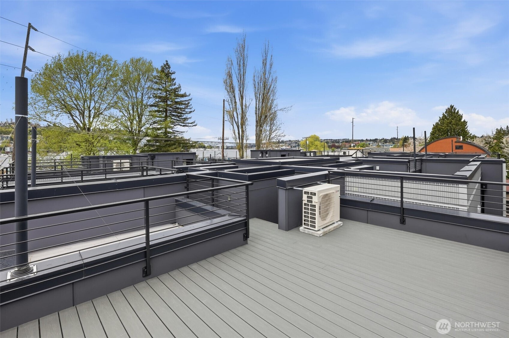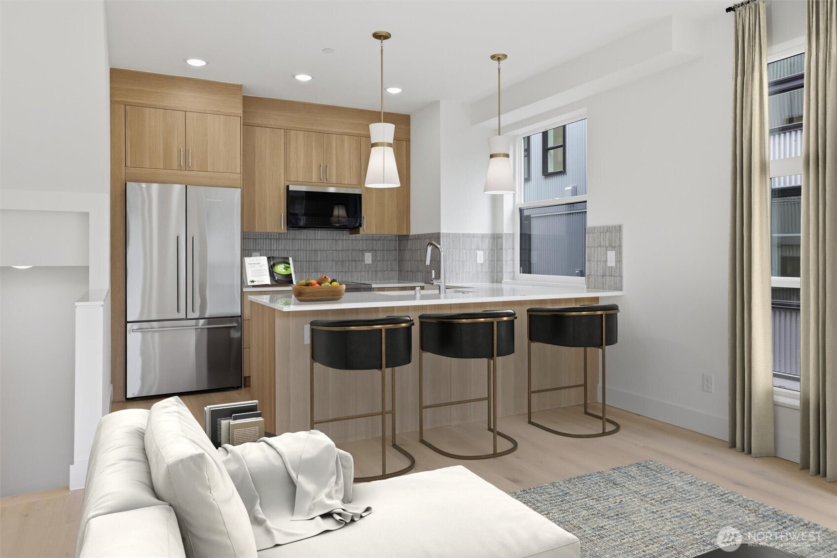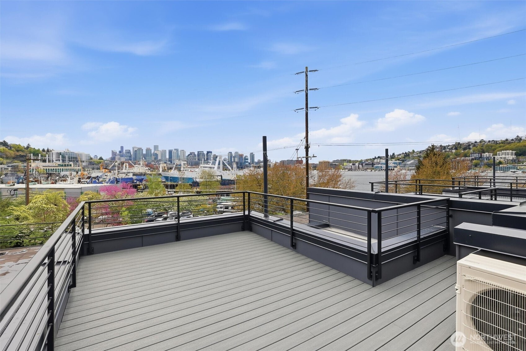 Positioned in the heart of Eastlake, this 2 bed, 2.5 bath residence at Harbor 26 offers 1,307 sqft of well-balanced living with a focus on comfort and function. The open-concept main level connects living, dining, and kitchen spaces seamlessly, finished with clean lines, modern materials, and a thoughtful, livable design. Both bedrooms are generously sized, each with its own bath, while a powder room on the main level adds everyday convenience. The primary suite is set apart with sweeping city views, bringing in natural light and creating a calm, elevated retreat above it all. Upstairs, a private rooftop deck extends your living space outdoors, capturing expansive views of Lake Union and the Seattle skyline—ideal for hosting or unwinding. Set within a gated community and complete with secured garage parking, this home offers a more refined, low-maintenance take on waterfront-adjacent living. Crafted by DEP Homes Eastlake, known for consistent quality and intentional design.