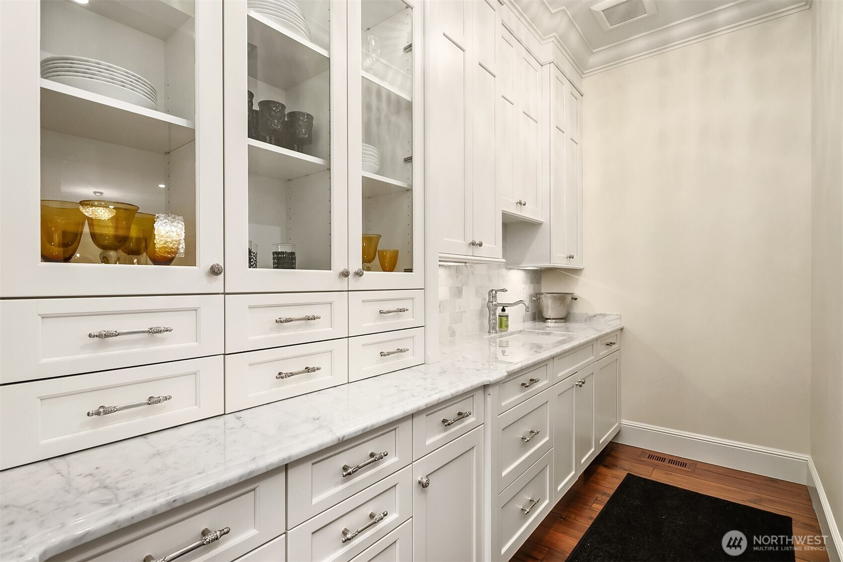 Exquisite and meticulously maintained, this like-new 2014 custom home seamlessly blends timeless Broadmoor elegance with sophisticated, tech-forward living. Designed for exceptional entertaining, the main level offers gracious and inviting gathering spaces that open to a lush, verdant backyard. A chef’s kitchen is anchored by an expansive island and appointed with marble countertops, top-tier Sub-Zero and Wolf appliances, a walk-in pantry and a fully equipped butler’s pantry ideally located off the dining room. A richly wood-paneled office with floor to ceiling bookshelves and an adjoining wine room adds warmth and character. The luxurious main-floor primary suite is a lovely retreat, featuring a five-piece bath and an expansive walk-in closet designed for exceptional organization. An efficient mudroom with laundry and ¾ bath offers convenient access from the exterior portico and rounds out the main floor. Upstairs, a casual rec room with wet bar and a private fitness room (or 3rd bedroom on this floor) create a true resort-caliber experience. Two additional ensuite bedrooms, a 2nd laundry room, and generous storage complete the upper level. The detached two-car garage features a golf cart garage, dedicated shop area and ~900sf of beautifully finished living quarters above with one bedroom, a full bath, kitchen and living space. Located within Seattle’s premier gated community, this exceptional residence delivers serene luxury on one of Broadmoor’s most coveted streets.