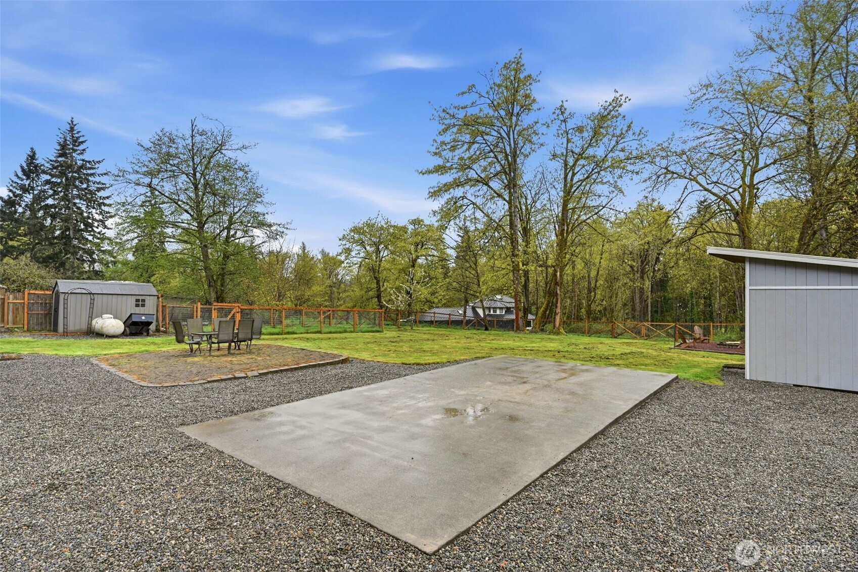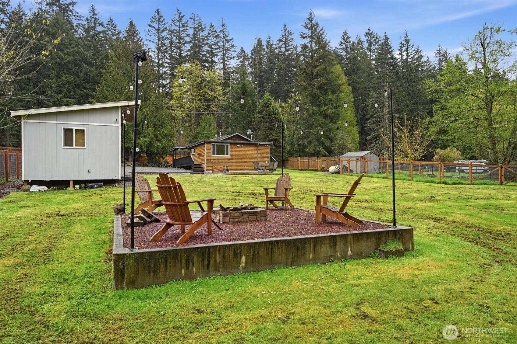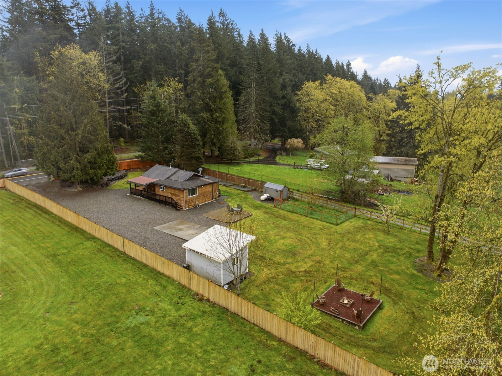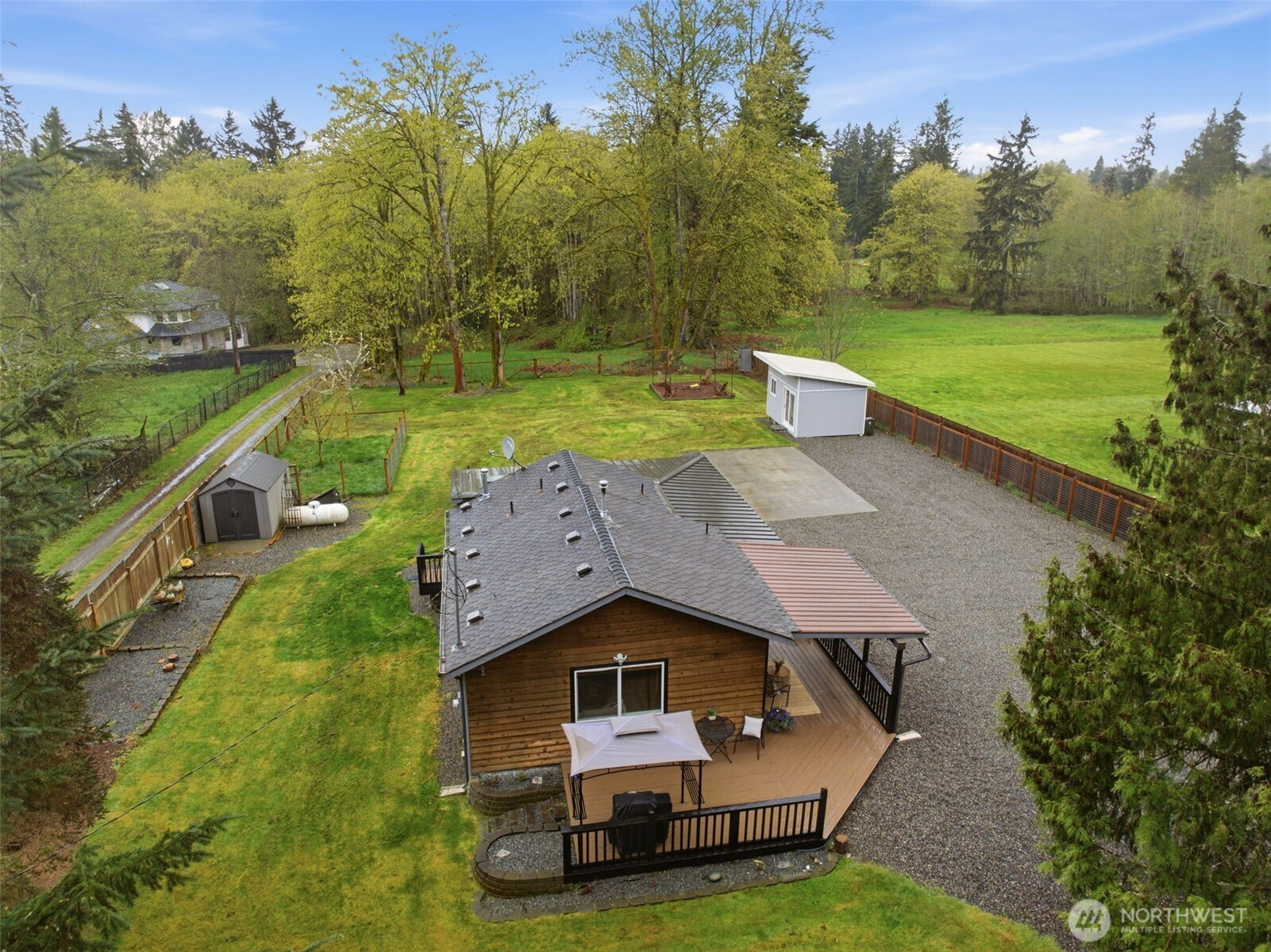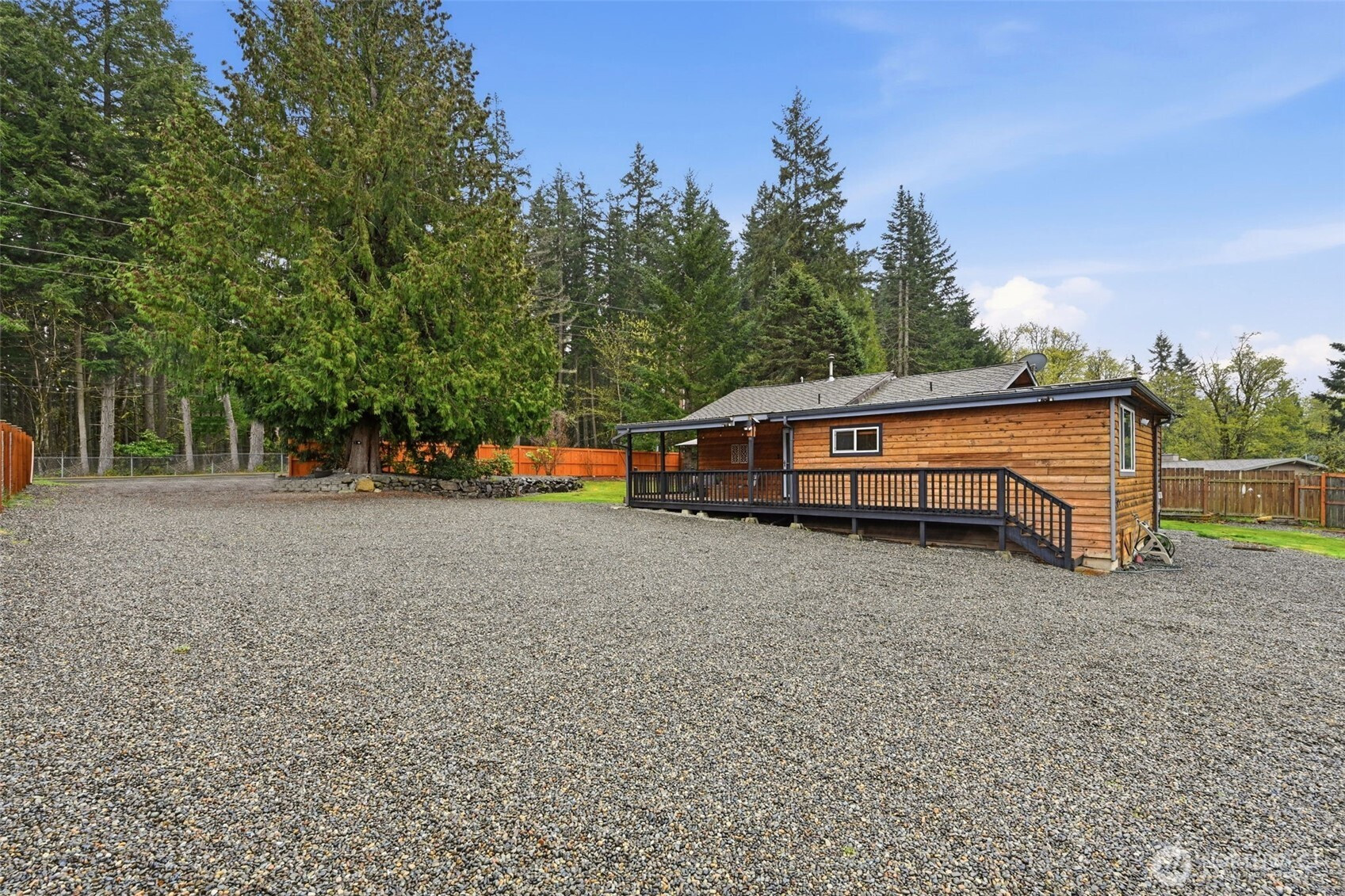 Welcome to your cozy cabin in the city. Wrapped in cedar siding and framed by towering evergreens, this 2-bed, 1-bath Kent retreat sits on 1.463 acres across two separate tax parcels — room to spread out and still have green space to spare. The covered wraparound deck with exposed beam ceiling and string lights sets the tone instantly — whether it's morning coffee, an evening around the fire pit, or simply soaking in the peaceful surroundings. The fully fenced backyard offers room to roam, the expansive gravel lot handles RV, boat, and trailer parking with ease, and a detached outbuilding adds storage or workspace. Inside, fresh LVP flooring, granite countertops, stainless appliances, a spa-inspired bath, and knotty pine barn doors make it warm and move-in ready. Immaculately maintained and lovingly cared for, every detail has been tended to. The pellet stove keeps you cozy all winter long. Steps from Lake Youngs Reservoir and miles of trails, yet minutes from shopping, dining, and commuter routes. Properties like this — truly one of a kind — rarely come to market. City convenience. Don't miss out on this one!