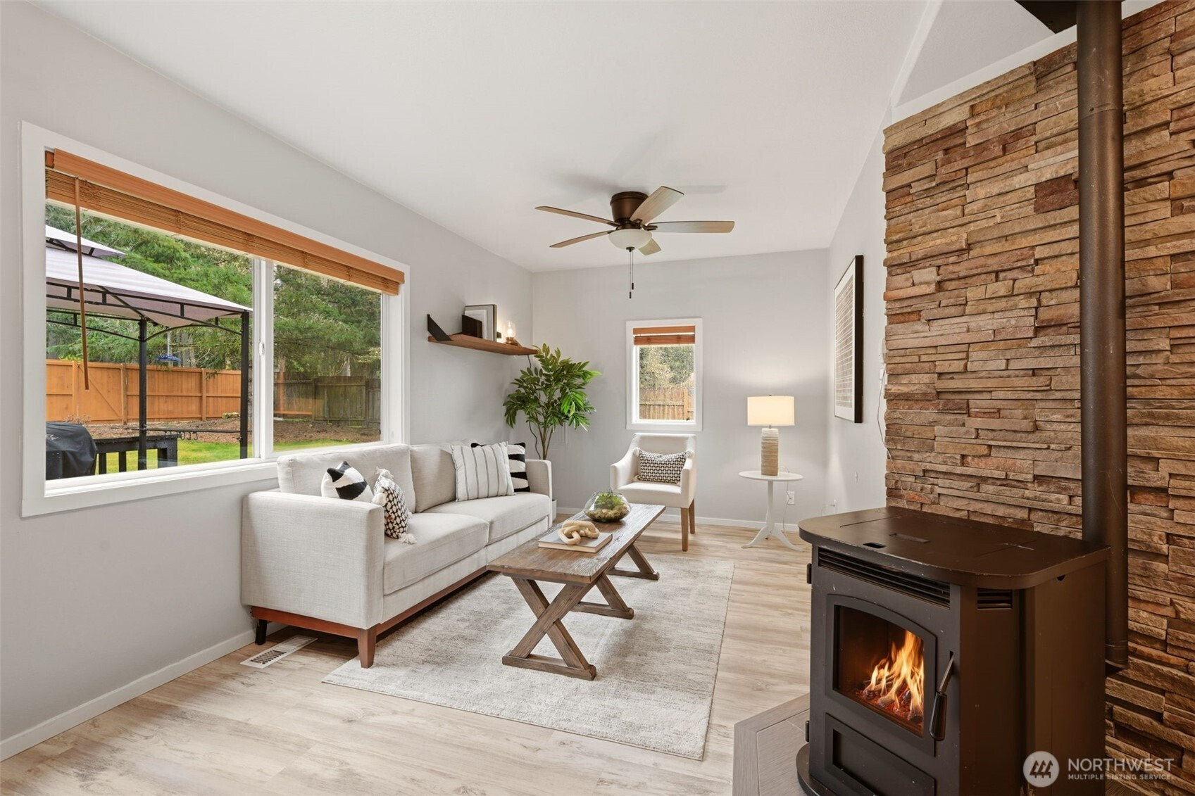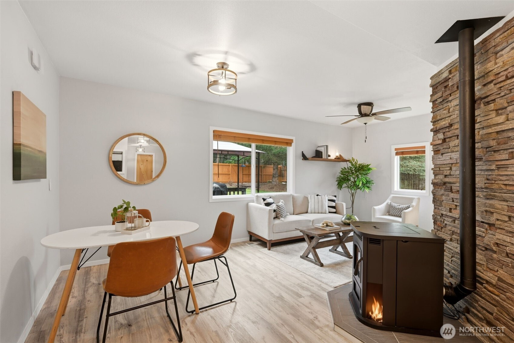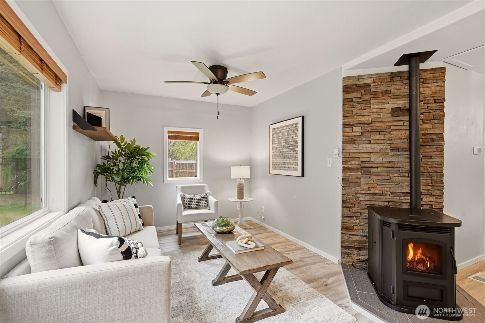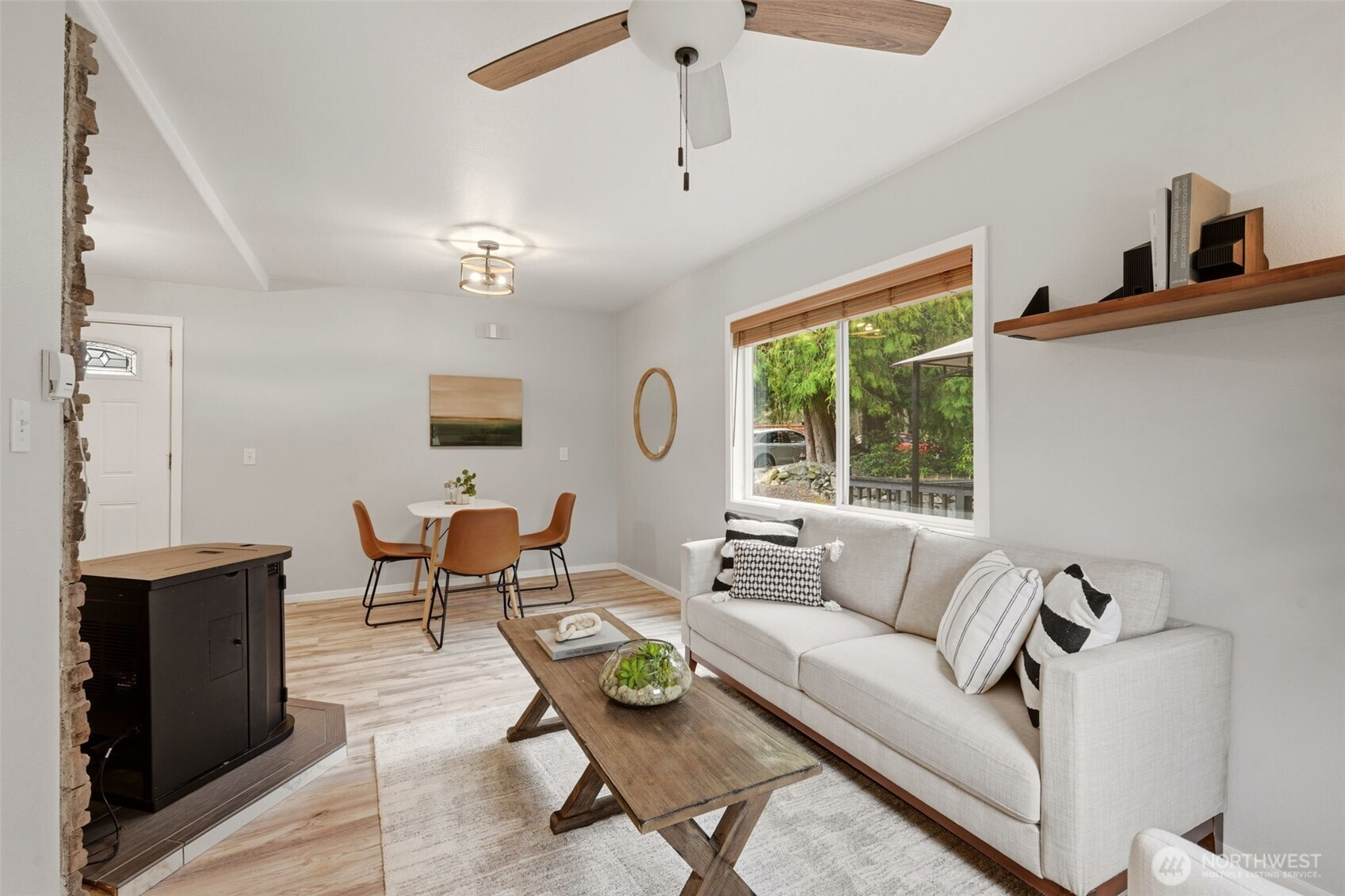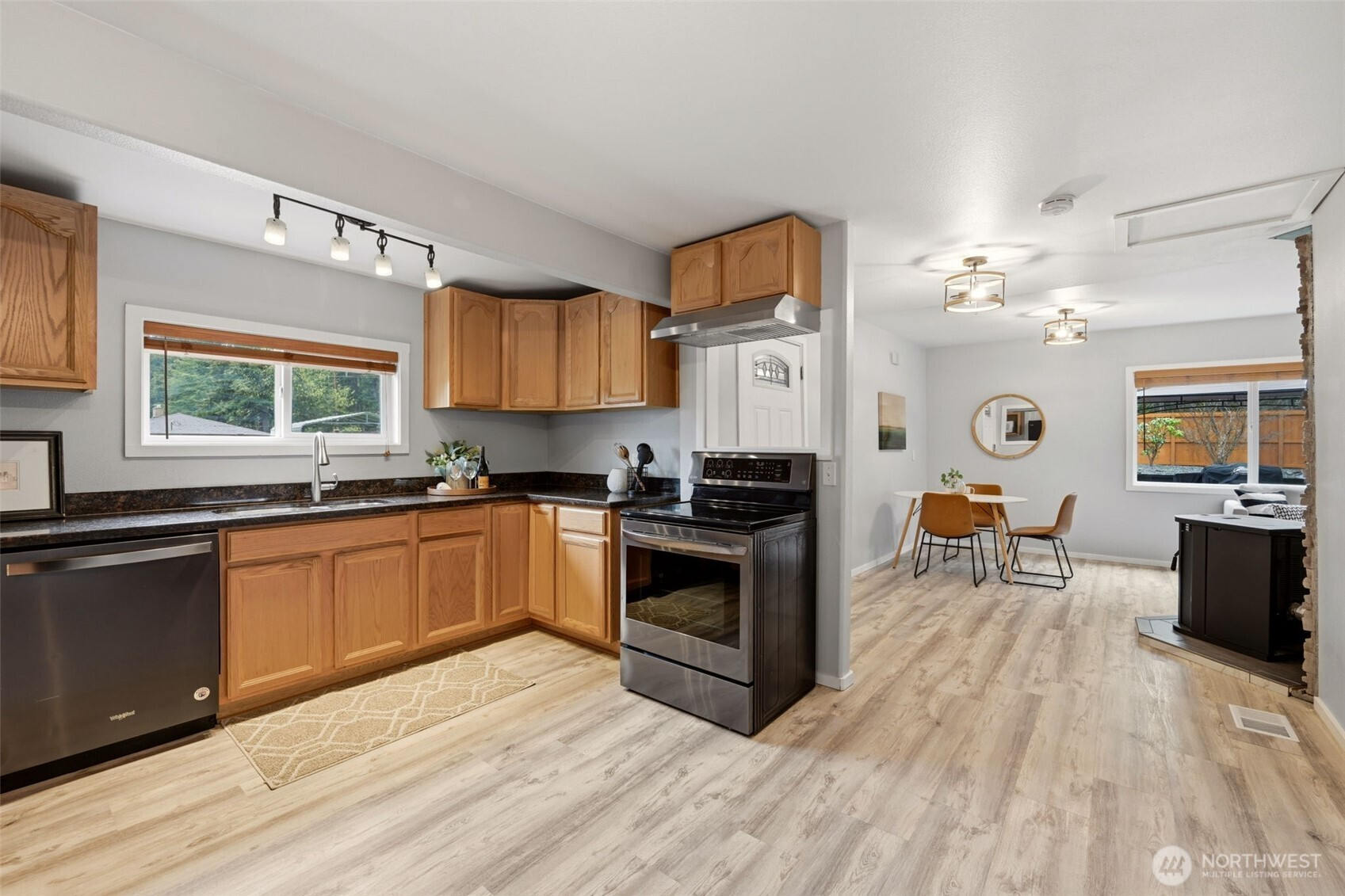 Welcome to your cozy cabin in the city. Wrapped in cedar siding and framed by towering evergreens, this 2-bed, 1-bath Kent retreat sits on 1.463 acres across two separate tax parcels — room to spread out and still have green space to spare. The covered wraparound deck with exposed beam ceiling and string lights sets the tone instantly — whether it's morning coffee, an evening around the fire pit, or simply soaking in the peaceful surroundings. The fully fenced backyard offers room to roam, the expansive gravel lot handles RV, boat, and trailer parking with ease, and a detached outbuilding adds storage or workspace. Inside, fresh LVP flooring, granite countertops, stainless appliances, a spa-inspired bath, and knotty pine barn doors make it warm and move-in ready. Immaculately maintained and lovingly cared for, every detail has been tended to. The pellet stove keeps you cozy all winter long. Steps from Lake Youngs Reservoir and miles of trails, yet minutes from shopping, dining, and commuter routes. Properties like this — truly one of a kind — rarely come to market. City convenience. Don't miss out on this one!