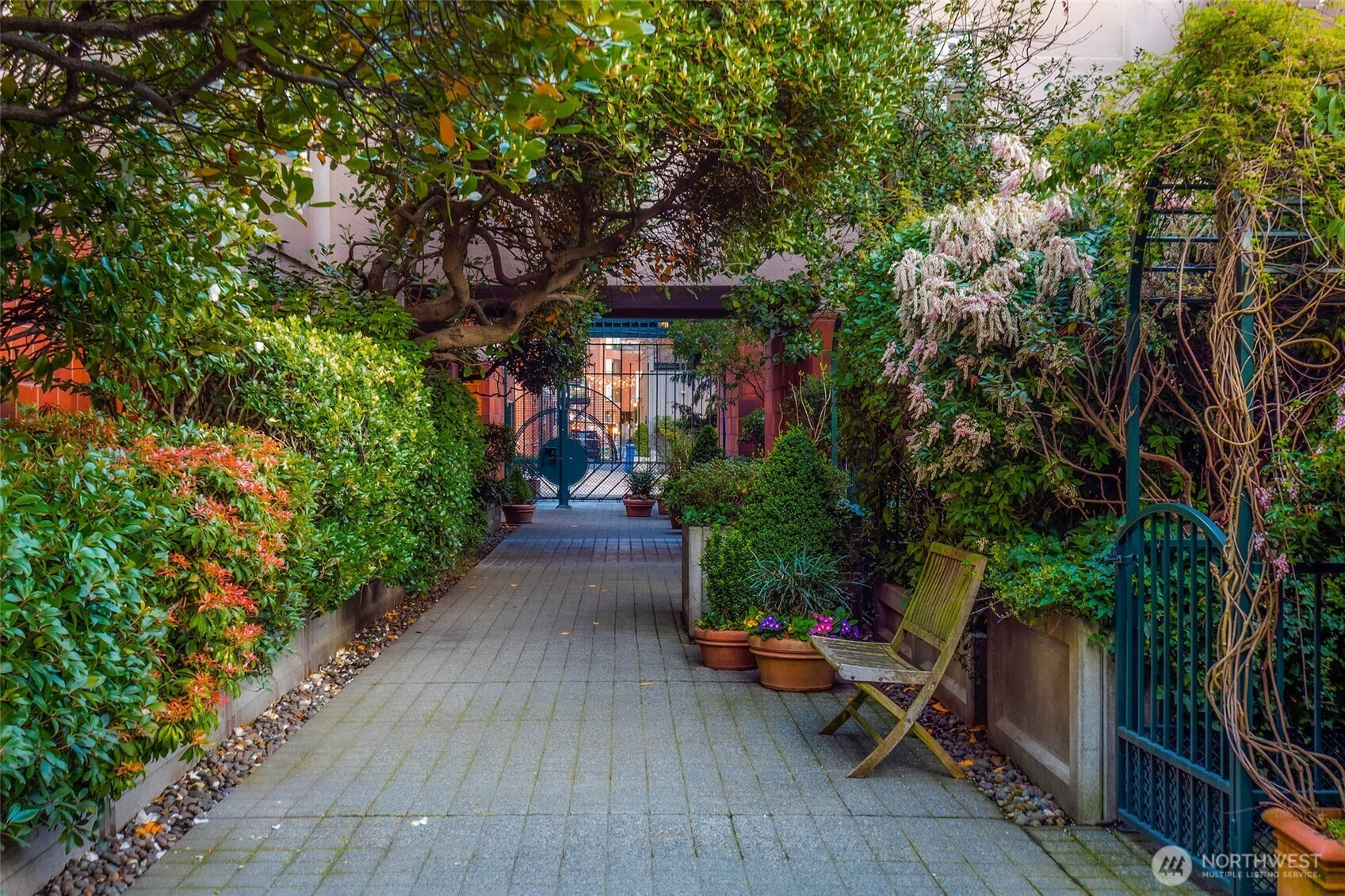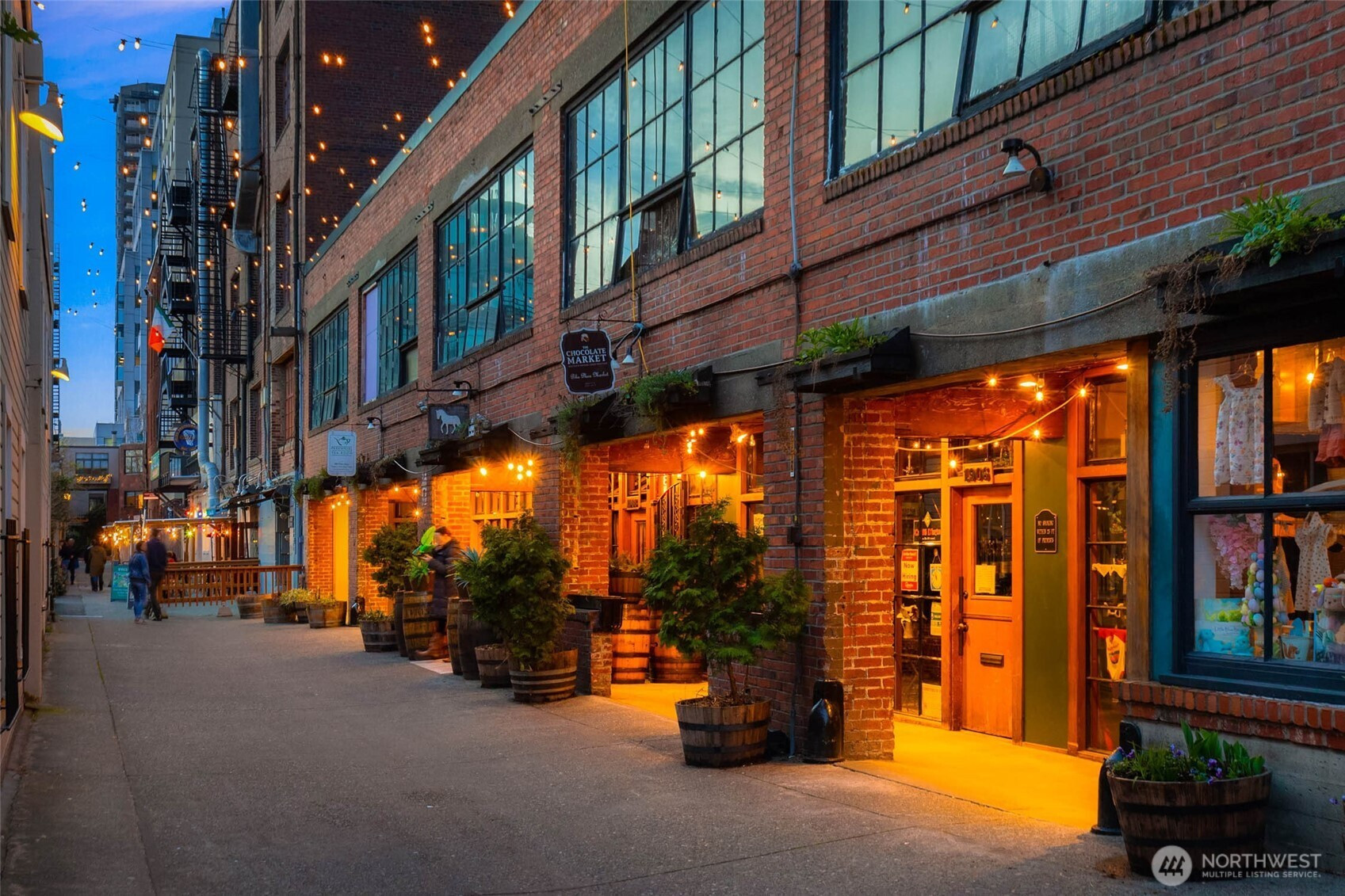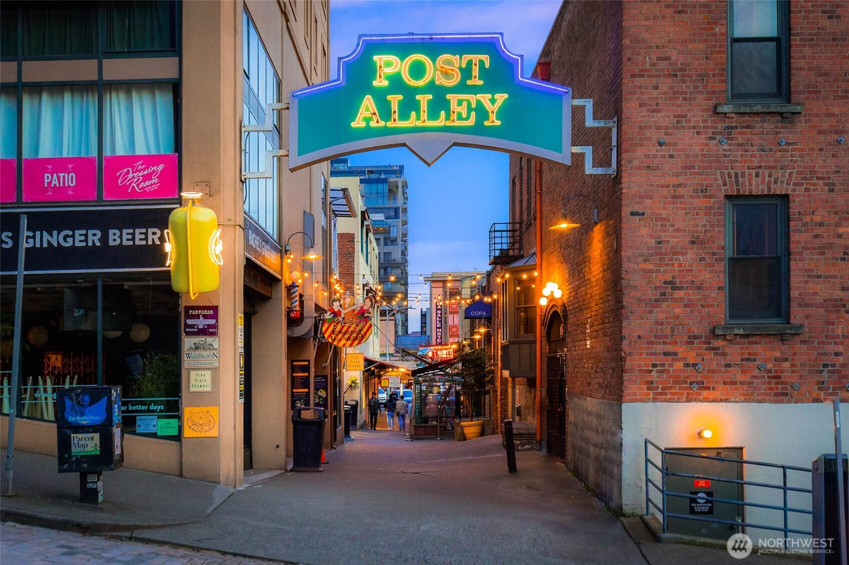 Tucked behind a secret Pike Alley entrance, this rare top-floor corner residence is a true in-city oasis—offering privacy, light, and iconic Seattle energy just outside your door. Set within one of Seattle’s most coveted buildings, tall airy ceilings, floor-to-ceiling picture windows, a skylight, and a rare wood-burning fireplace create a warm, elevated retreat, while French doors lead onto the private lanai, welcoming in the ocean breeze and capturing sweeping views of the Sound, glowing sunsets, and passing ferries. The spacious kitchen features abundant cabinetry and storage throughout, complemented by an in-unit washer and dryer and thoughtful extras like a garbage chute just down the hall. Enjoy deeded secure garage parking with a private EV charger, a secure storage unit, concierge entry, and exclusive access to a serene building patio with fountain and private Post Alley access. With Pike Place Market steps away, restaurants and pubs at the base of the building, walkable access to LINK light rail, and effortless strolls to parks, the waterfront, and all of downtown, this home delivers rare tranquility in the heart of it all. Building is FHA approved, and a lender credit is available for qualified buyers.