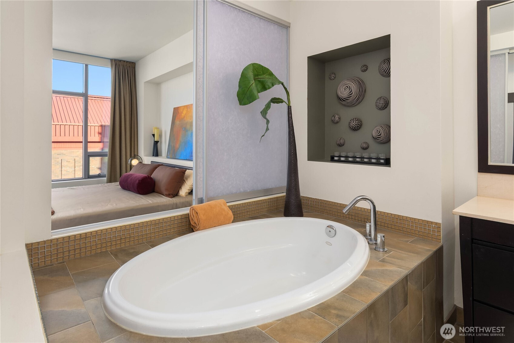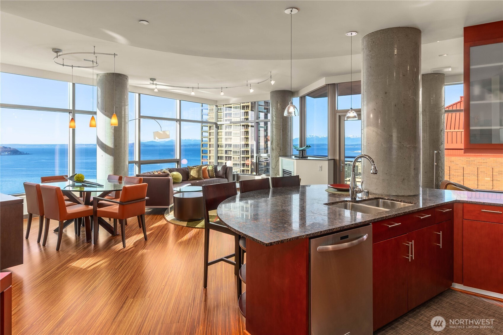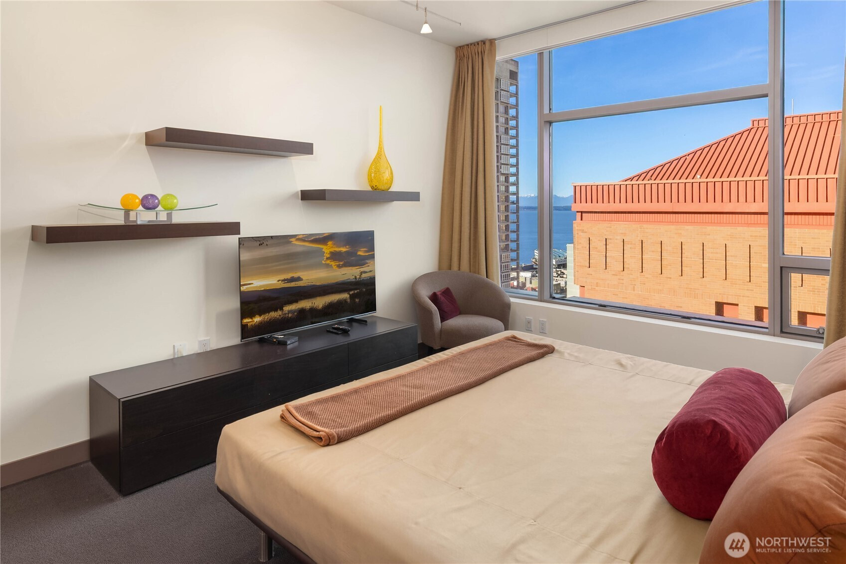 Sitting high above the city, enjoy snowcapped Olympic Mountains with Puget Sound as a foreground with ferries skimming across the water, cruise ships in port, and the brilliant Seattle Great Wheel. This Vibrant NW corner will delight with floor to ceiling windows to allow the sun to shine in. Large view deck off the living area to enjoy the fresh breeze. Custom Den area blends in perfectly in the living area. Stunning master bedroom with soaking tub will not disappoint. Second bedroom with sweeping views as well. Two parking spaces - EV ready, with a storage unit conveniently next to them. Cristalla amenities: rooftop deck w/BBQ, private seating areas, dog area, full gym, hot tub, sauna, steam room, lounges, business center, & 24/7 concierge service. All this above the city with a full range of lifestyle with the waterfront, Pike Place Market, the Amazon Spheres, shops, and world class restaurants to enjoy.