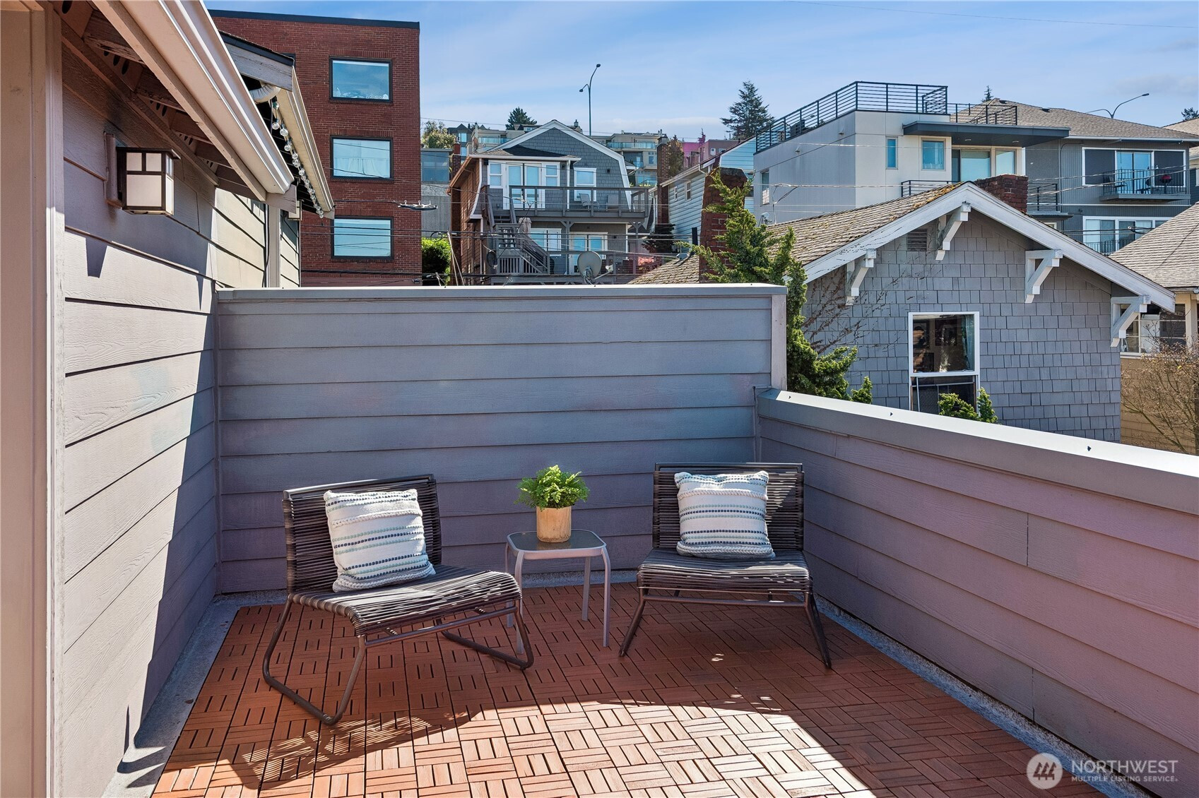 A rare Eastlake find that feels like a private retreat. Tucked along one of the neighborhood’s most coveted streets, this in-city cottage-style townhouse blends charm, function, and an unbeatable location. Inside, hardwood floors, designer tile, A/C and a bright, efficient layout make the home live larger than expected. The main-level bedroom is its own private escape with an en-suite bath, brand new stacked washer and dryer, and direct access to a fully fenced backyard with a treehouse feel, low-maintenance landscaping, and storage shed. Upstairs, the stylish kitchen features slab granite countertops, stainless steel appliances, a newer dishwasher, updated sink hardware, and a new garbage disposal, all flowing seamlessly into the living and dining areas, plus a convenient half bath. The top level offers flexible loft space ideal for a home office, guest space, or creative setup. Bathrooms have been thoughtfully refreshed with newer toilets. Finish the day on the rooftop deck with peekaboo Lake Union and city skyline views. Off-street parking with alley access adds everyday ease, while the location puts you just steps from Eastlake favorites, Lake Union, and quick access to South Lake Union, downtown, and UW. Pre-inspected for added peace of mind. No HOA!