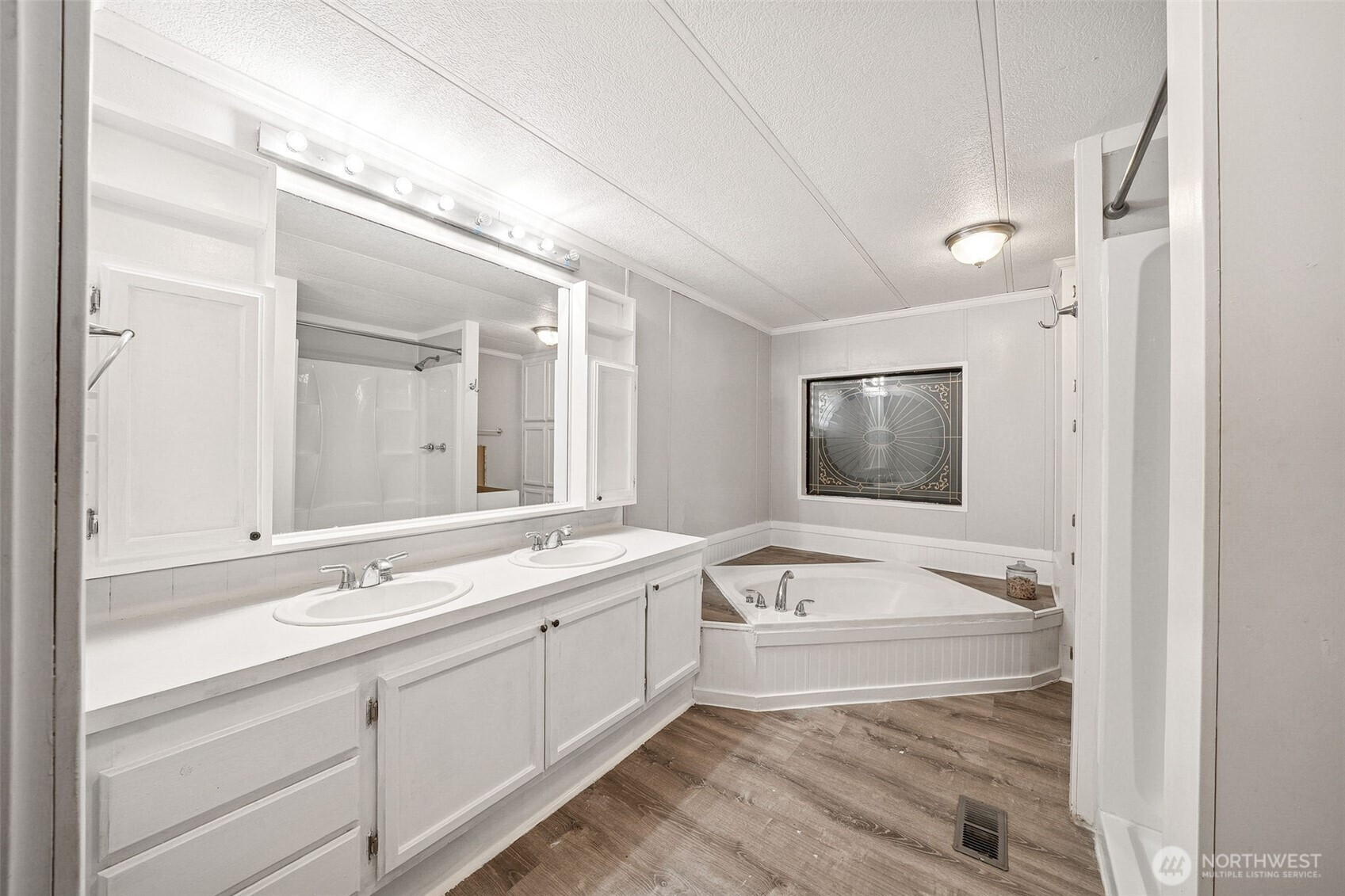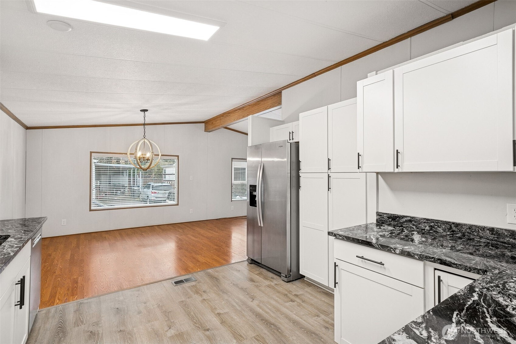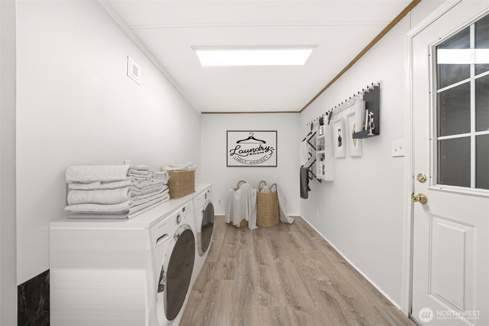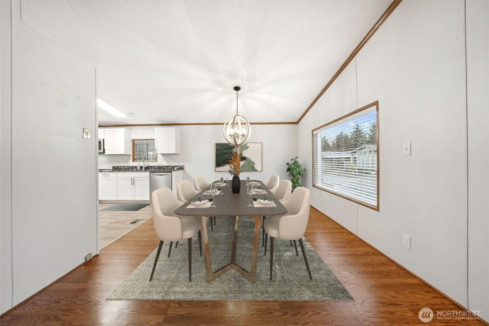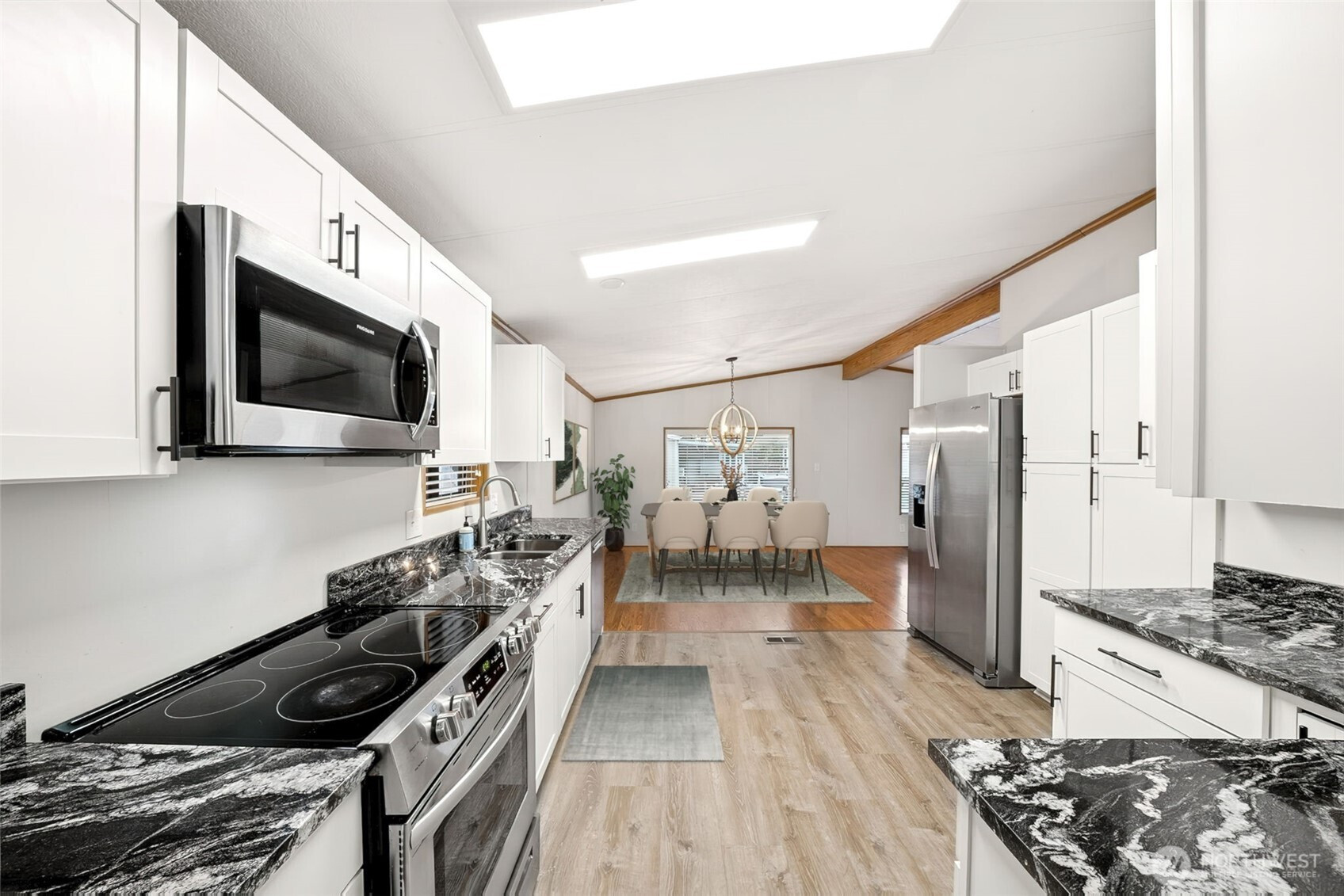Lovely 2Bed/2Bath remodeled home located in the all-ages community of Mountain Meadows Park. A gourmet kitchen steals the show w/ tasteful white shaker cabinets, granite countertops, and stainless steel appliances. Enjoy an open floor plan w/ vaulted ceilings & durable laminate flooring throughout. Primary suite offers a five-piece bathroom & walk-in closet. Updated second bath w/ quality finishes. Oversized utility room. Attached 2-car carport w/ dedicated storage space. Good-sized fenced backyard. Updated plumbing, wiring & hot water heater. AC for year-round comfort. Desirable neighborhood w/ a private park & clubhouse - all within steps of the Foothills Trail, local schools & charming downtown Enumclaw. This is affordability with style!