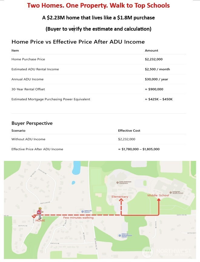 Two Units, One Price! Rare 6,000+ sqft estate with a fully functional private ADU in a prime Redmond location. Priced at only $370/sqft, perfect for multigenerational living, guest accommodations, or rental income (~$2,500/month, potentially offsetting up to $500K in mortgage payments, buyer to verify). Just an easy 8-minute walk to public schools and The Bear Creek School. The main residence features 4 bedrooms plus a spacious bonus room, soaring ceilings with a dramatic 14-ft circular ceiling, expansive living areas, a dedicated home office, and an oversized 3-car garage. Nearly $200K in recent upgrades include a luxurious primary bath with whirlpool spa tub, updated secondary bathrooms, refinished kitchen cabinetry, new septic tank, and refreshed landscaping. The private ADU offers its own entrance and parking, a full kitchen, living room, bedroom, plus a bonus room, laundry, and a separate heating system—perfect for extended living or rental income. Pre-inspected and move-in ready.