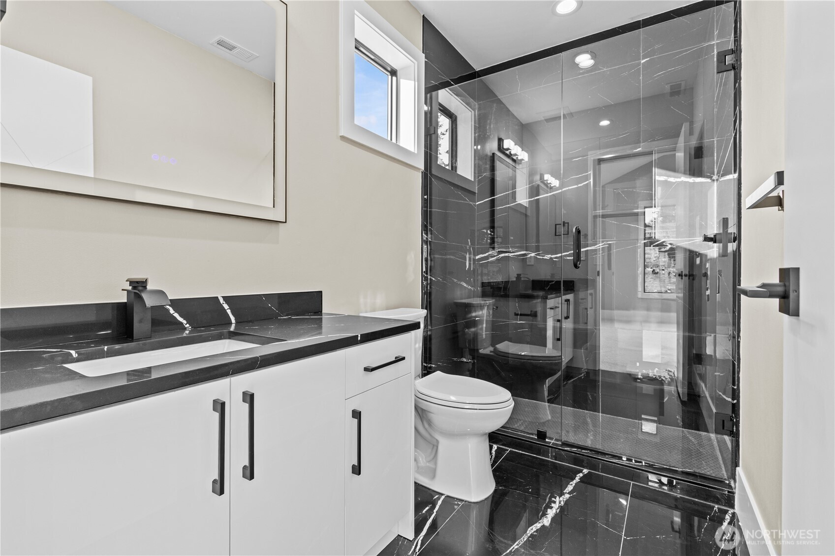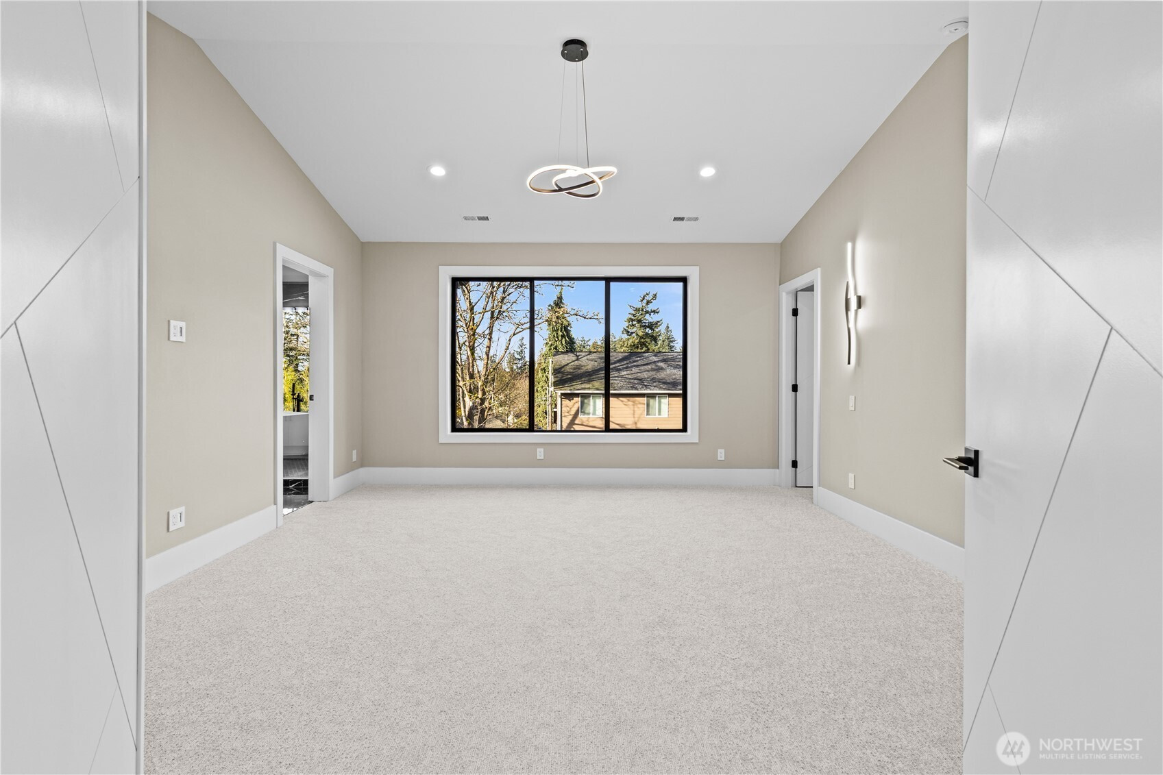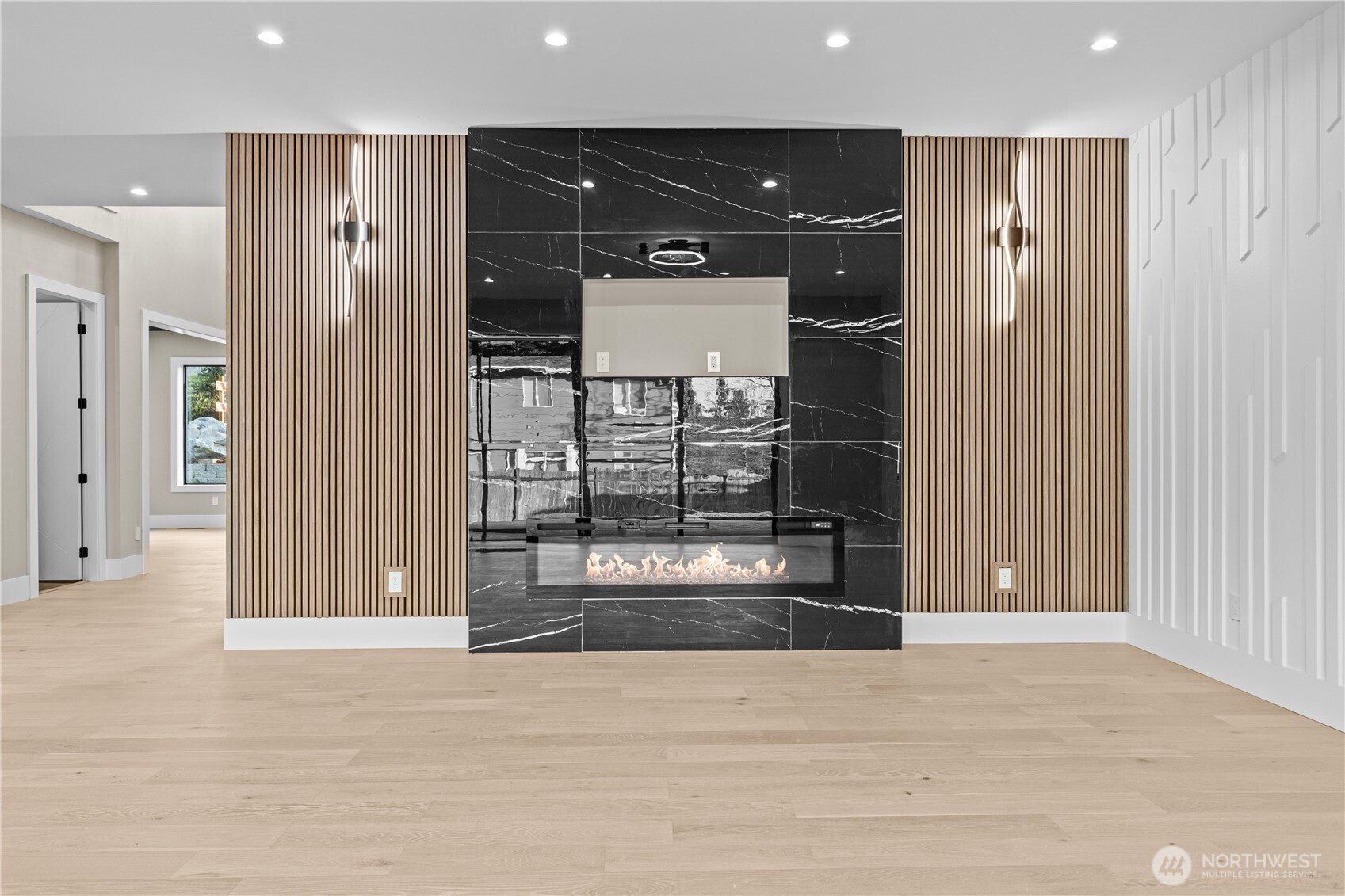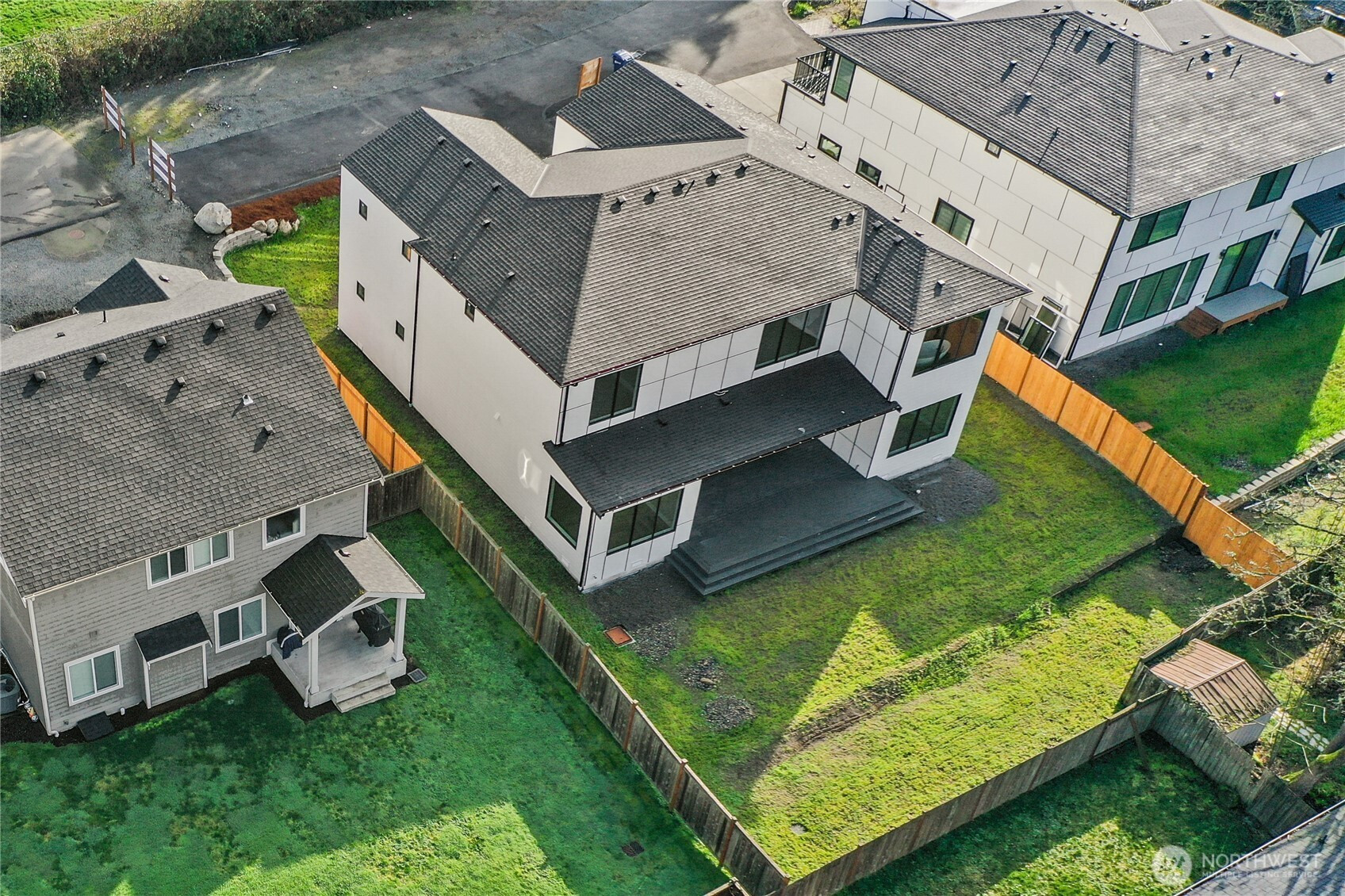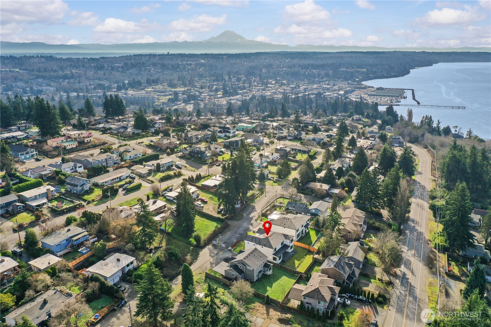 Be the first to call this newly constructed Modern European home yours. This rare custom new construction sits in the highly sought after North Hill community, offering street views of the beautiful Puget Sound. Thoughtfully crafted with lavish finishes and innovative functionality, this home delivers elevated luxury at every turn. Featuring 5 bedrooms and 4.5 bathrooms, the layout includes two primary suites with vaulted ceilings, a full suite on the main floor, custom luxury designs, a large covered deck, and a fully fenced backyard—plus much more. Step into a grand open foyer highlighted by sleek glass railings and striking black-on-black windows that flood the home with extraordinary natural light. The open layout flows into the great room, showcasing custom wall detailing, accent lighting, a polished tile fireplace, and a dramatic 16-foot sliding glass door leading to the covered deck and spacious backyard. The chef’s kitchen impresses with a walk-in pantry, crisp white cabinetry contrasted by bold black countertops, and a stunning waterfall island. Upstairs, warm engineered hardwood transitions into plush carpeting, leading to a rare and grand primary bathroom featuring a curved double-sink vanity and a spa-inspired wet room with dual showers and an exquisite soaking tub. A true testament to elegance and timeless appeal, this home offers easy access to SR-509, I-5, Seattle, Tacoma, SeaTac Airport, Southcenter, and the Des Moines Waterfront.