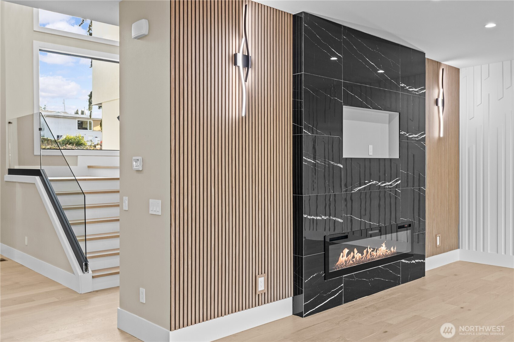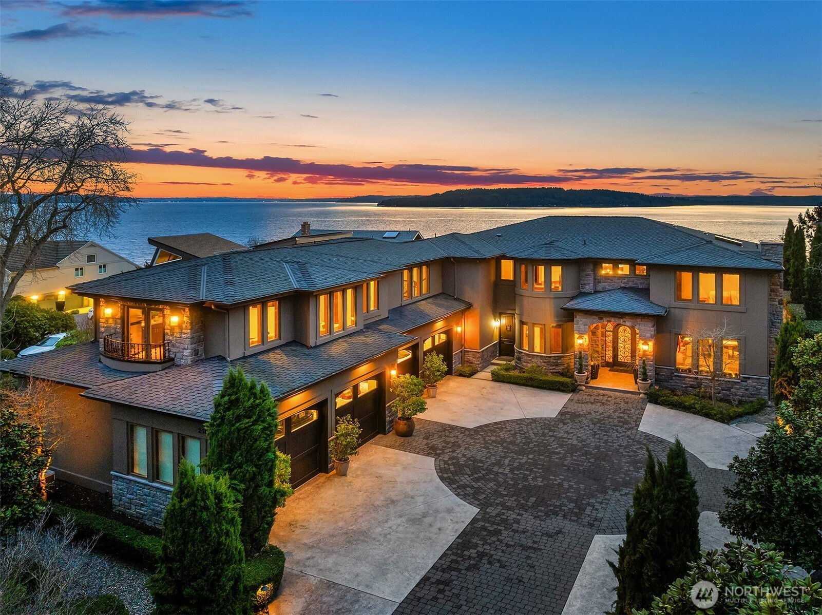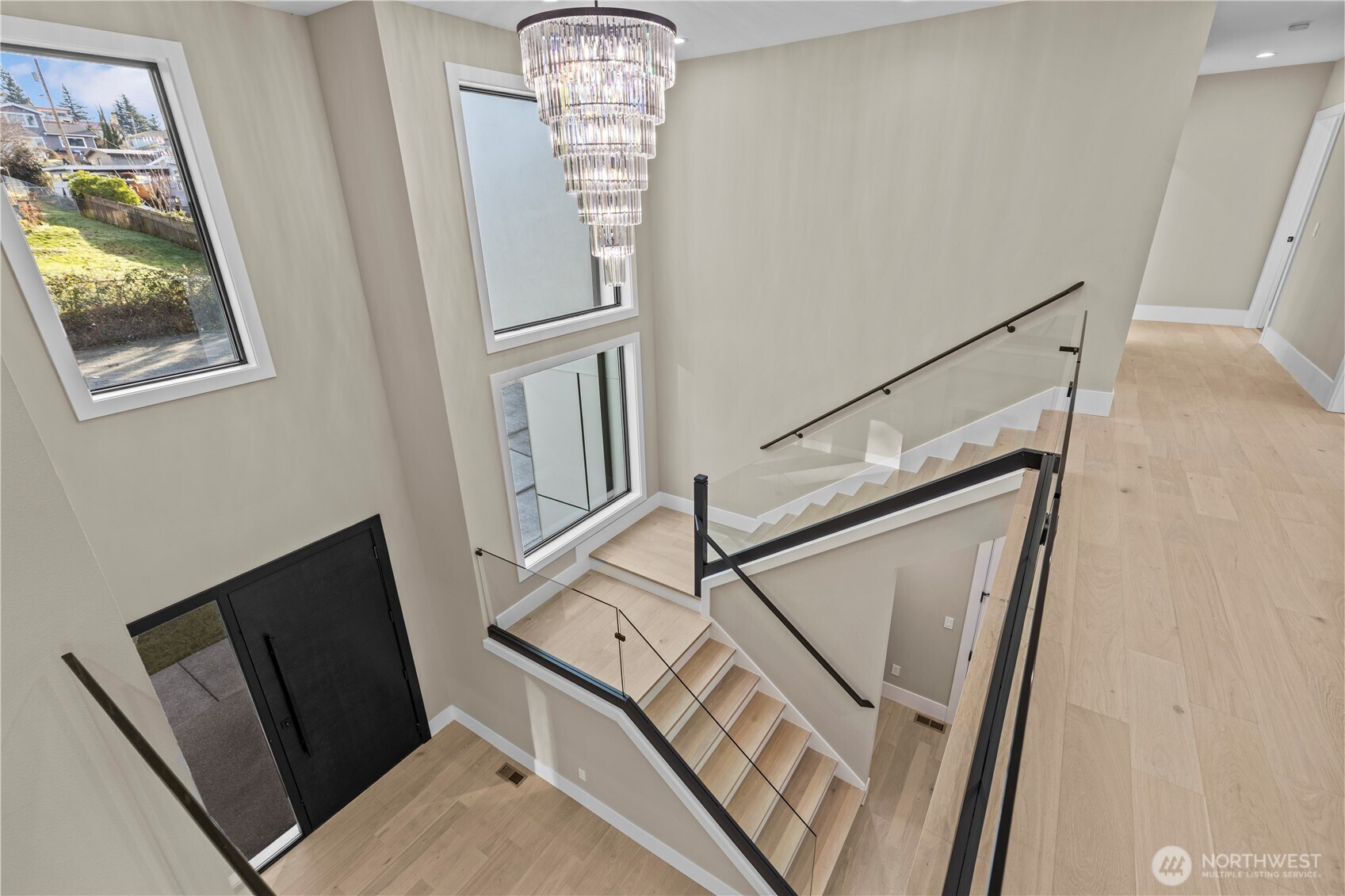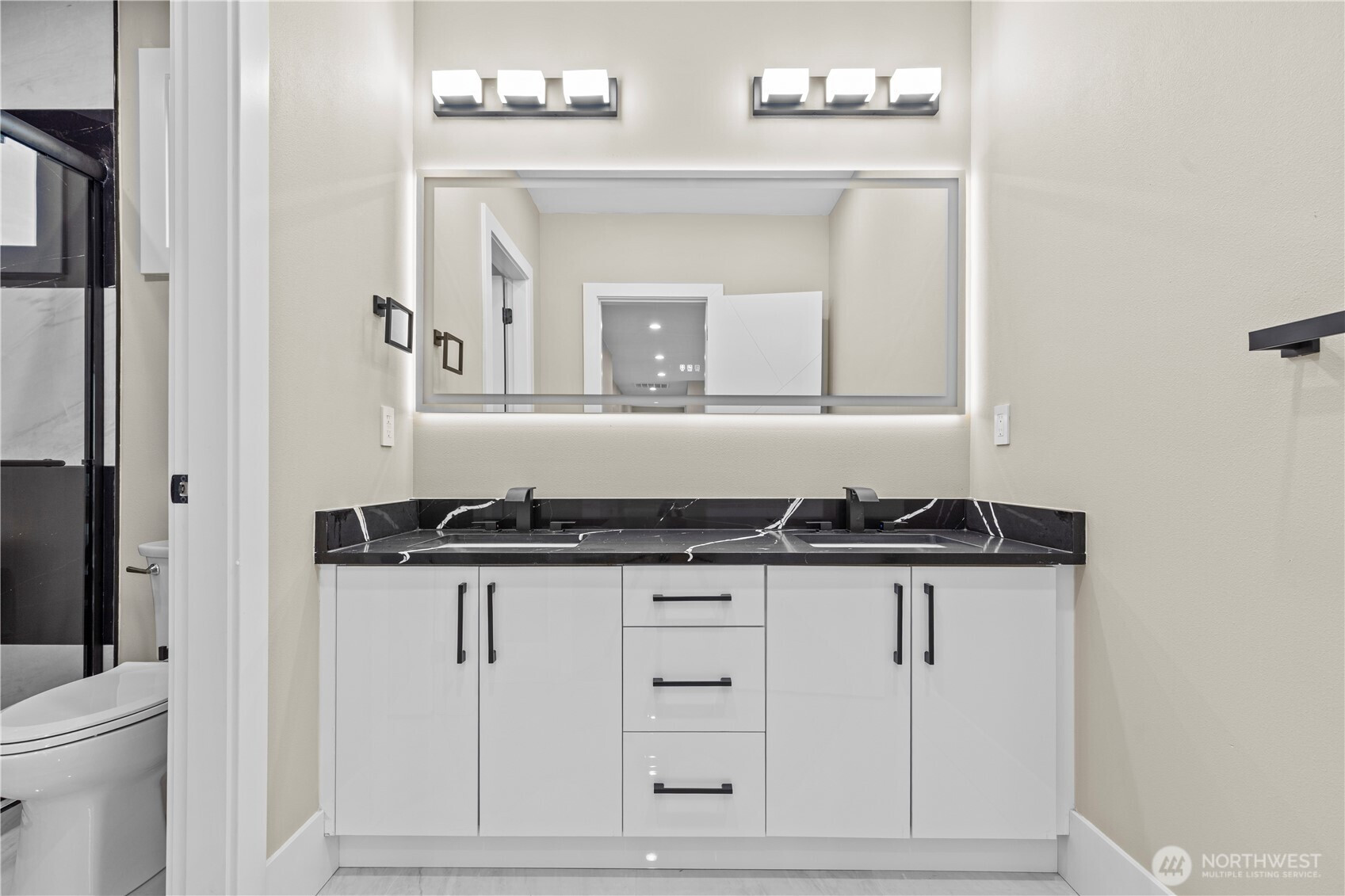 Be the first to call this newly constructed Modern European home yours. This rare custom new construction sits in the highly sought after North Hill community, offering street views of the beautiful Puget Sound. Thoughtfully crafted with lavish finishes and innovative functionality, this home delivers elevated luxury at every turn. Featuring 5 bedrooms and 4.5 bathrooms, the layout includes two primary suites with vaulted ceilings, a full suite on the main floor, custom luxury designs, a large covered deck, and a fully fenced backyard—plus much more. Step into a grand open foyer highlighted by sleek glass railings and striking black-on-black windows that flood the home with extraordinary natural light. The open layout flows into the great room, showcasing custom wall detailing, accent lighting, a polished tile fireplace, and a dramatic 16-foot sliding glass door leading to the covered deck and spacious backyard. The chef’s kitchen impresses with a walk-in pantry, crisp white cabinetry contrasted by bold black countertops, and a stunning waterfall island. Upstairs, warm engineered hardwood transitions into plush carpeting, leading to a rare and grand primary bathroom featuring a curved double-sink vanity and a spa-inspired wet room with dual showers and an exquisite soaking tub. A true testament to elegance and timeless appeal, this home offers easy access to SR-509, I-5, Seattle, Tacoma, SeaTac Airport, Southcenter, and the Des Moines Waterfront.
