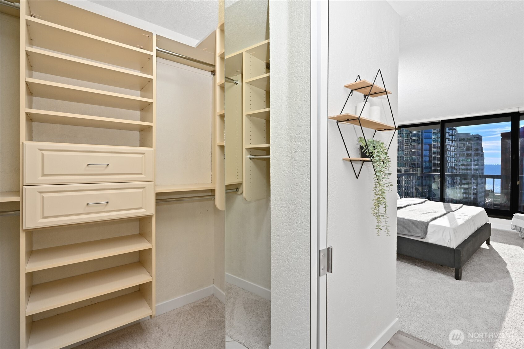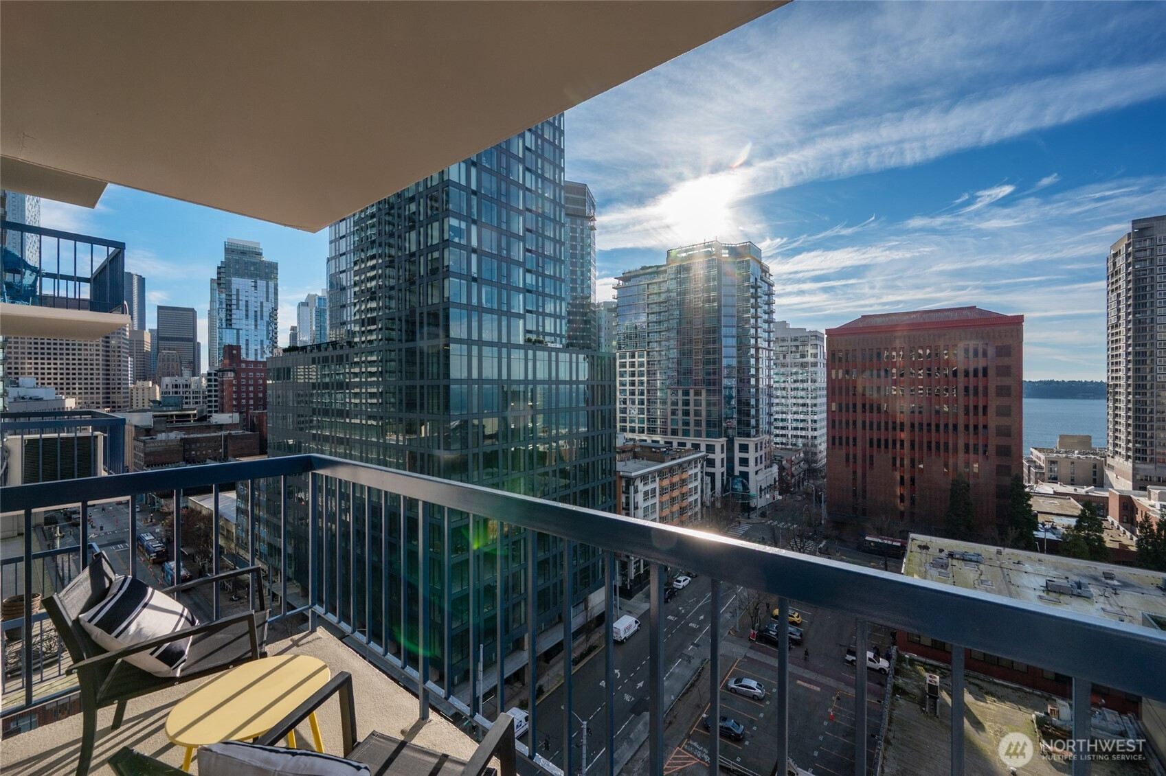 Step outside and you're in the middle of one of the most vibrant, walkable cities in the country. Step inside, and the city melts away into your own private sanctuary with unobstructed, protected views of Puget Sound, the Olympic Mountains, and the Seattle skyline. One of the best view values in the city, without question. This Belltown condo carries the lowest HOA dues per square foot in the neighborhood, with those dues covering all utilities, electricity and water included. Strong reserves and no special assessments. The westward exposure means the light builds beautifully through the day and gives way to unforgettable sunsets, all framed by floor-to-ceiling windows and two private balconies. Ferries, ships, wildlife, fireworks over the Sound, the Space Needle. The view is dynamic and ever-changing. The home is move-in ready and thoughtfully updated: air conditioning, in-unit washer/dryer, a large secure garage parking space with EV charging, and oversized private storage. Building amenities include a city-view pool, gym, sauna, and community room. Fully step-free from entry to unit, with effortless access to Pike Place Market, the waterfront, all stadiums, the Space Needle, and light rail. Everything Seattle has to offer is right outside your door.