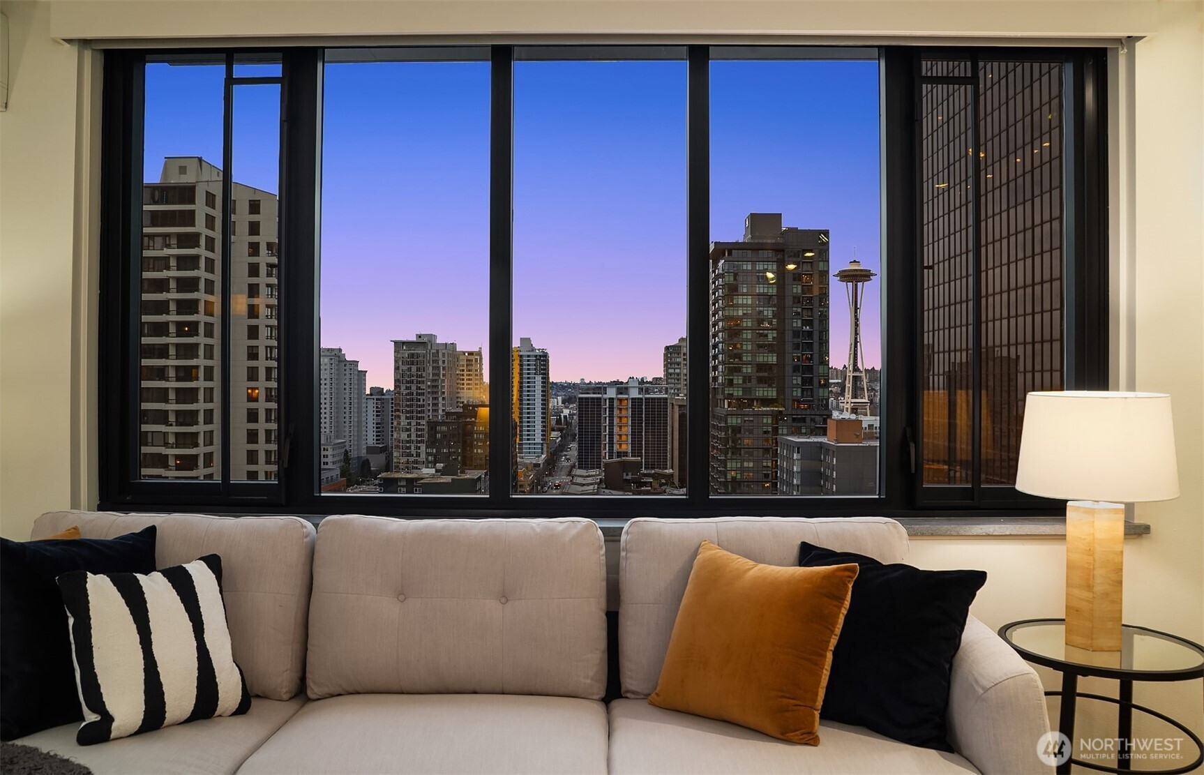 Wake up to sweeping northwest-facing views of Elliott Bay and the Space Needle from this cozy 17th-floor home—you won’t ever get tired of them. Both bedrooms soak in the scenery, including a primary suite where you can see Elliott Bay right from the bed. They face north, so they stay nice and cool in the summer, and the covered patio is perfect for relaxing or entertaining while watching ferries, sunsets, and the skyline. Inside, bamboo floors and recently updated, thick black-framed windows let in tons of natural light and give the place a clean, modern feel. The kitchen is separate from the living room, which makes entertaining easy, and there’s a defined dining area—great for dinner parties or everyday meals. Two bedrooms and two ¾ baths give you room for guests, a home office, or just everyday living. Mini-split A/C keeps it comfortable on warm days. Full-size parking and storage are included. The building only has 132 units, so it’s quieter and more private than the bigger towers, but you still get a pool and fitness center. Low-rise zoning nearby helps protect the water views. Walk to Amazon, Expedia, and other Seattle tech hubs, plus tons of restaurants, transit, and downtown spots. Bright, cozy, and thoughtfully updated—this is a home that’s ready for living, entertaining, and loving those views every single day. A rare downtown condo with the perfect mix of privacy, iconic views, and Seattle lifestyle.