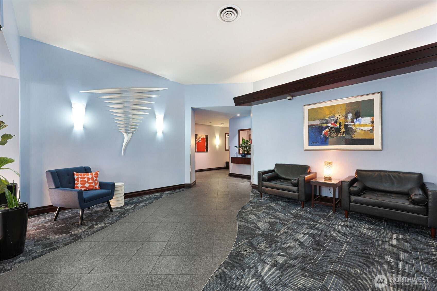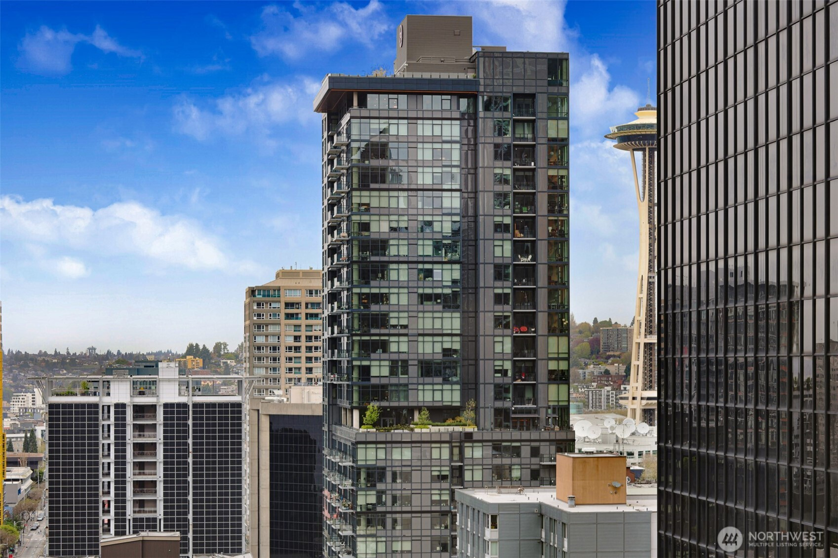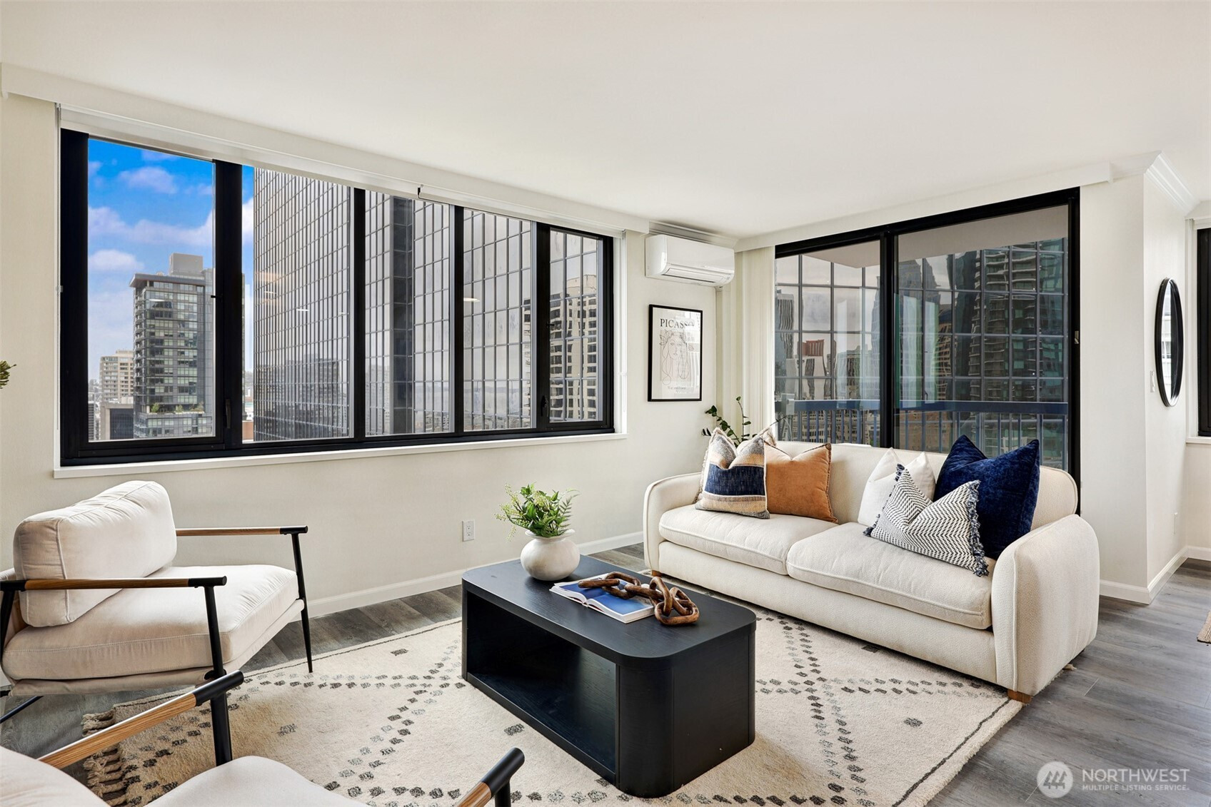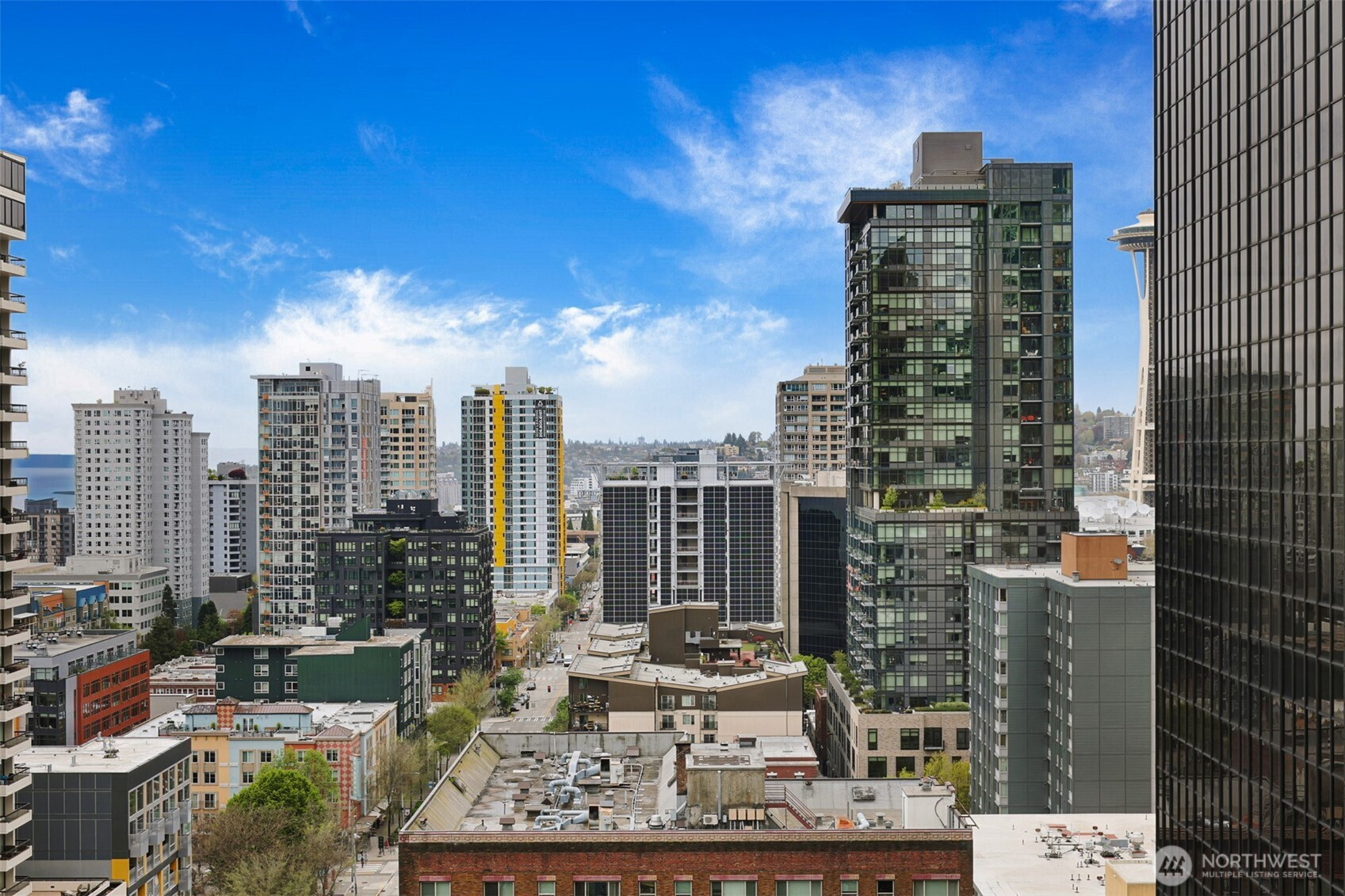 Fully renovated, close to all your favorite spots, with a water view - for under $400k?! Yes, and it can be yours! Perched 18 floors above the vibrant streets of Belltown, this corner unit takes the cake for being both stylish & livable without giving up affordability. Large windows frame fantastic views of Elliott Bay, the majestic Olympic Mtns, Bainbridge Island & stunning summer sunsets for quintessential Seattle vibes that never get old. Move in & be the first to break in this newly refreshed space: new flooring, newer windows, no popcorn ceilings, new bathroom vanity/fixtures/tile surround, all-new lighting, & an opened-up kitchen complete w/ quartz counters, quality wood dovetailed cabinetry, a roomy peninsula with bar seats & all-new fridge, dishwasher, range & powerful hood. Large east to northwest windows keep the space bright while mini-splits provide both heat & A/C to keep you comfortable. Fall asleep to sparkling city lights & the gentle glow of the Space Needle (viewed from bed!), then wake each day to soft morning light while the city comes to life below. Abundant closets throughout + storage unit in the basement included; bring your gear & your hobbies, there's room! ALL utilities included in monthly HOA dues - even electric & internet - plus access to Royal Crest's fitness center, lounge, sauna & seasonal outdoor pool. This quiet urban pad has the best of Seattle at its doorstep - be at the center of it all this summer!