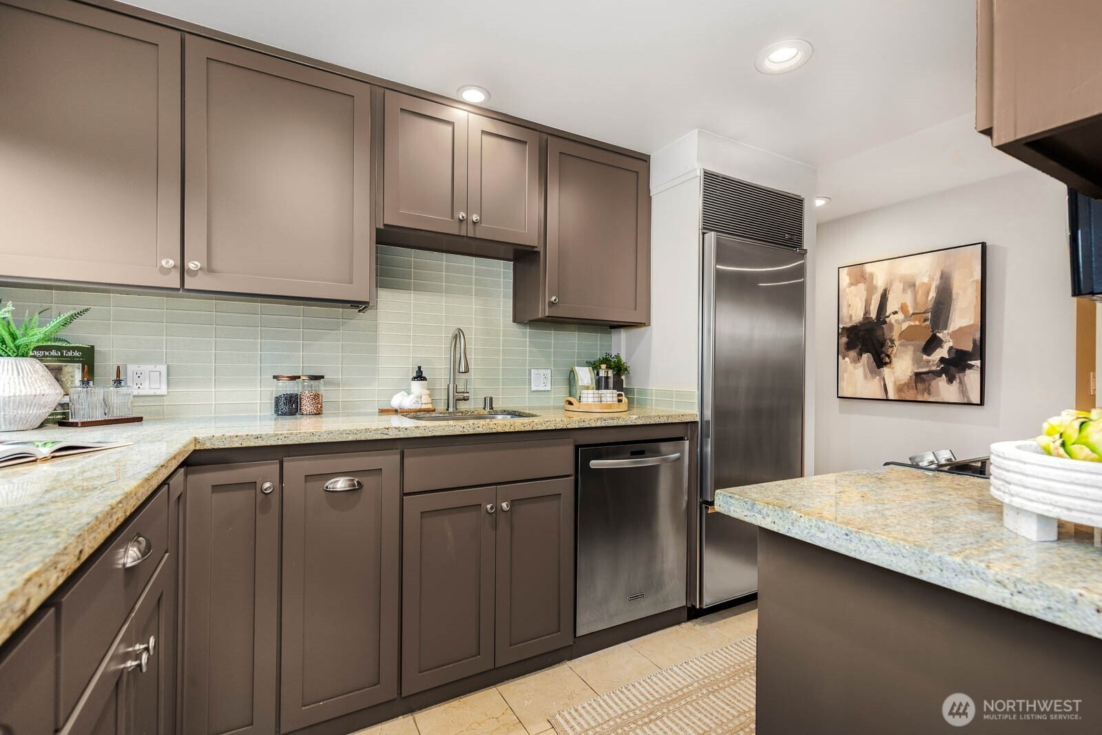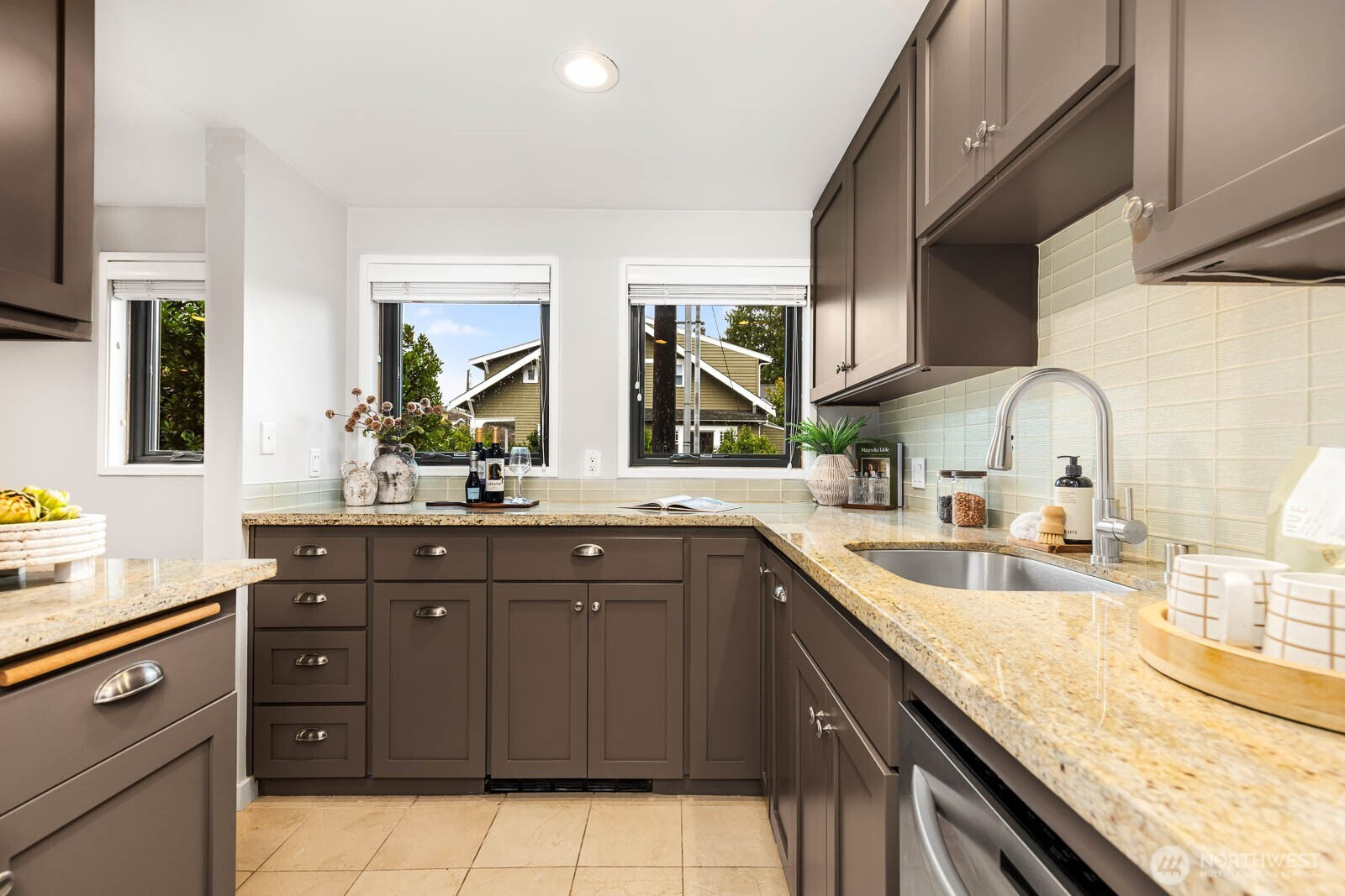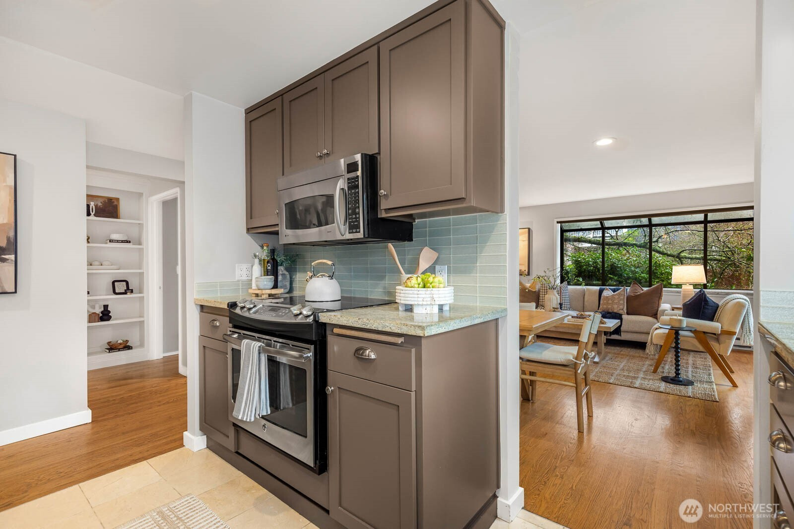 Delightful corner condo perfectly situated in the heart of Upper Queen Anne. Sun-drenched living room with expansive windows and a generous bay window frames serene greenery views. Contemporary kitchen shines with granite countertops, elegant backsplash, stainless steel appliances, highlighted by a Sub-Zero refrigerator. Rich hardwood floors flow throughout, complemented by a built-in bookcase, in-unit washer and dryer, generous closets, additional storage, and a dedicated parking spot. Open layout creates an inviting living and dining space ideal for everyday comfort and entertaining. Unbeatable walkable location to Queen Anne’s finest shops, cafes, parks, and amenities.